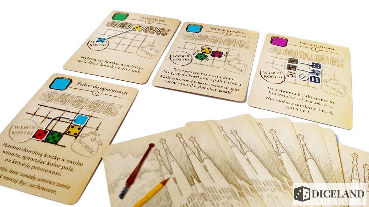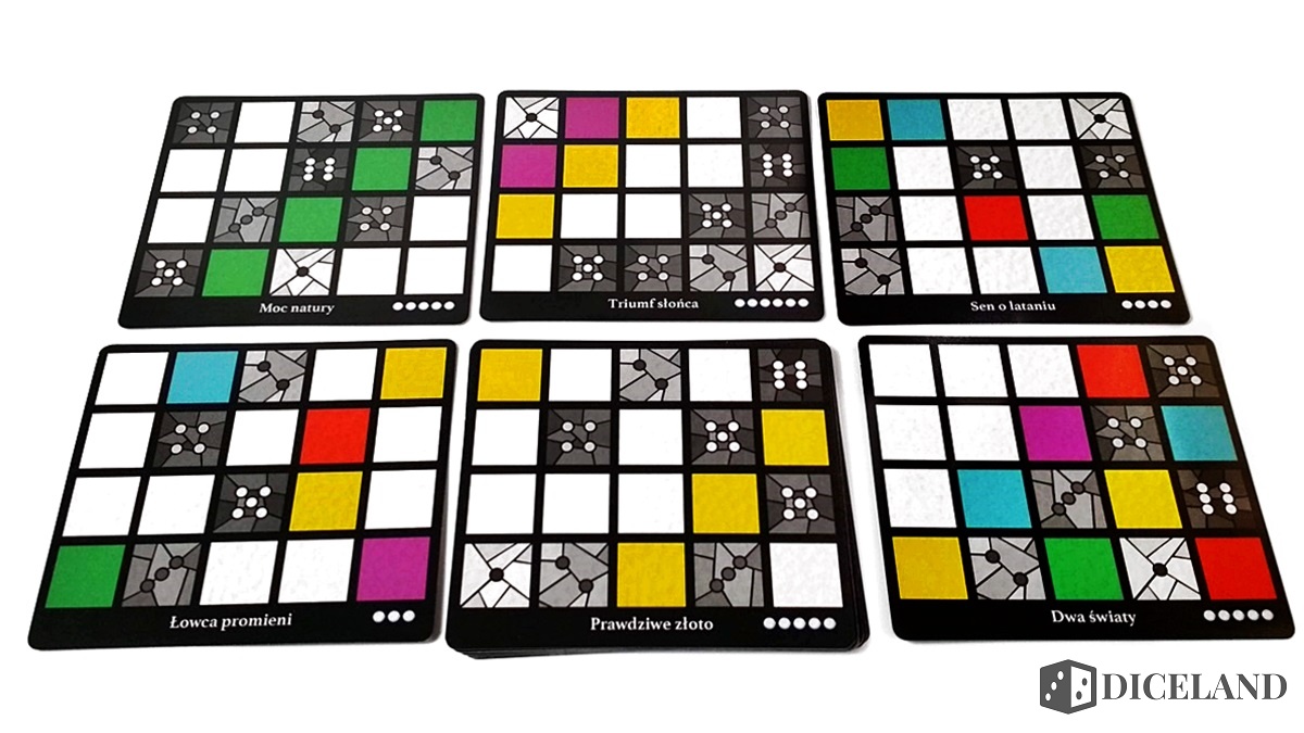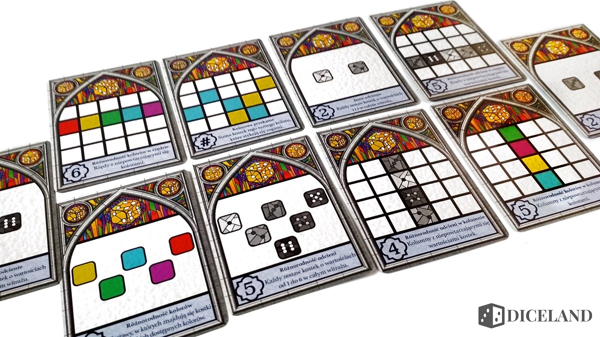 Karty wzorów, które wsuniemy pod nasze witraże, cechuje różny poziom skomplikowania. Im więcej białych kropek w rogu, tym trudniejsze zadanie przed nami. Przed rozgrywką otrzymujemy dwie takie dwustronne karty i wybieramy tylko jedną z nich. Z pomocą w trudnych chwilach przychodzą specjalne szklane znaczniki uznania, które posłużą do aktywacji kart narzędzi. Dodatkowo w opakowaniu znalazły się karty celów grupowych, indywidualnych i karta gracza rozpoczynającego.