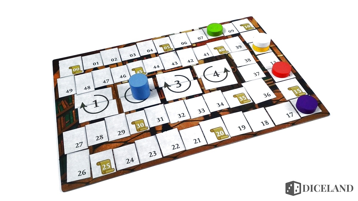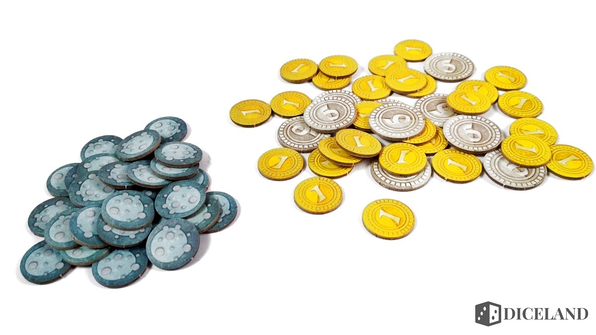 Monety oraz znaczniki przemijania zostały wykonane z tektury, jednak są dość dobrej jakości i na chwilę obecną nie zauważyłam żadnego uszczerbku podczas ich używania. Wyglądają one dość zwyczajnie, ale przez to dobrze wpasowują się w styl gry. Największym i zarazem ostatnim elementem jest tor punktacji, który na szczęście również wykonano z grubej tektury. Jest to jeden z najzwyklejszych i najmniej atrakcyjnych komponentów. Zrobiony trochę w starym planszówkowym stylu, według mnie odrobinę graficznie odstaje od całokształtu.