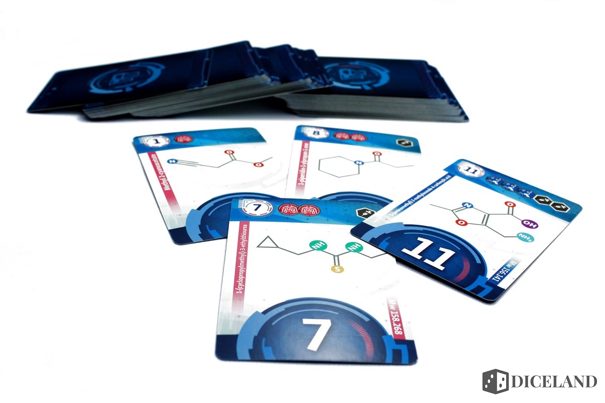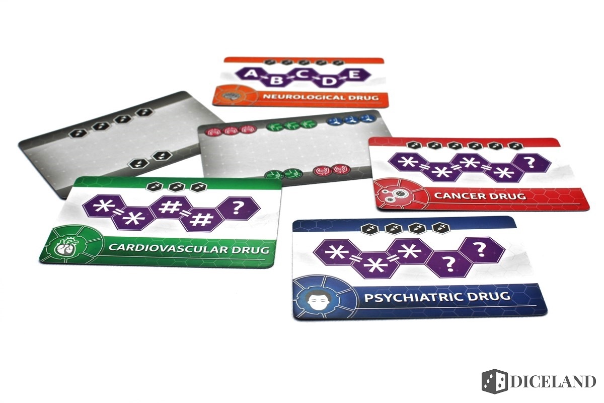 W solidnym pudełku, które nie zabierze Wam wiele miejsca w torbie, odnajdziecie całą masę różnego rodzaju kart. Będą to przede wszystkim substancje chemiczne, z których fragment po fragmencie będziecie tworzyć recepturę nowego leku. Poza nimi na stół wyjmiemy karty określające wymagany skład nowych farmaceutyków oraz wymaganą dla nich efektywność. Podobne karty określą również dopuszczalną liczbę efektów ubocznych, w końcu nie możemy zabić naszych klientów.