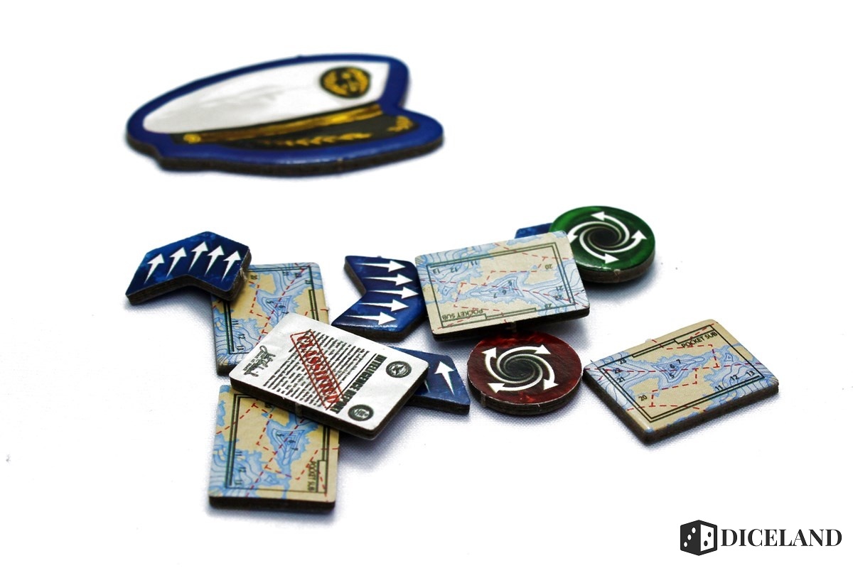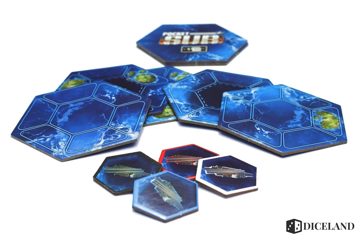 Gra nie zawiera bardzo wielu elementów, ale każdy z nich wykonano porządnie. Kafle, z których będziemy układać pole gry, są naprawdę grube, podobnie jak żetony min. Do tego kilka drewnianych pionków przedstawiających łodzie podwodne oraz centra dowodzenia w czterech kolorach. Na pewno nie poczujecie się zawiedzeni jakością!