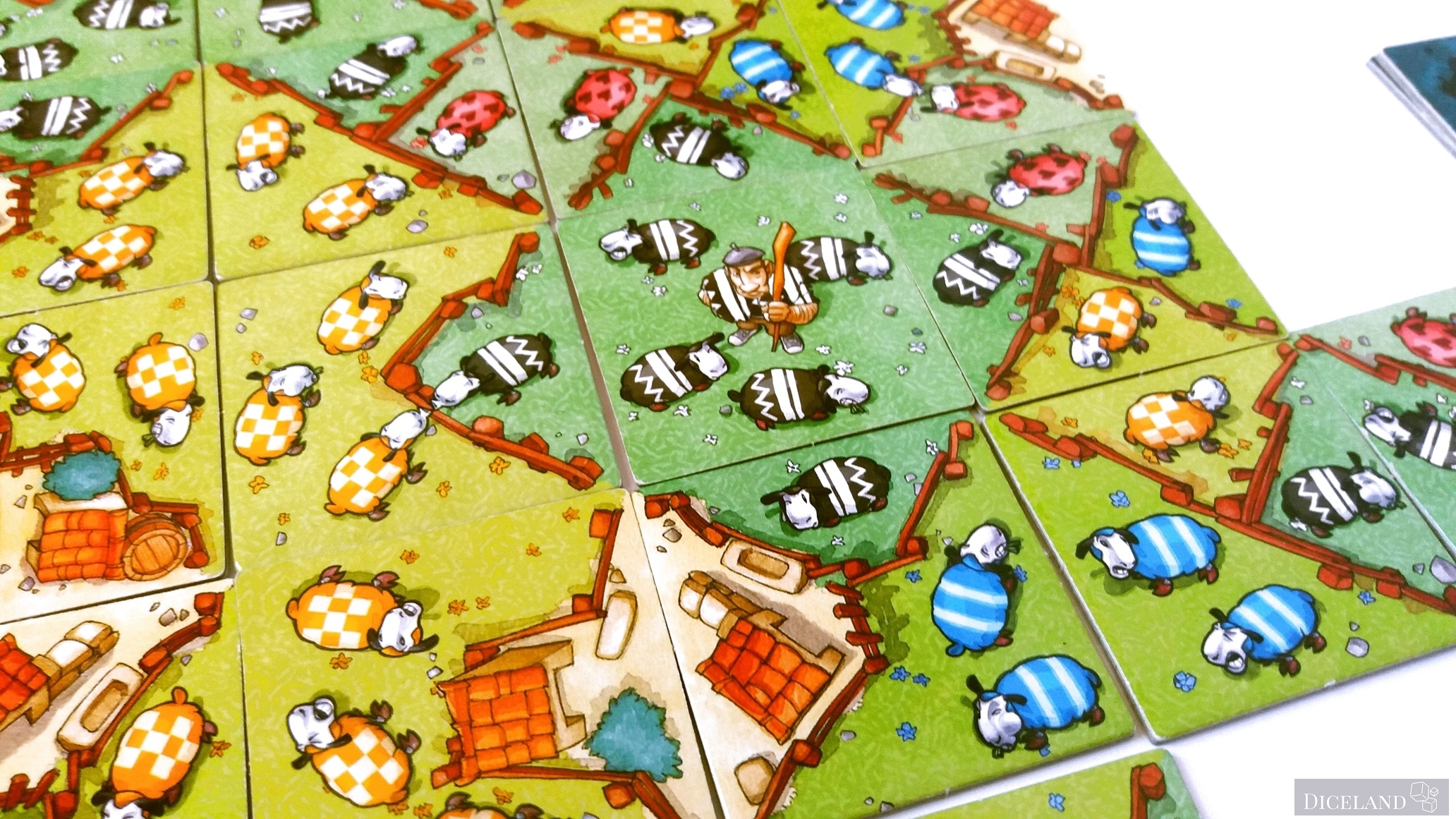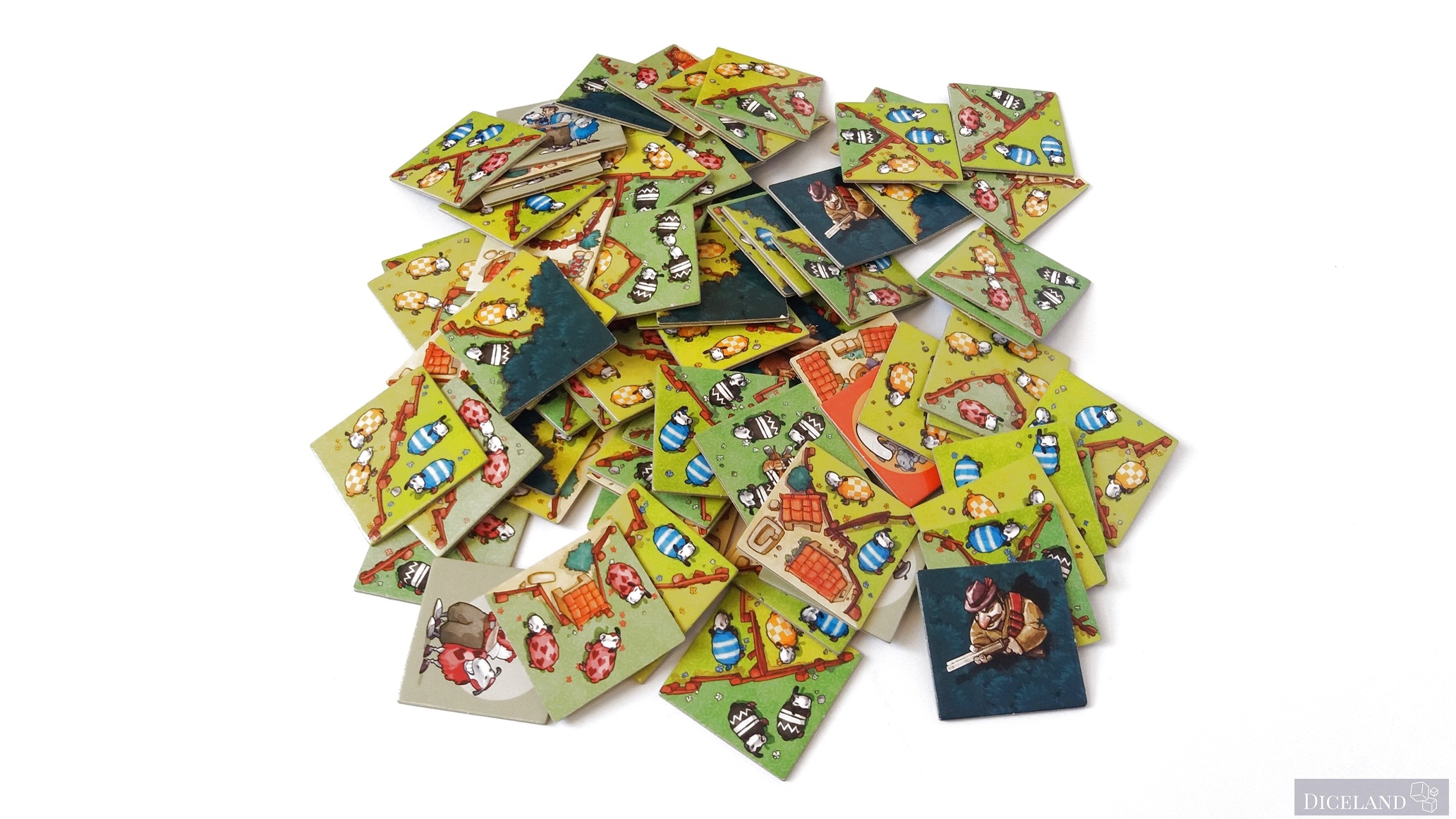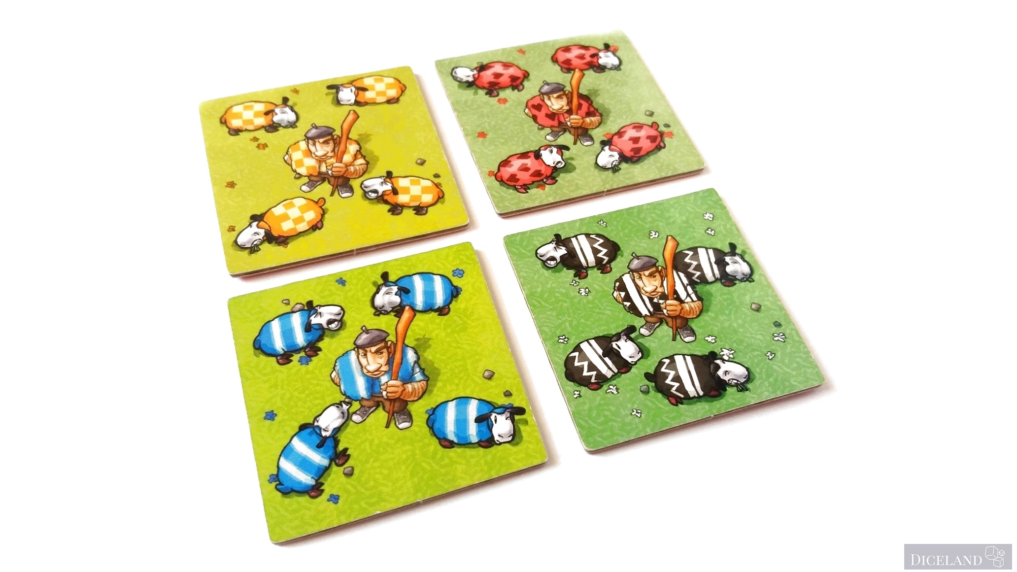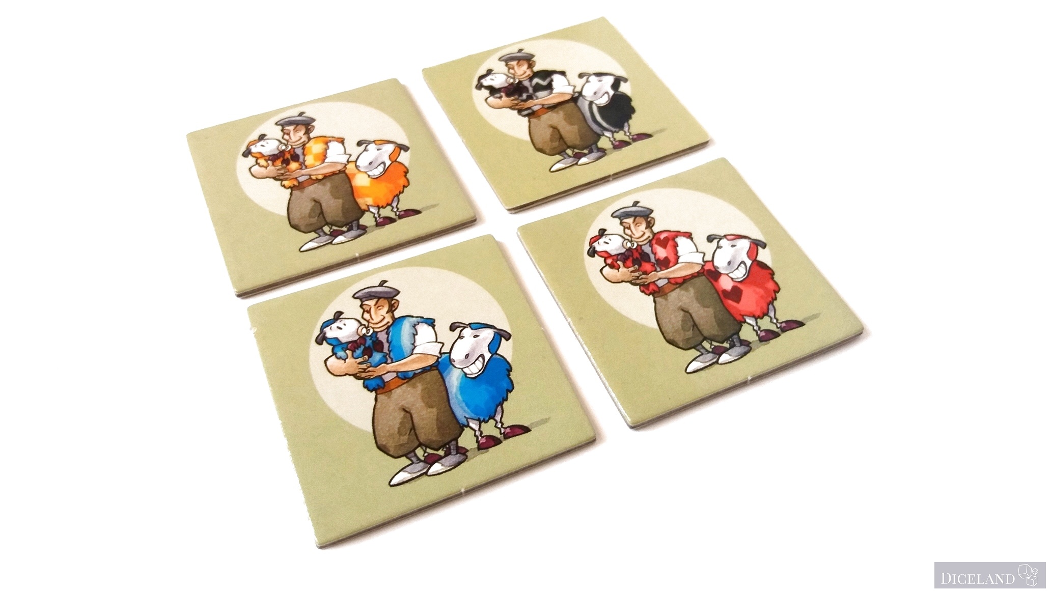 Są również kafelki ze znakiem zapytania, gdzie po jednej ich stronie znajdziemy pasterza i 4 owieczki w jednym z 4 kolorów. Na dwustronnych kafelkach znajdziemy również, takie, gdzie na jednej ze stron znajduje się myśliwy i wilk (w sumie po 4). Na kafelkach możemy znaleźć: owieczki w 4 kolorach, ogrodzenia, lasy i miasta. Ich wykonanie jest bardzo solidne i po wielu grach, nie widać na nich specjalnego zużycia.