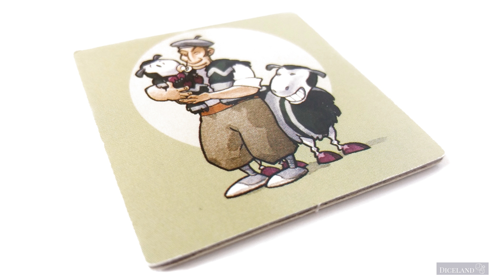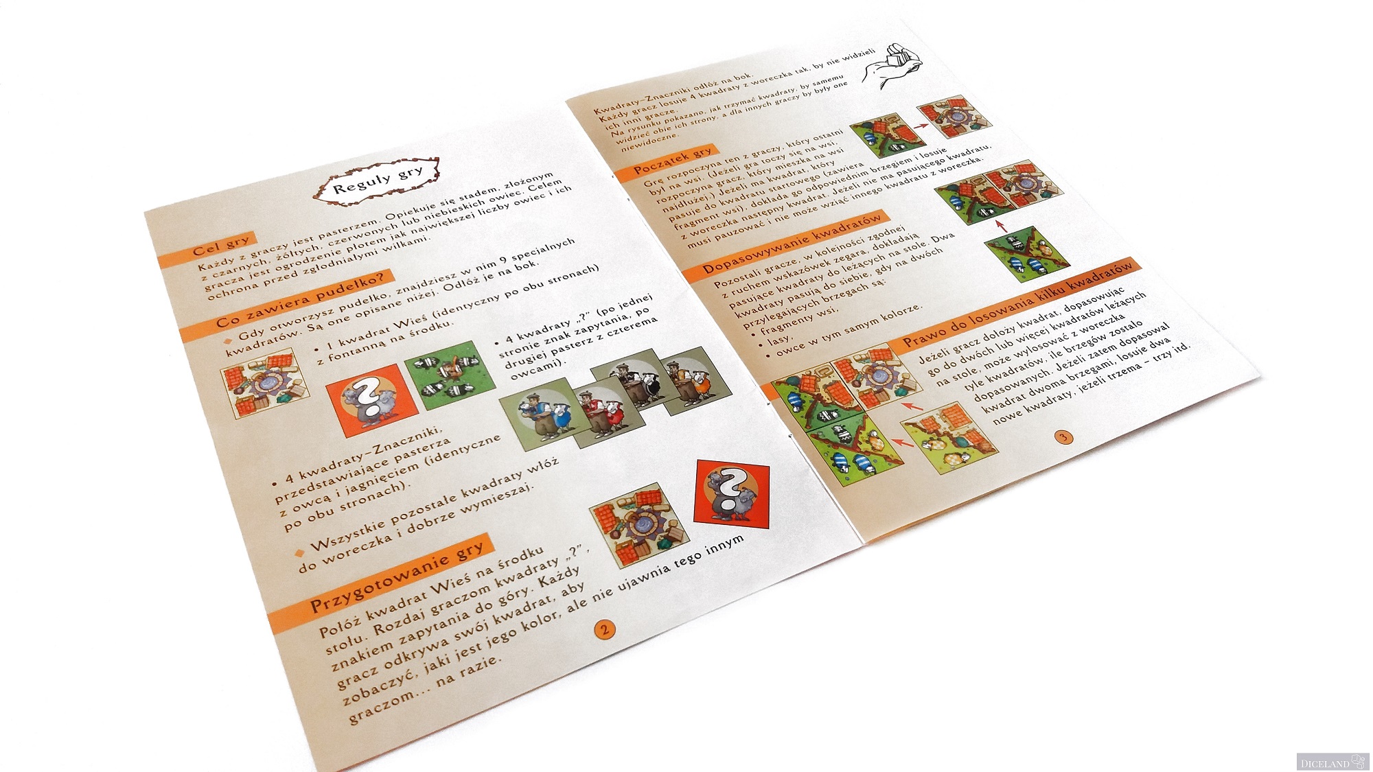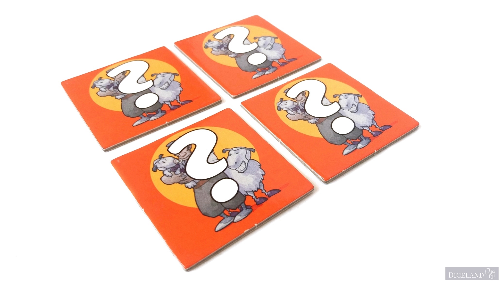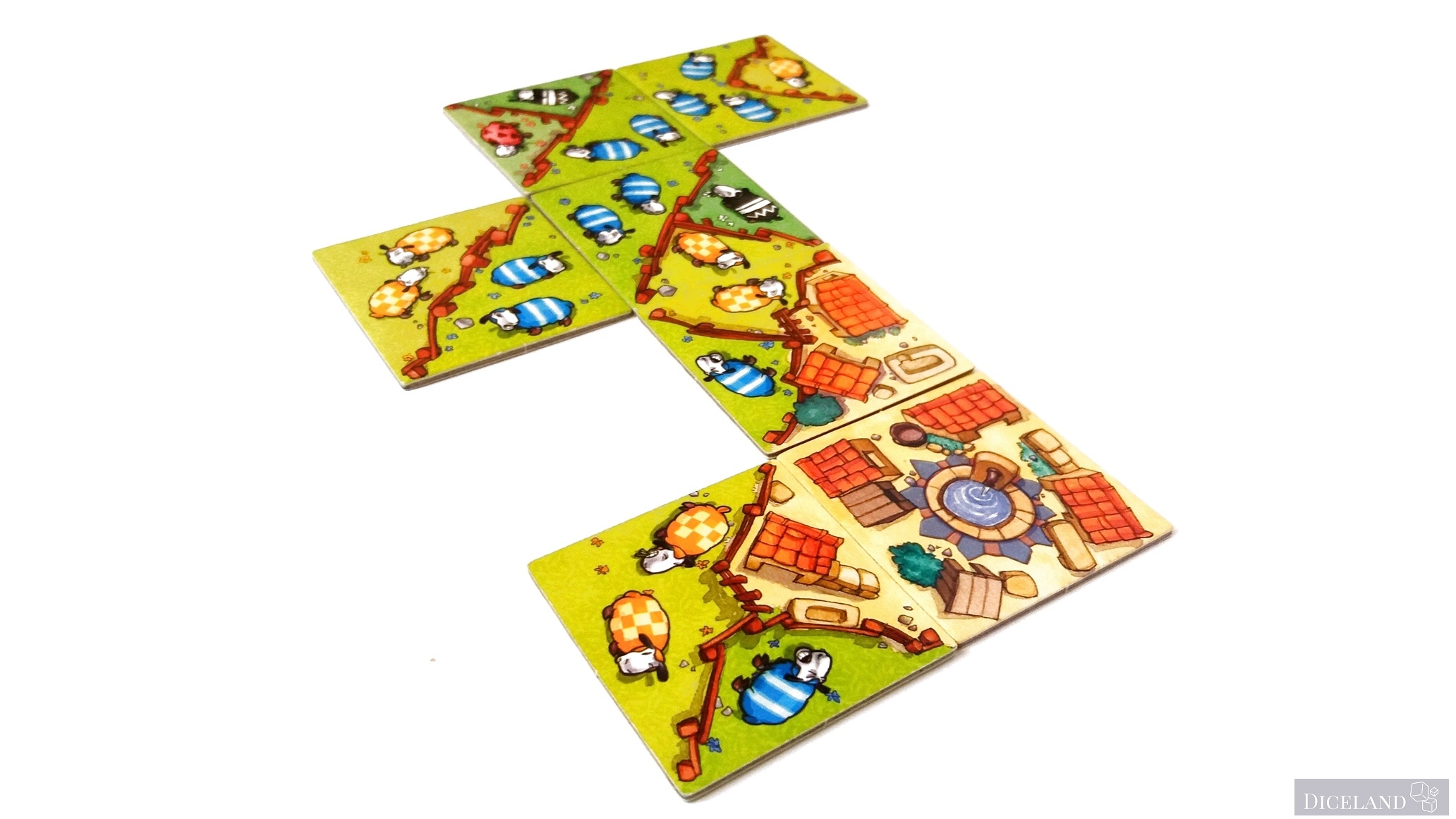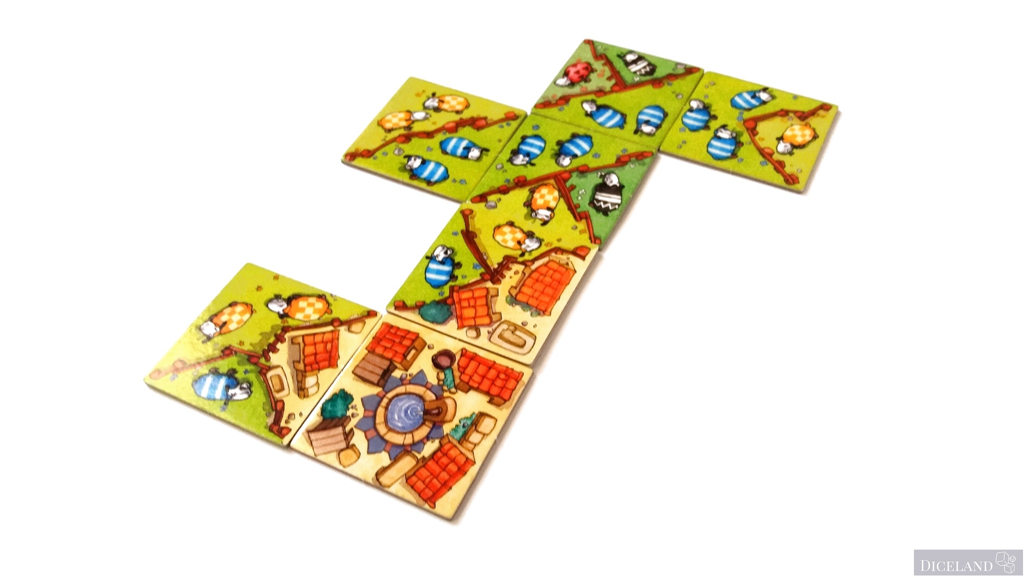 Są również kafelki ze znakiem zapytania, gdzie po jednej ich stronie znajdziemy pasterza i 4 owieczki w jednym z 4 kolorów. Na dwustronnych kafelkach znajdziemy również, takie, gdzie na jednej ze stron znajduje się myśliwy i wilk (w sumie po 4). Na kafelkach możemy znaleźć: owieczki w 4 kolorach, ogrodzenia, lasy i miasta. Ich wykonanie jest bardzo solidne i po wielu grach, nie widać na nich specjalnego zużycia.