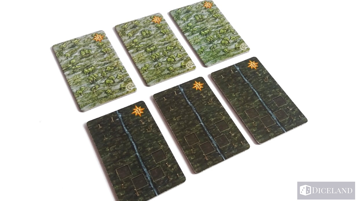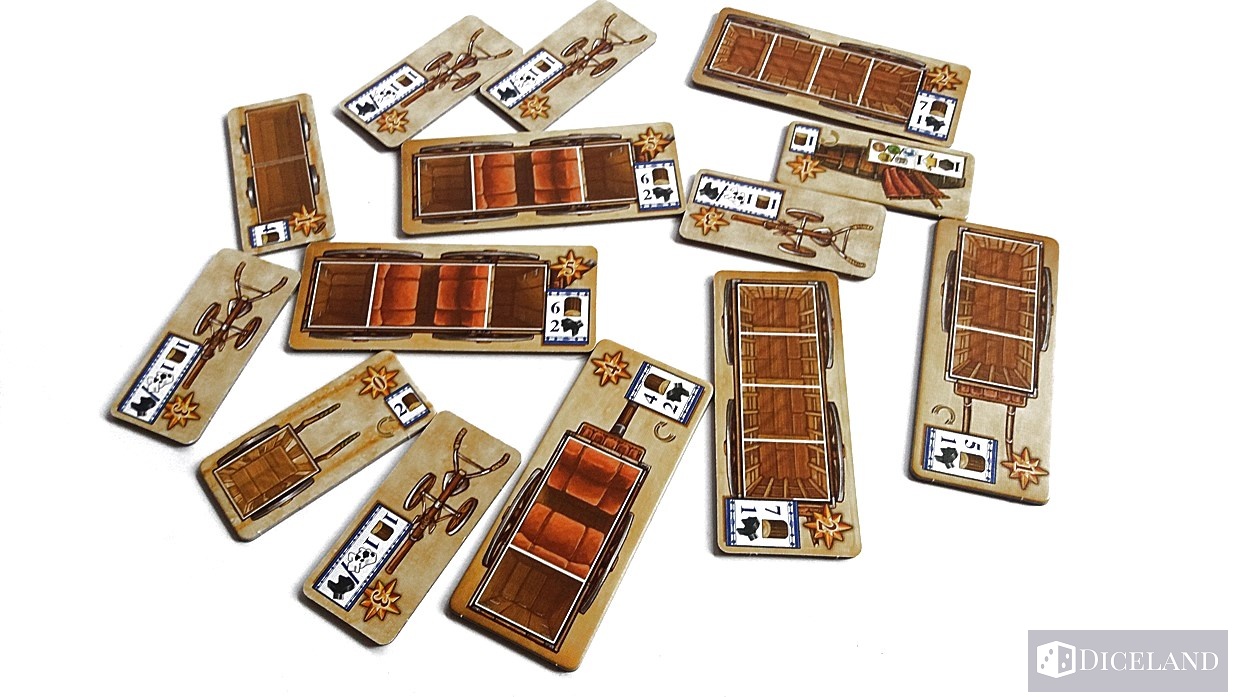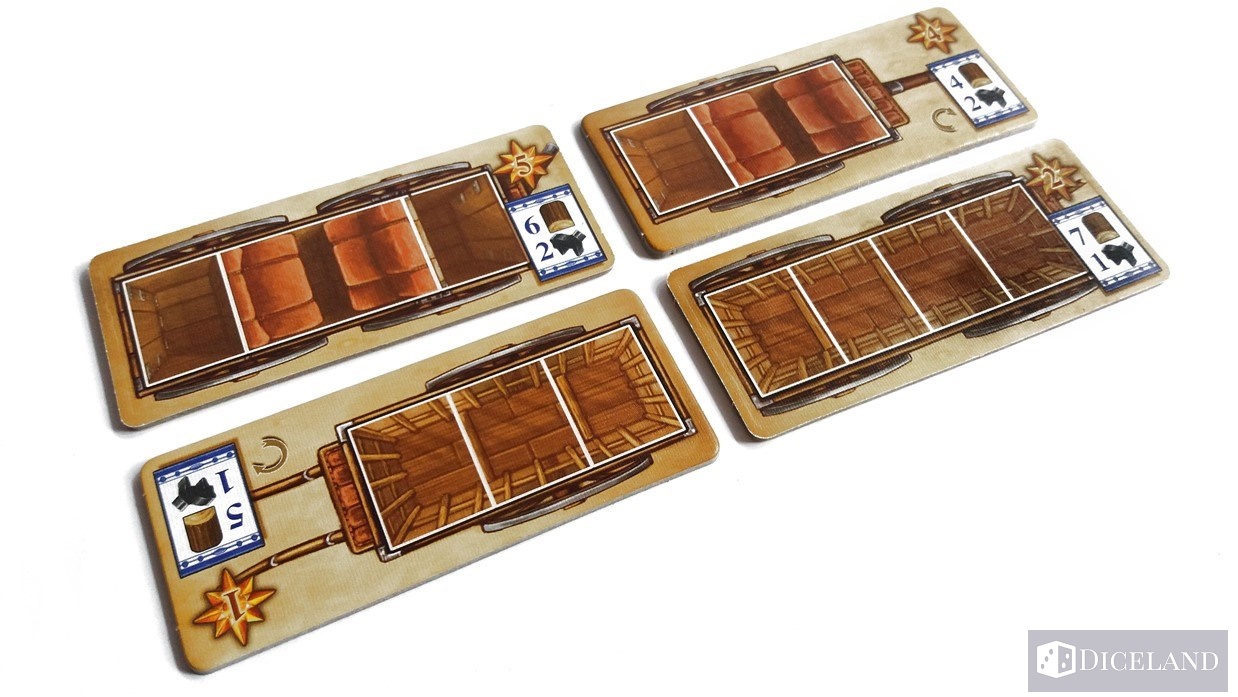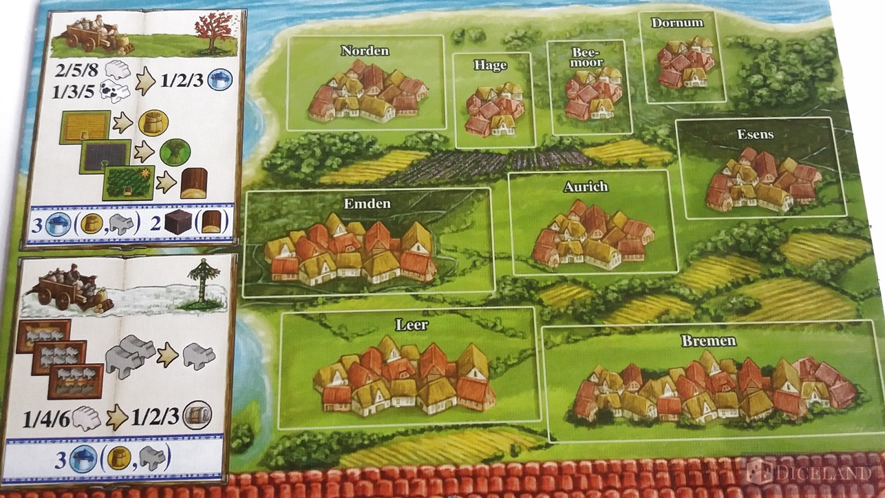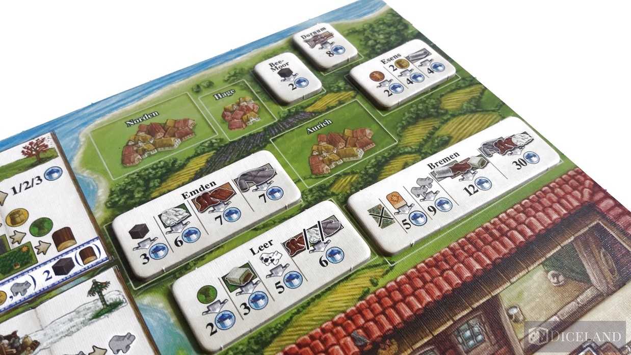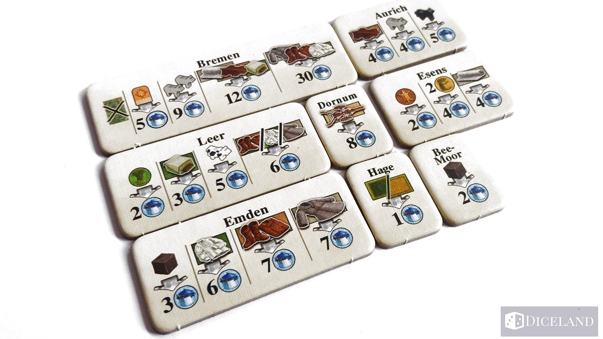 Różnej wielkości kafle podróży, odwiedzimy takie miasta jak: Hage, Beemoor, Dornum, Norden, Aurich, Esens, Emden, Leer, Bremen. Na jednej stronie mamy spis wszystkich surowców, które możemy wymienić na żywność, a po drugiej drogę, którą będziemy umieszczali jako postęp na naszej planszy w miejscu toru podróży.