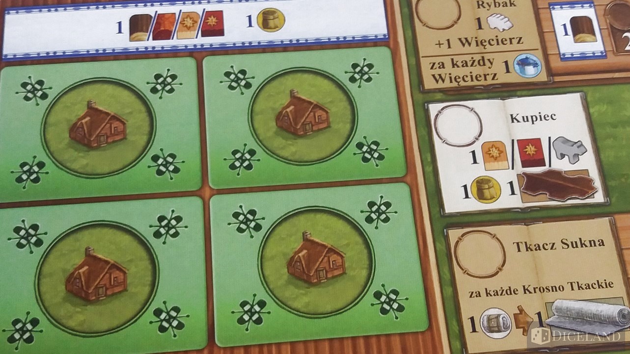 - Leśnik – zapłać jedno pożywienie i wykonaj jedną z akcji: weź 1 las albo zbuduj jeden budynek, opłacając koszt jego budowy.