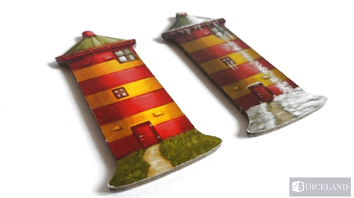 Ostatnimi żetonami, które znajdziemy w pudełku są groble i dwie latarnie morskie w wersji zimowej i letniej. Na początku gry służą do określenia pierwszego gracza.