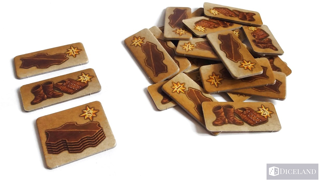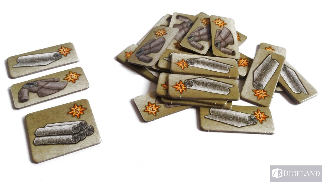 Jeśli o odzieży mowa, to mamy w grze jej 3 rodzaje: letnią, zimową i skórzaną, wytworzymy je z płótna, sukna i skóry garbowanej. Każdy z tych żetonów jest dwustronny i zawiera po jednej stronie gotową odzież, a na drugiej materiał potrzebny do jej wytworzenia. Każda grupa zawiera po 24 kafelki, a dodatkowo gdyby miało ich zabraknąć, to otrzymujemy po jednym mnożniku dla każdej kategorii.