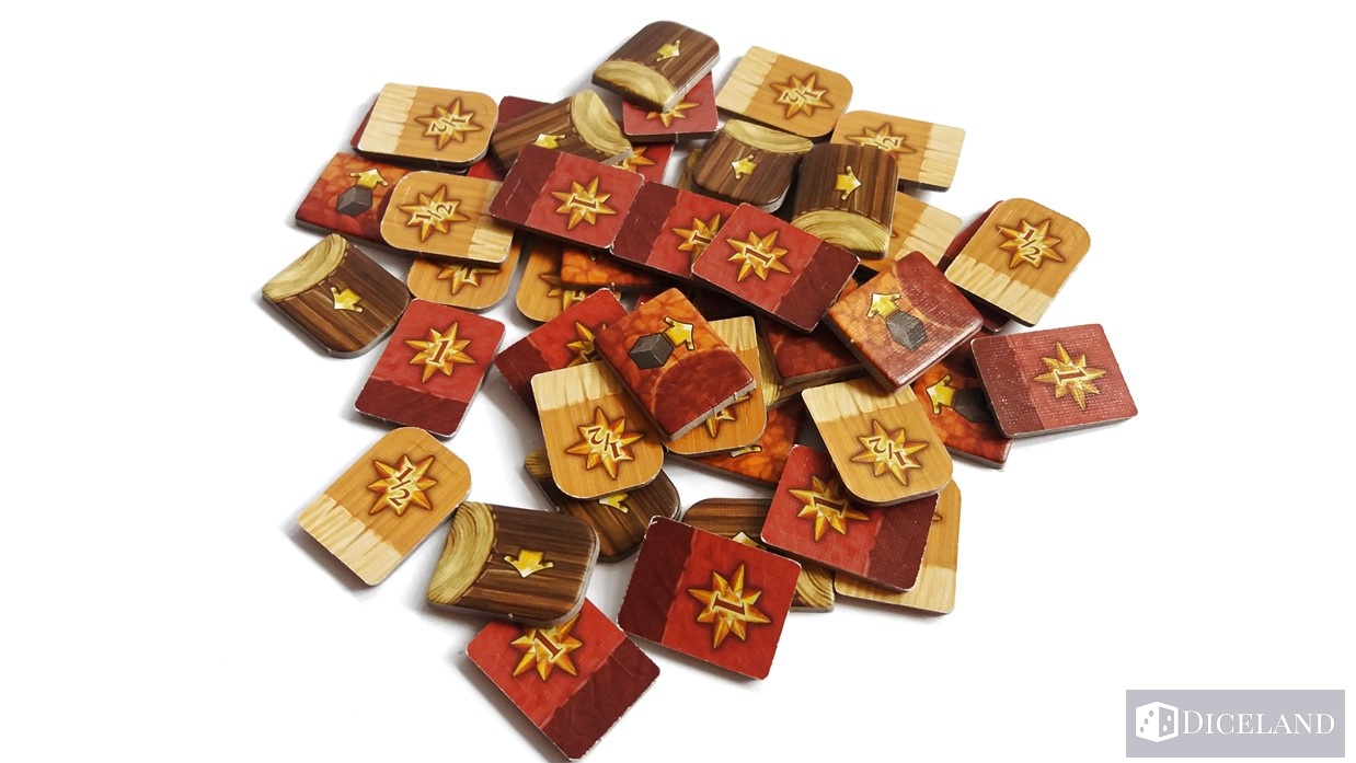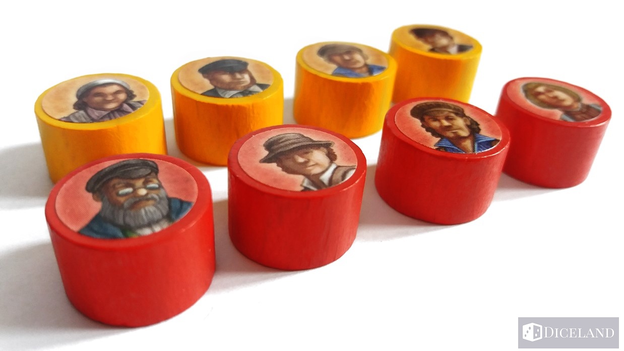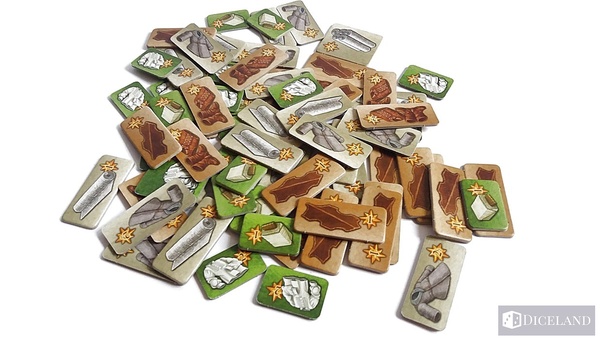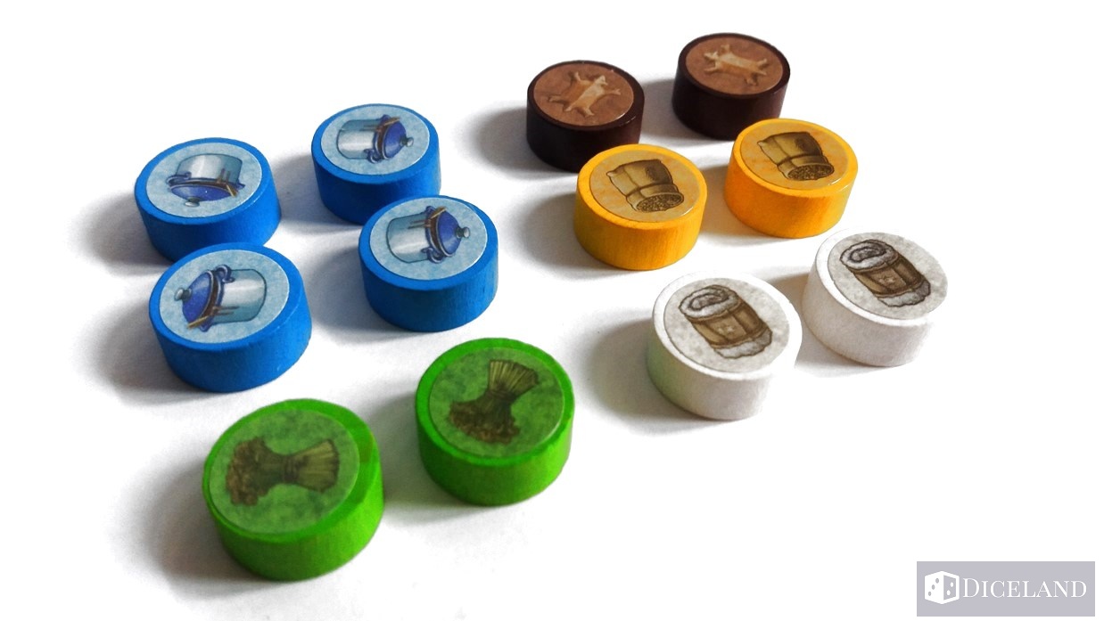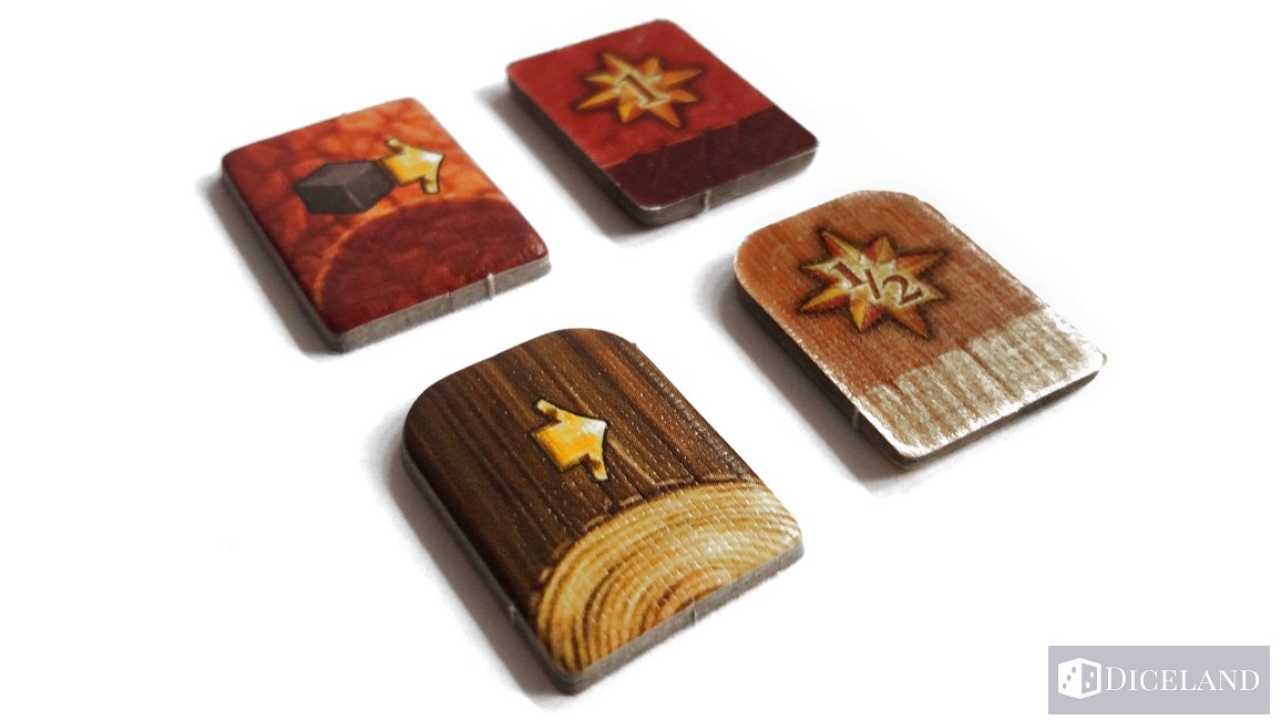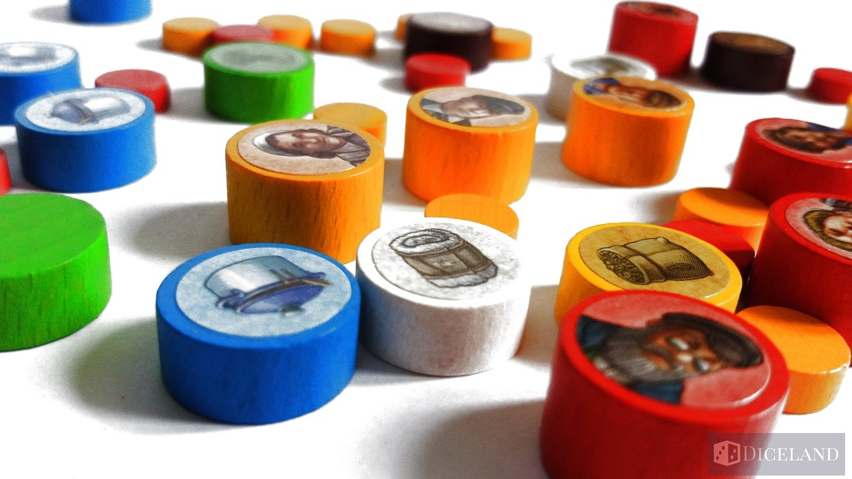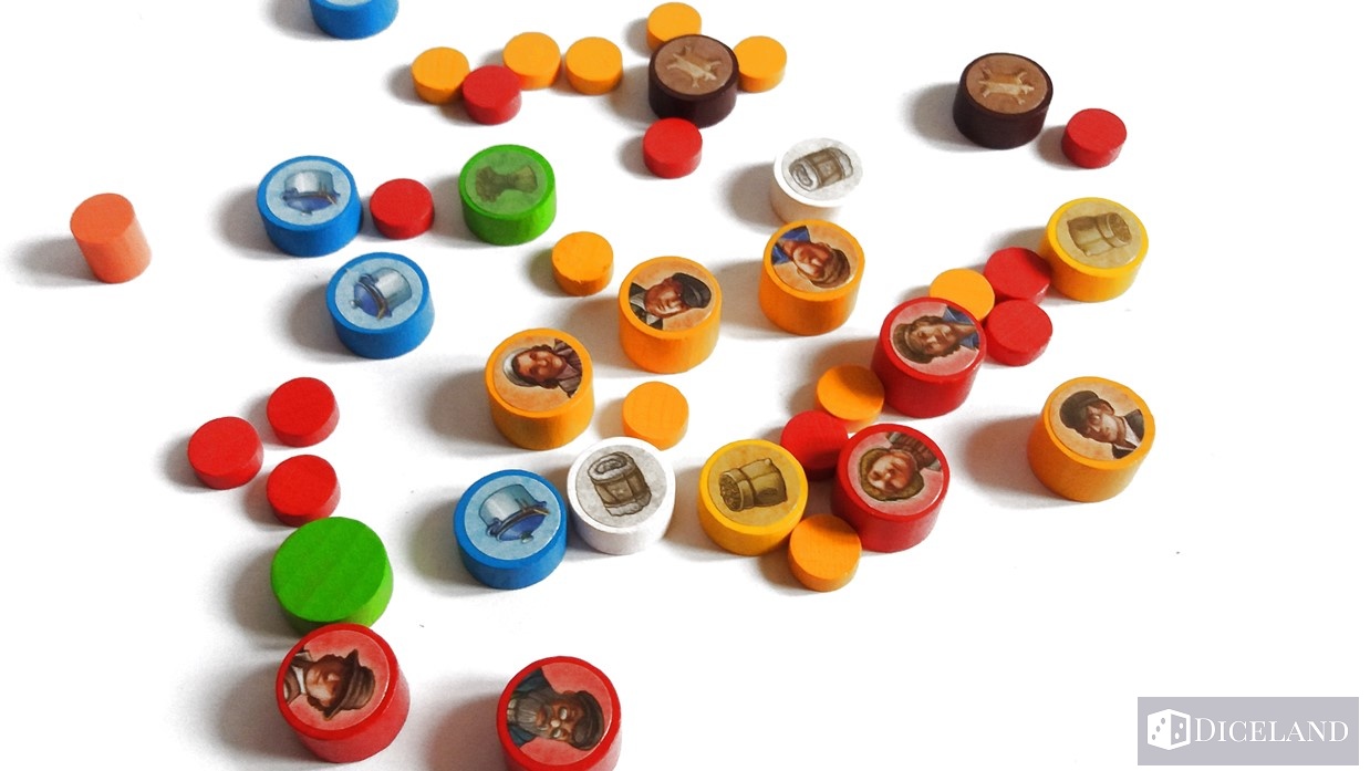 Wiele drewnianych znaczników, w tym: po 4 znaczniki robotników i 10 dysków narzędzi dla każdego gracza, 1 znacznik do oznaczania kolejnych rund, a także 12 dysków dóbr (po 6 na osobę). Na znaczniki robotników i dóbr, otrzymujemy specjalne naklejki, dzięki czemu łatwiej odróżnić poszczególne dobra od siebie, a robotnicy nie są już tylko drewnianym znacznikiem, a indywidualną postacią.