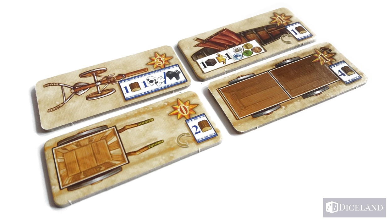 Dwustronne żetony maszyn rolniczych i wozów: 6x barka/pług, 2x dwukółka/furmanka, 3x wóz/wóz konny, 3x bryczka/dorożka.