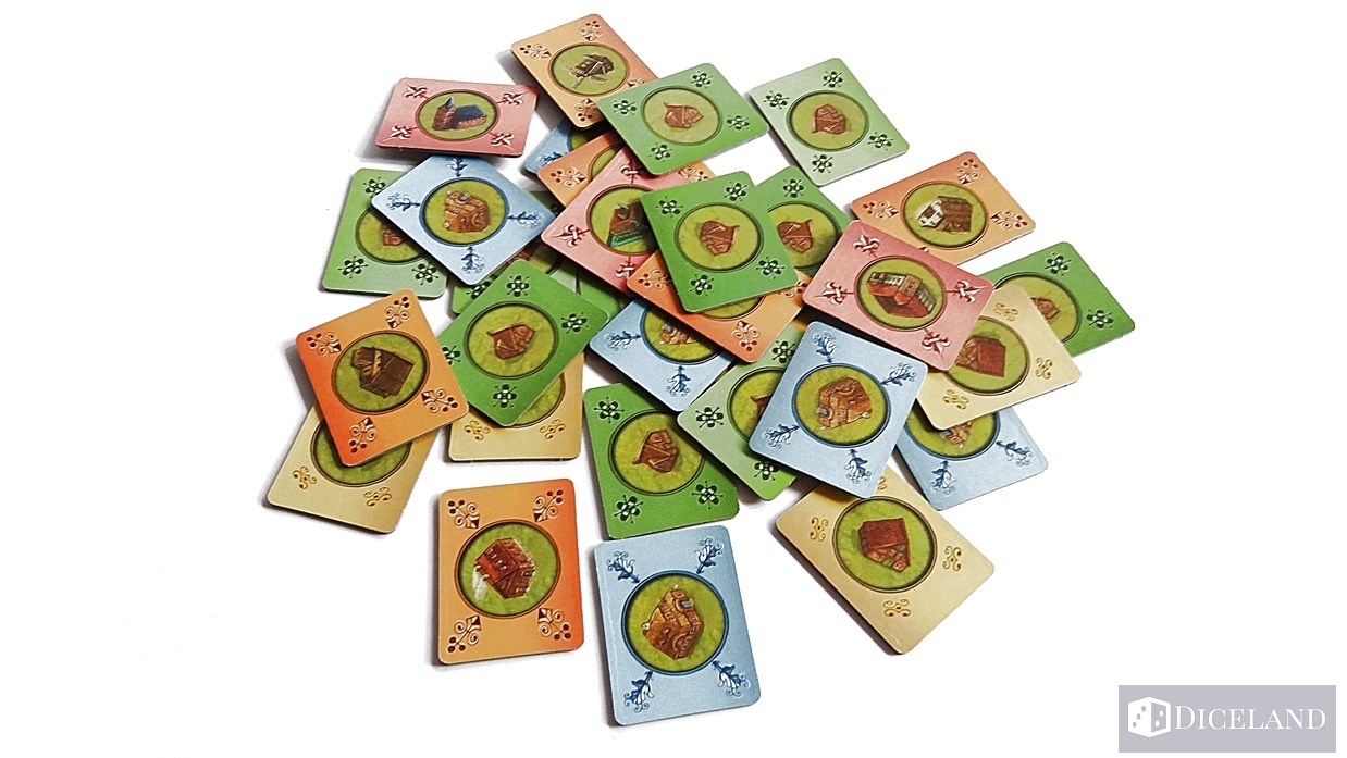 Żetony budynków, które na rewersie są pogrupowane w odpowiednich kolorach. Będziemy umieszczali je na odpowiadających im, miejscach na planszy głównej przed rozpoczęciem każdej rozgrywki. Na planszy włości będziemy umieszczali również lasy, które potem zamienimy w parki, żetony zagród wymienialne na magazyny oraz stajnie, które w potrzebie przekształcimy na podwójne stajnie.