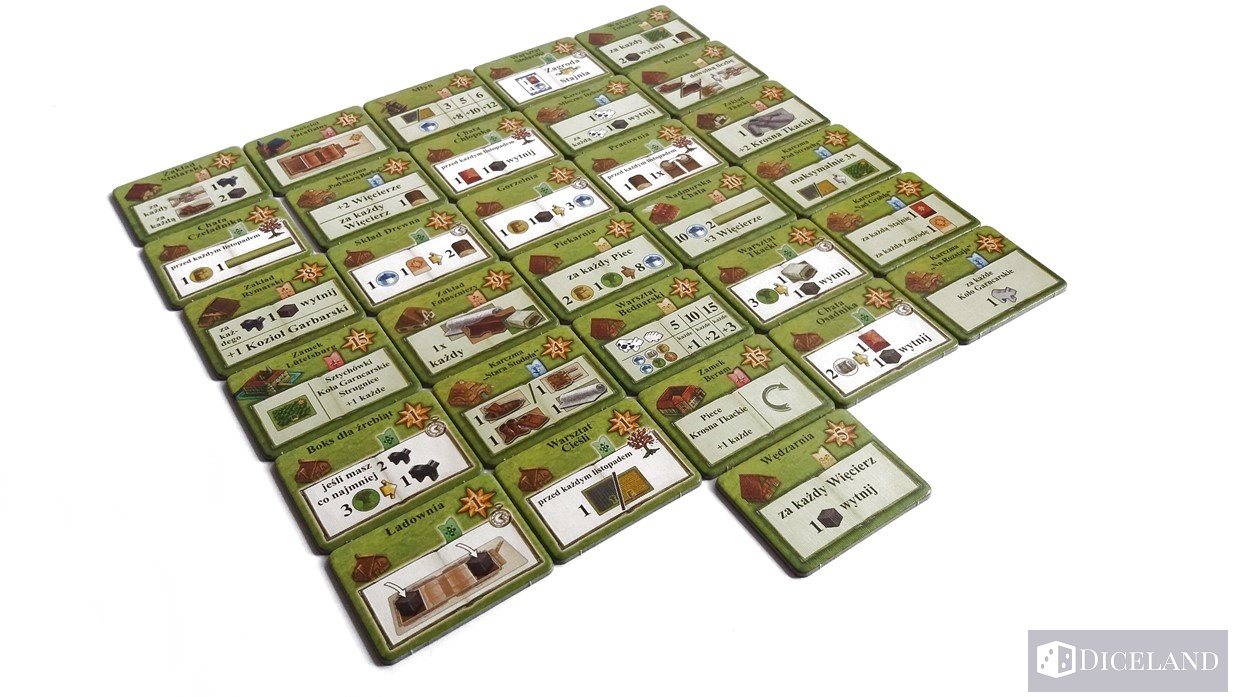 Ponadto otrzymujemy po jednej karcie pomocy dla każdego gracza. Znajdziemy na niej streszczenie dotyczące: przygotowania do gry, przebiegu rozgrywki, końca gry, sprzętu gospodarczego w stodole, odwracania kafelków i hodowli zwierząt. Niezwykle przydatna rzecz podczas pierwszych partii i po dość długiej przerwie od gry.