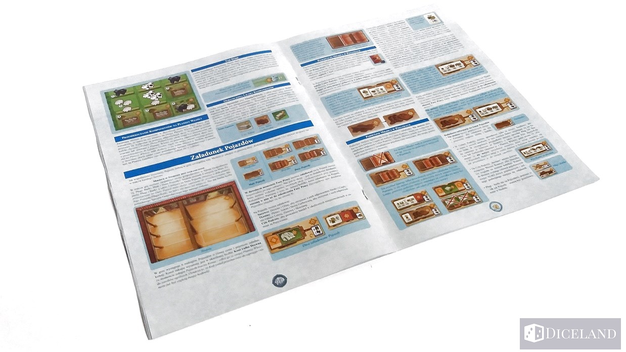 Instrukcja do gry jest napisana niewielką czcionką, ale na nasze szczęście jest bogata w masę różnych przykładów. Zasad jest dość sporo, ale są one intuicyjne, więc nie powinniście mieć problemów z ich zrozumieniem. Wszystkie zasady mieszczą się na dwudziestu stronach instrukcji, z czego 5 ostatnich stron to dodatek, którego zadaniem jest wyjaśnienie działania poszczególnych budynków występujących w grze, opis działania kafelków z celami podróży, sprzętem gospodarczym i narzędzi, a także indeks kluczowych terminów pojawiających się w grze.