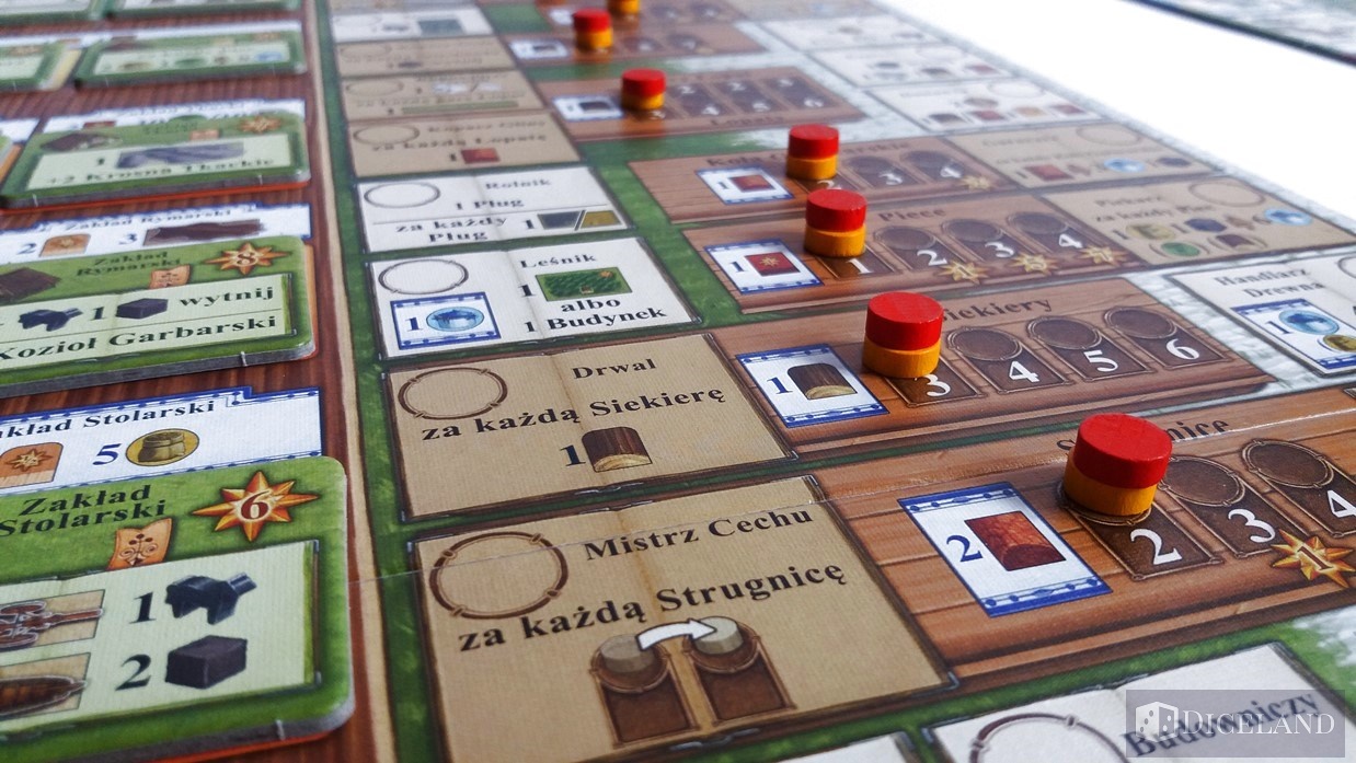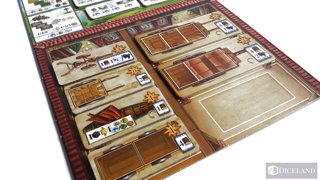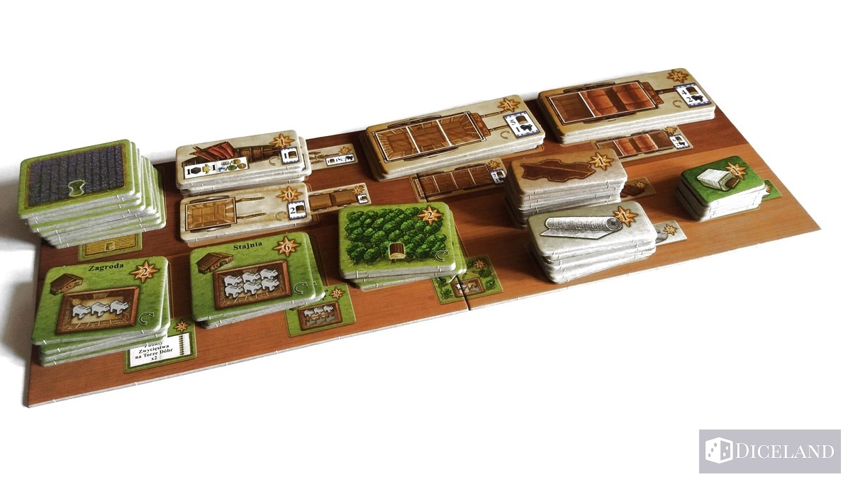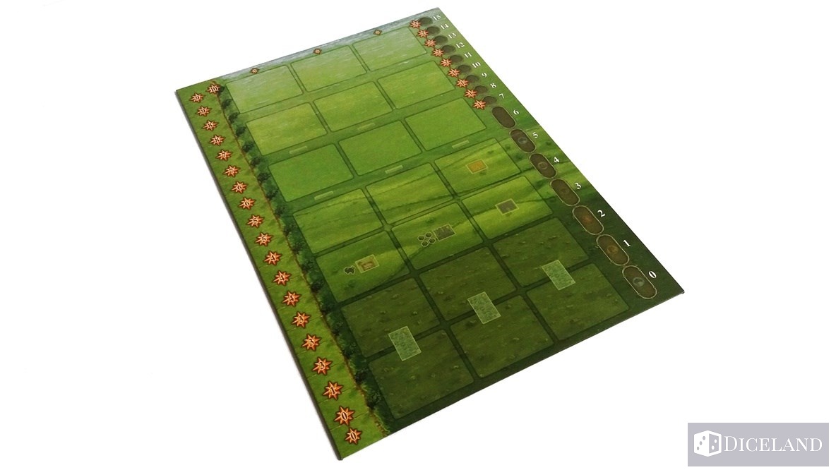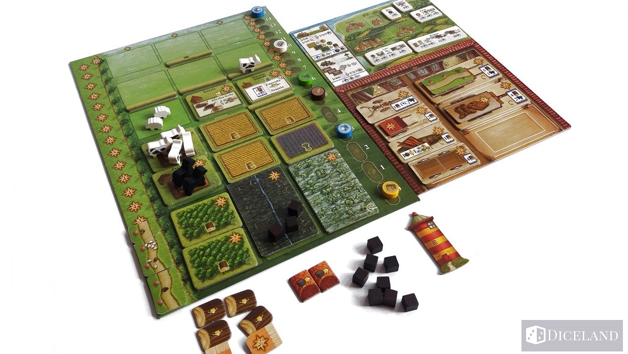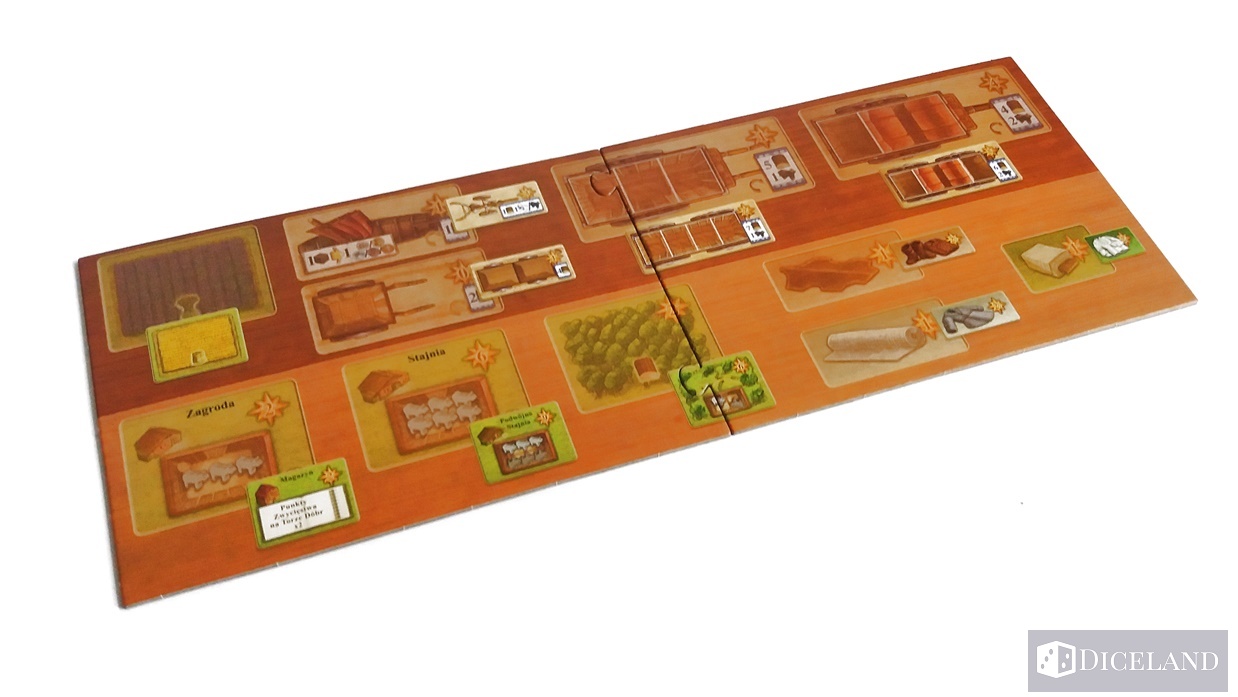 Wszystkie akcje naszych rolników będziemy wykonywać na głównej planszy gry. Znajdziemy na niej informację o aktualnej turze i sezonie, ogromną liczbę miejsc do których będziemy wysyłali naszych pracowników (osobne dla sezonu letniego i zimowego), a także informację o naszych narzędziach i ich rozwinięciu, miejsca na budynki, które będziemy dokładali w postaci żetonów. Będą one występowały co partię w nieco innej konfiguracji. Plansza ta jest wykonana estetycznie, jest przyjemna dla oka, ale początkowo może wzbudzać duży niepokój, gdyż zawiera dość sporo pól i nie sposób przez nie wszystkie przebrnąć przy pierwszej partii.