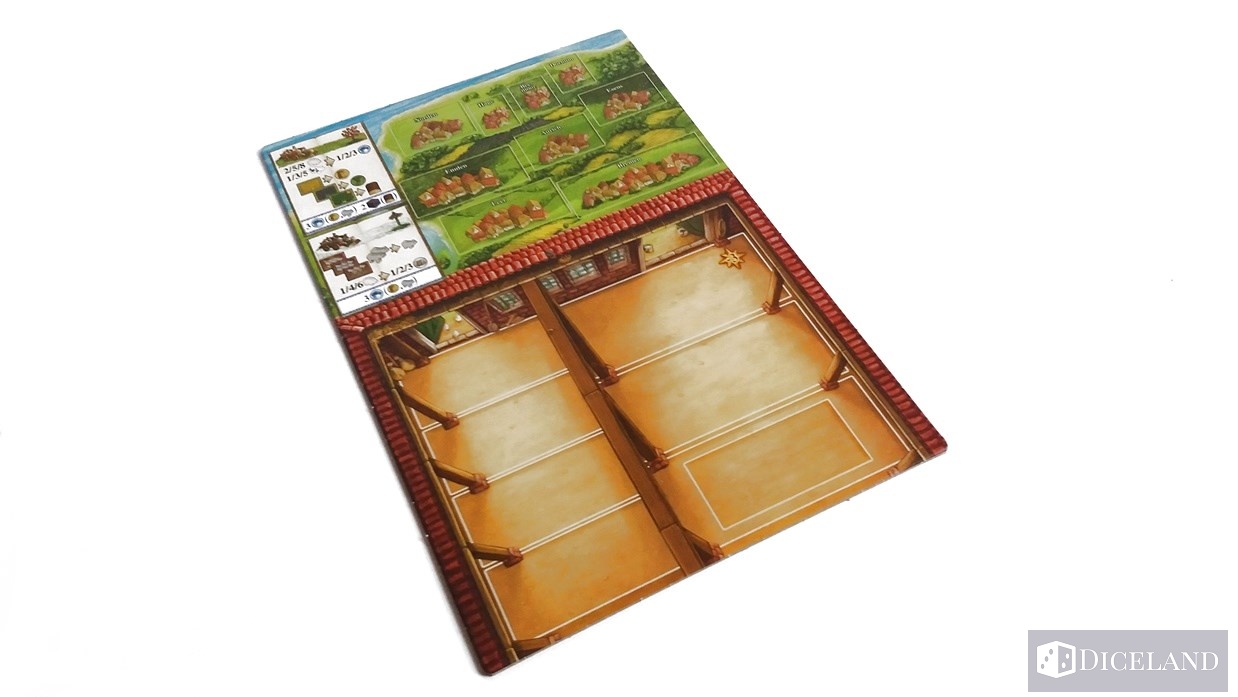 Dla każdego gracza została również przygotowana plansza z magazynem i celami naszych podróży. W magazynie tym będziemy trzymali nasze maszyny rolnicze, które pomogą nam w przetwarzaniu zasobów w lepsze ich odpowiedniki (np. drewno w deski), a także posłużą do podróży poza miasto, gdzie będziemy mogli sprzedać nasze towary. Patrząc na magazyn widzimy go w perspektywie trójwymiarowej i świetnie to wygląda. Na górze planszetek znajdziemy informację o miastach, które możemy odwiedzić podczas gry, a także przypomnienie o zasadach dotyczących inwentaryzacji.