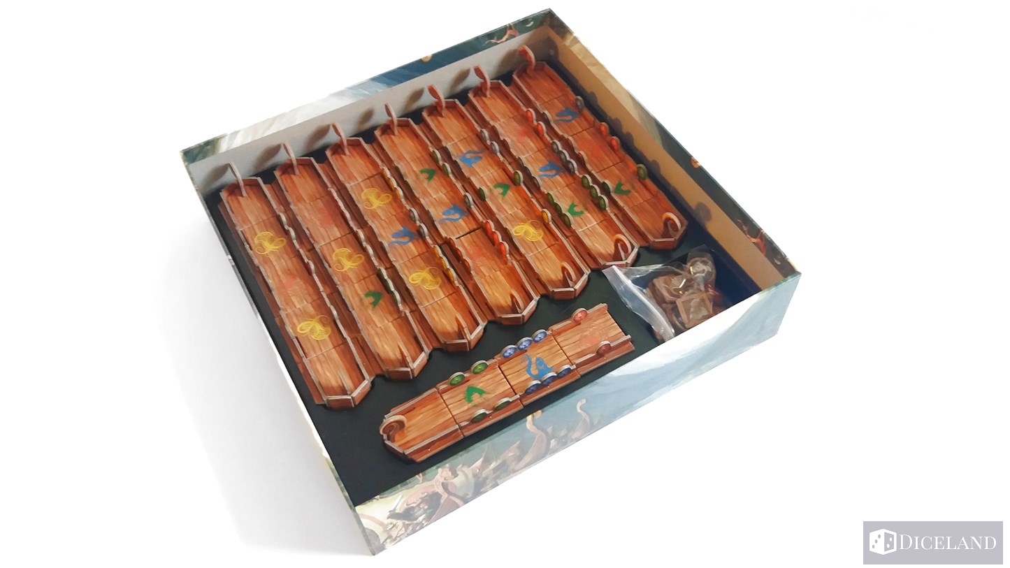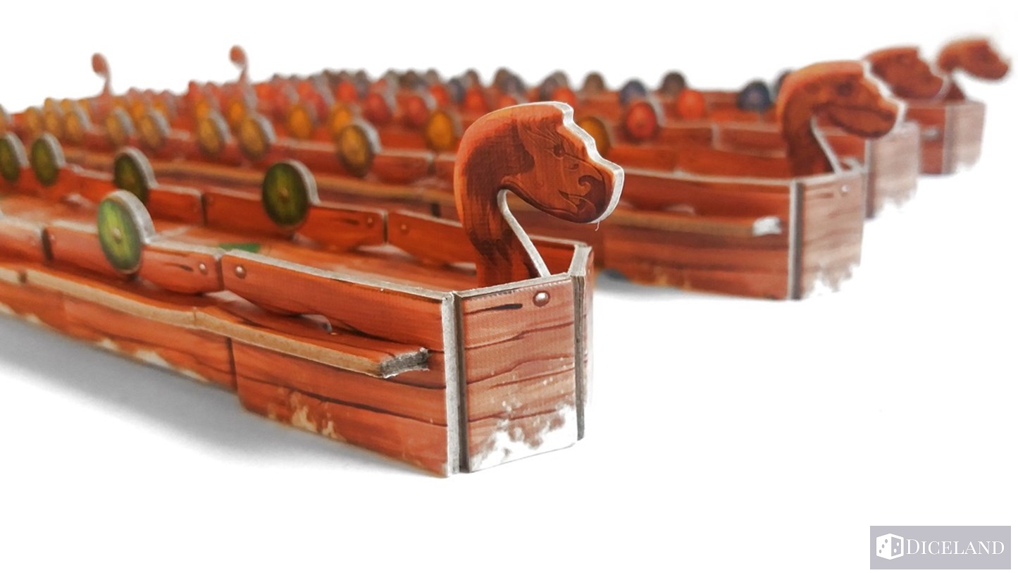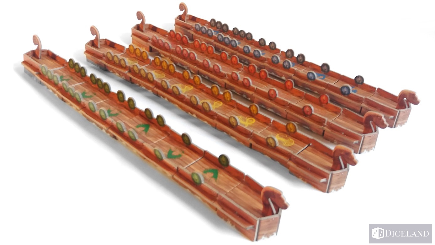 Głównym elementem gry są jednak łodzie, które dostajemy już złożone. Mają one specjalne miejsce w wyprasce i wszystko idealnie pasuje do siebie. Łodzie również są w 4 kolorach i składają się z 3 części: 7 ruf, 8 dziobów i 24 fragmentów kadłuba, na których umieszczono tarcze w liczbie od 1 do 3 w kolorze graczy.