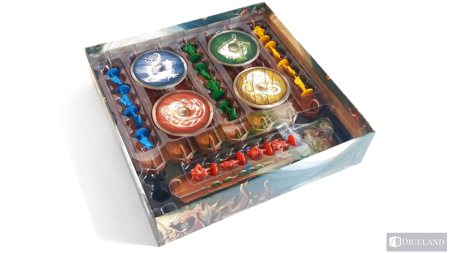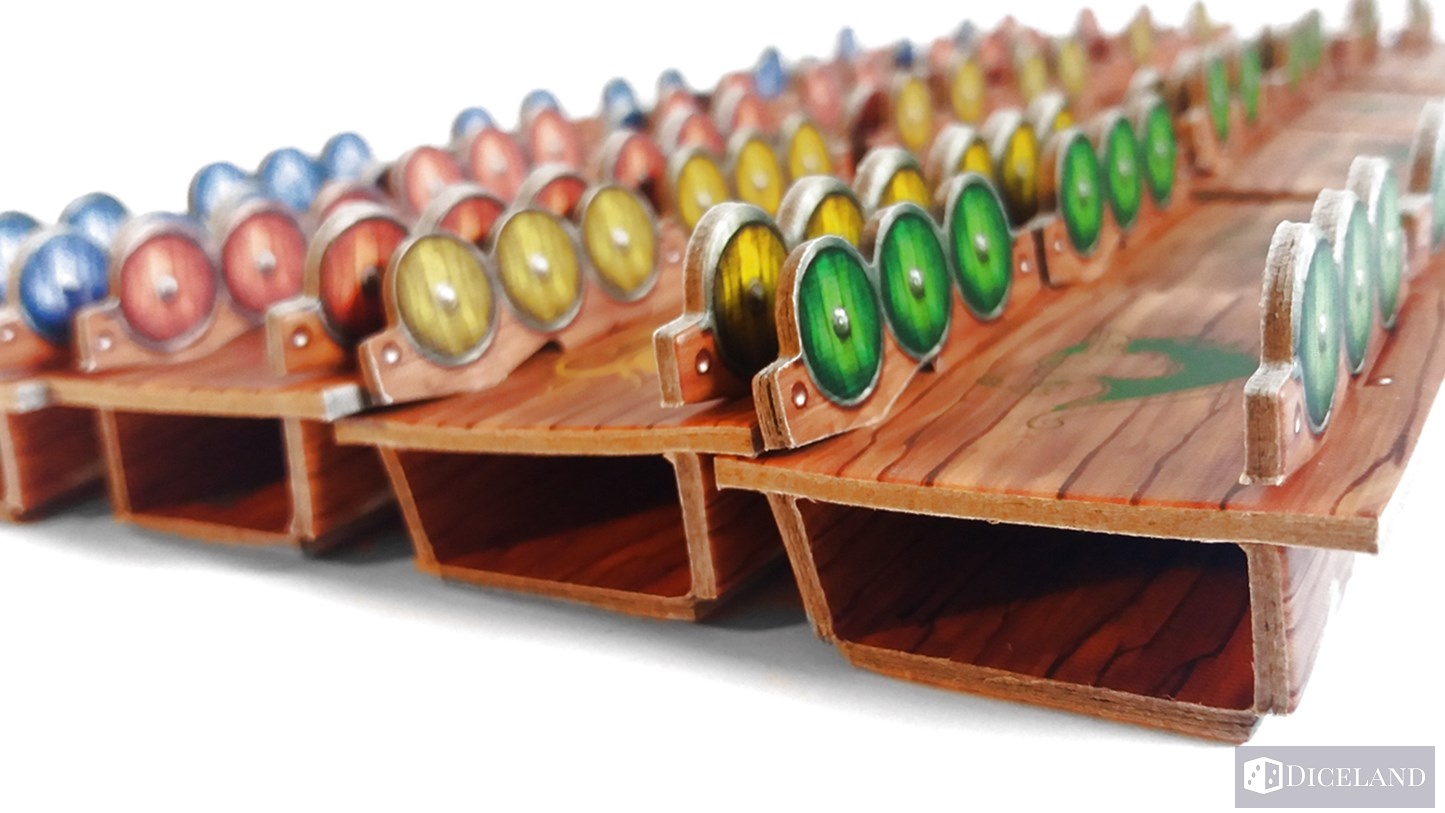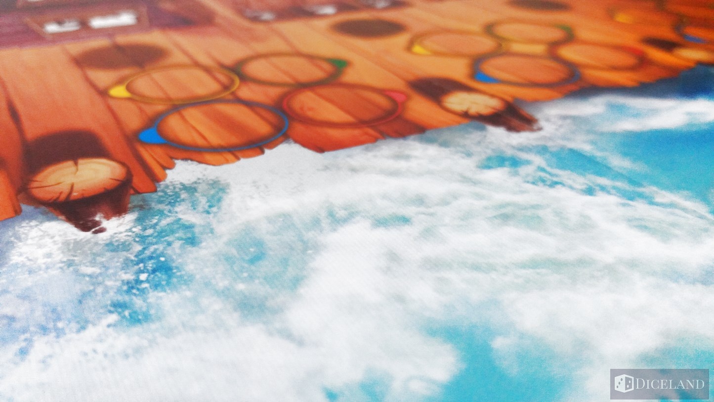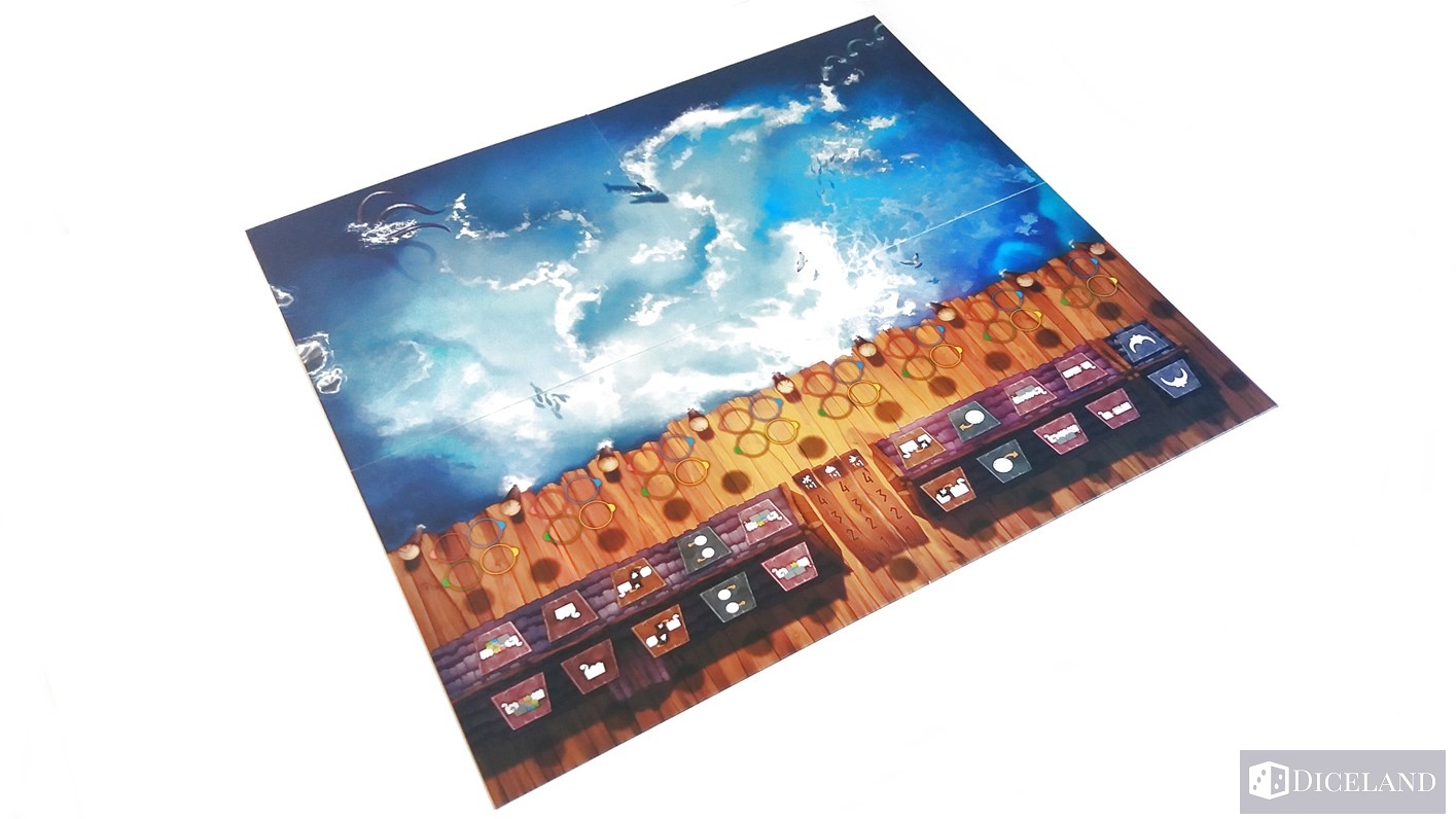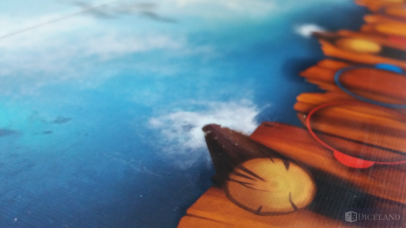 Pięknie ilustrowana plansza główna, która na odwrocie ma narysowane tarcze we wszystkich kolorach graczy. Plansza przedstawia wioskę, a w zasadzie dwa znajdujące się w niej budynki, przystań, którą podzielono na osiem stanowisk cumowniczych, a także fiord, który jest przepięknie namalowany. Mimo, że to tylko zwykła woda, to robi ona ogromne wrażenie, widać tam fale, ryby, rekina i potwory morskie. Dodatkowo jest ona ukazana w kilku kolorach błękitu – przyznam, że dość intensywnego, a całość jest jakby w trójwymiarze, brawa dla artysty za wykonanie.