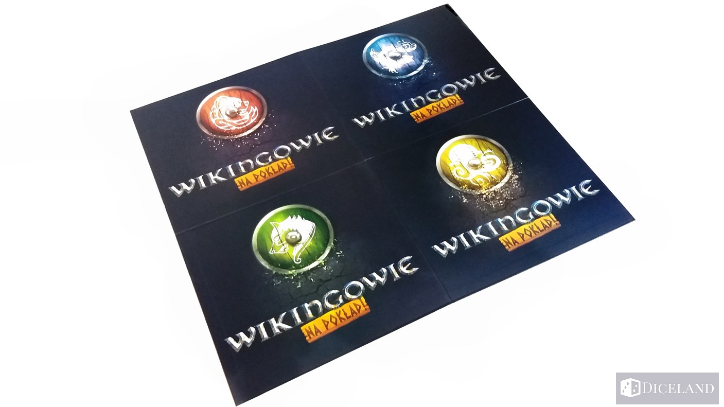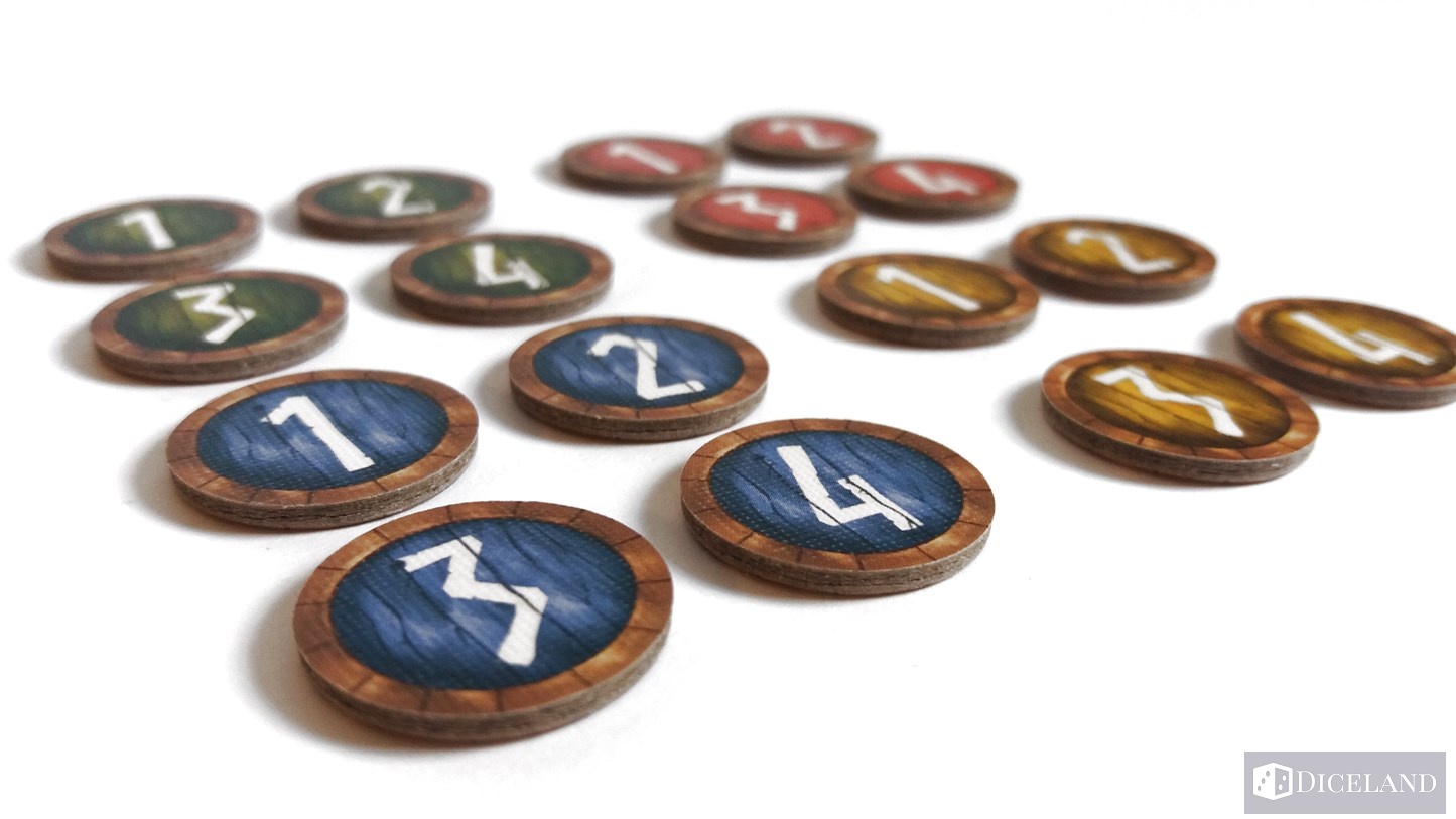 Do gry dołączone zostały tarcze w czterech kolorach, na których będziemy umieszczali zdobyte żetony podczas rozgrywki. Każda z nich przedstawia inny herb klanu wikingów.
