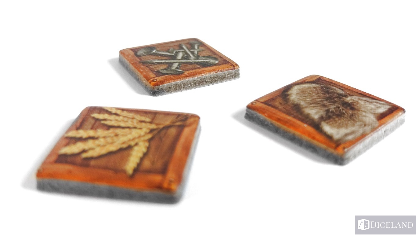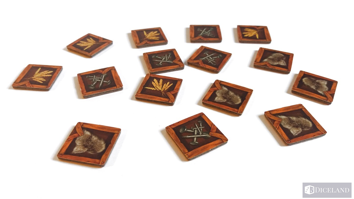 16 żetonów zakładów, po 5 żetonów skór, zboża i gwoździ oraz 3 żetony wartości rynkowej.