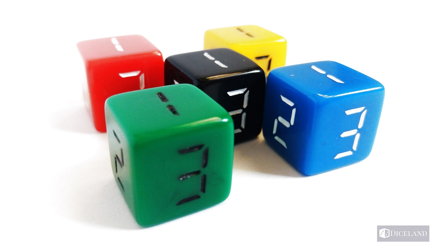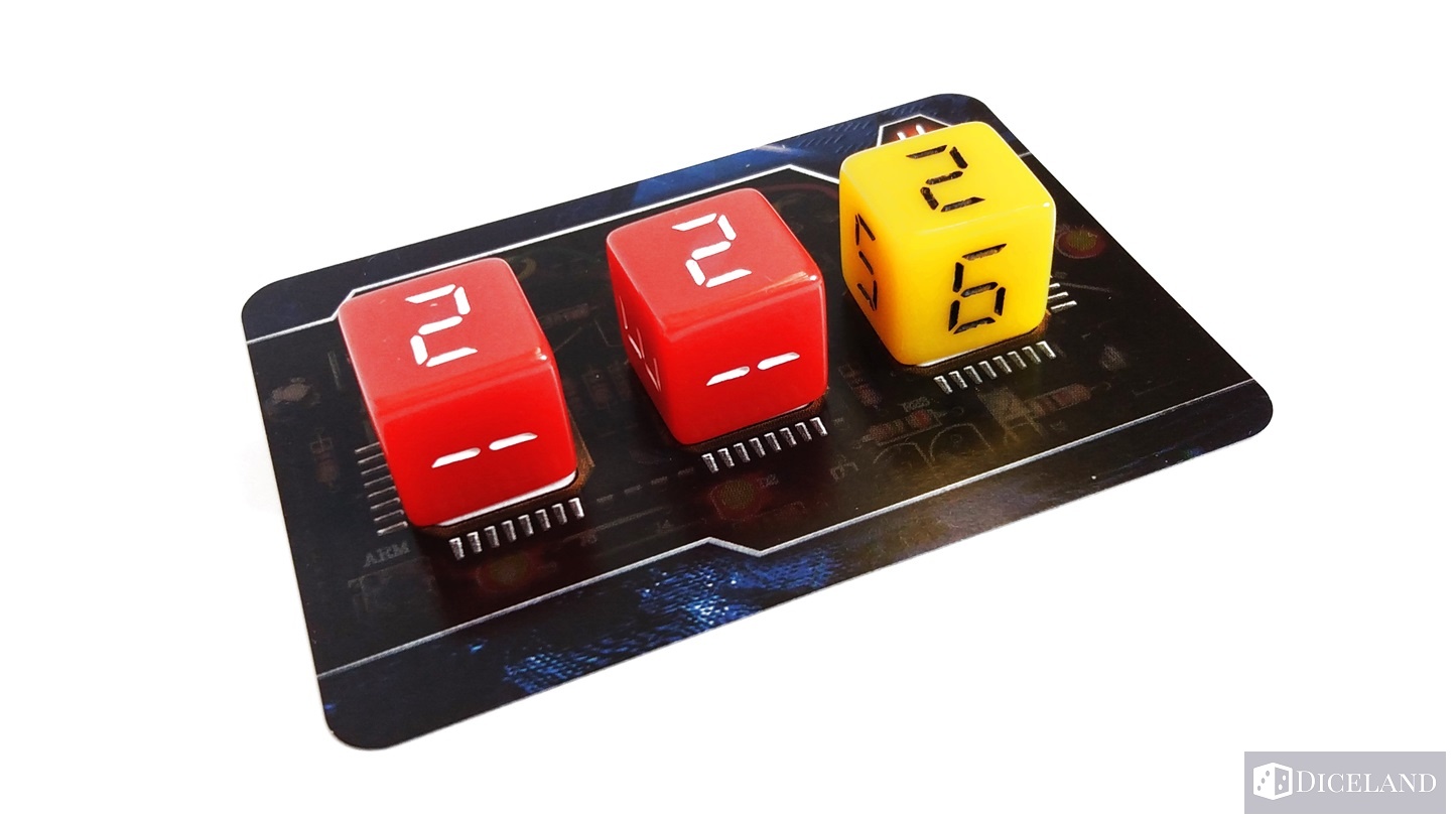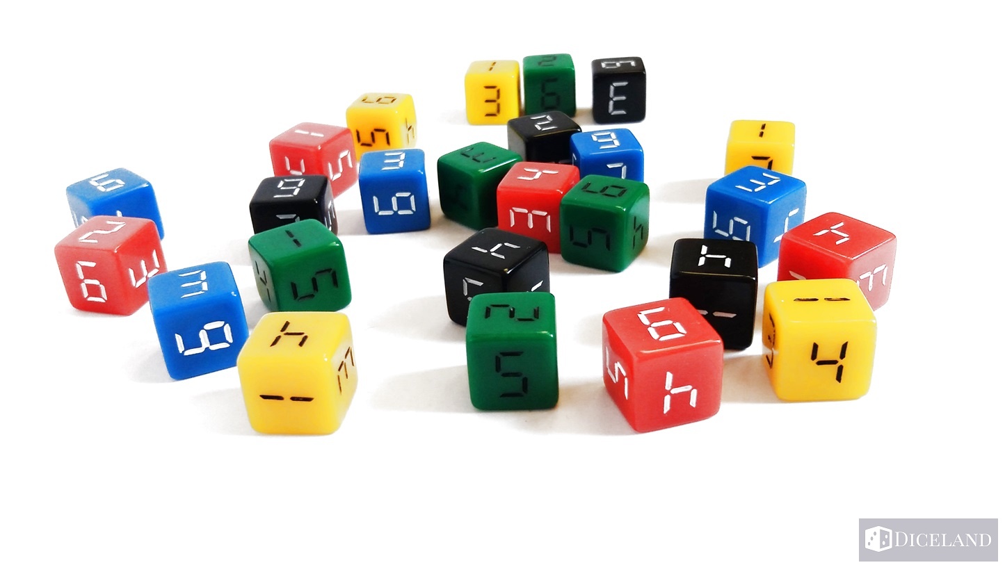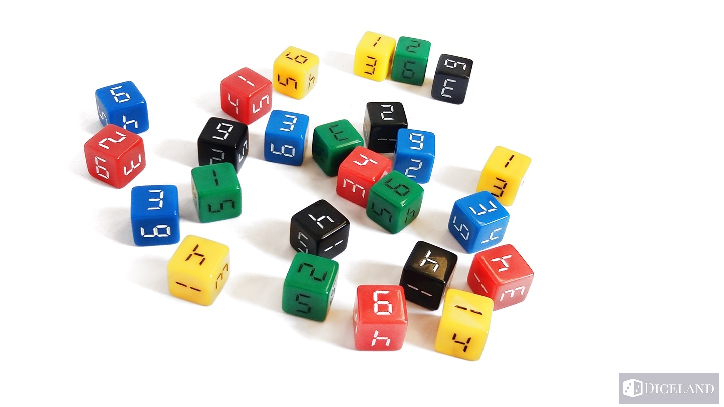 25 kości, które zostały podzielone na pięć kolorów: żółte, niebieskie, zielone, czerwone i czarne – w każdym kolorze po 5 kości. Są one troszkę większego rozmiaru, co oznacza że są cięższe niż standardowe, a oznaczenia od 1 do 6 na nich przypominają cyfry z wyświetlaczy np. zegarów cyfrowych.