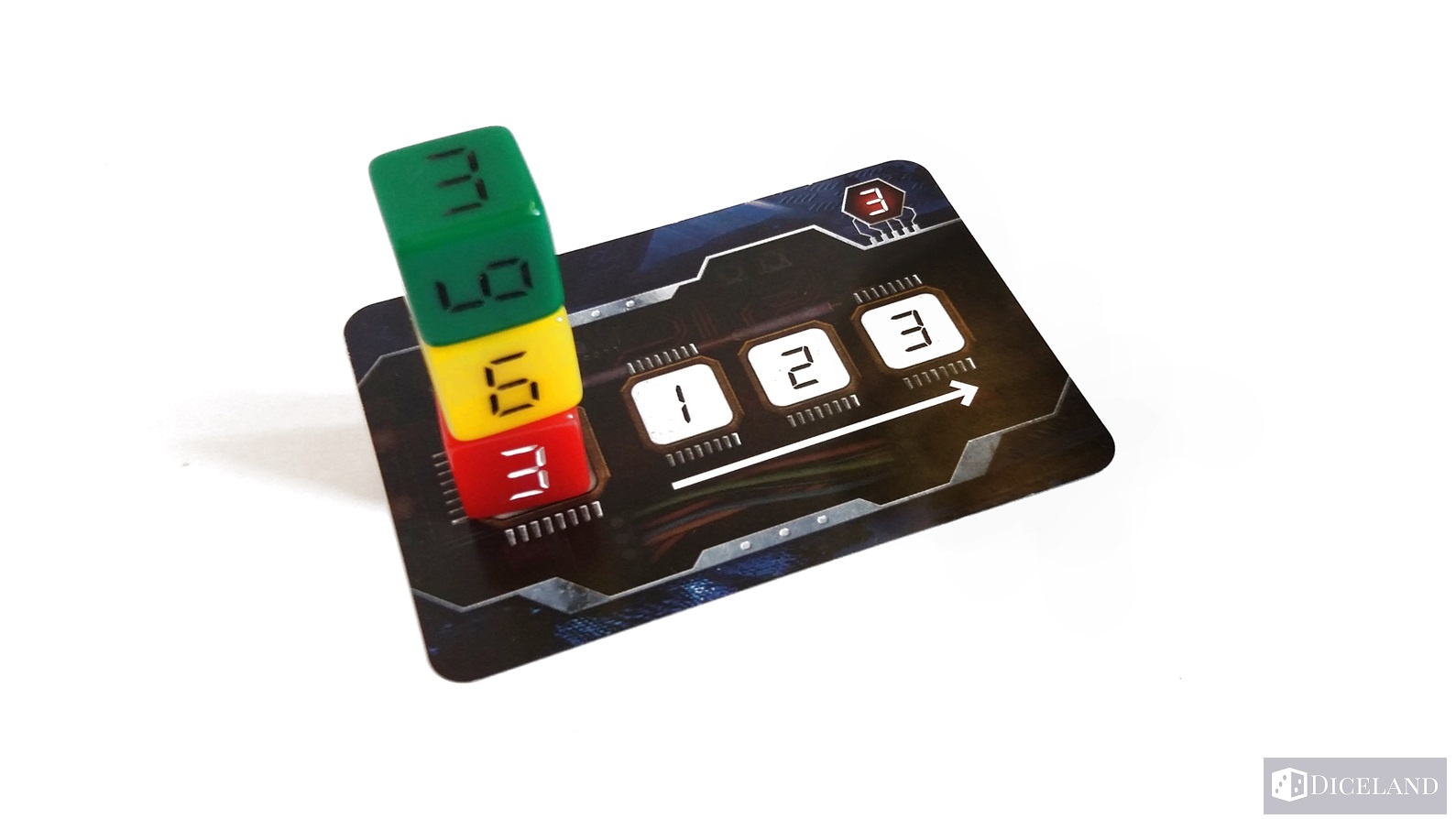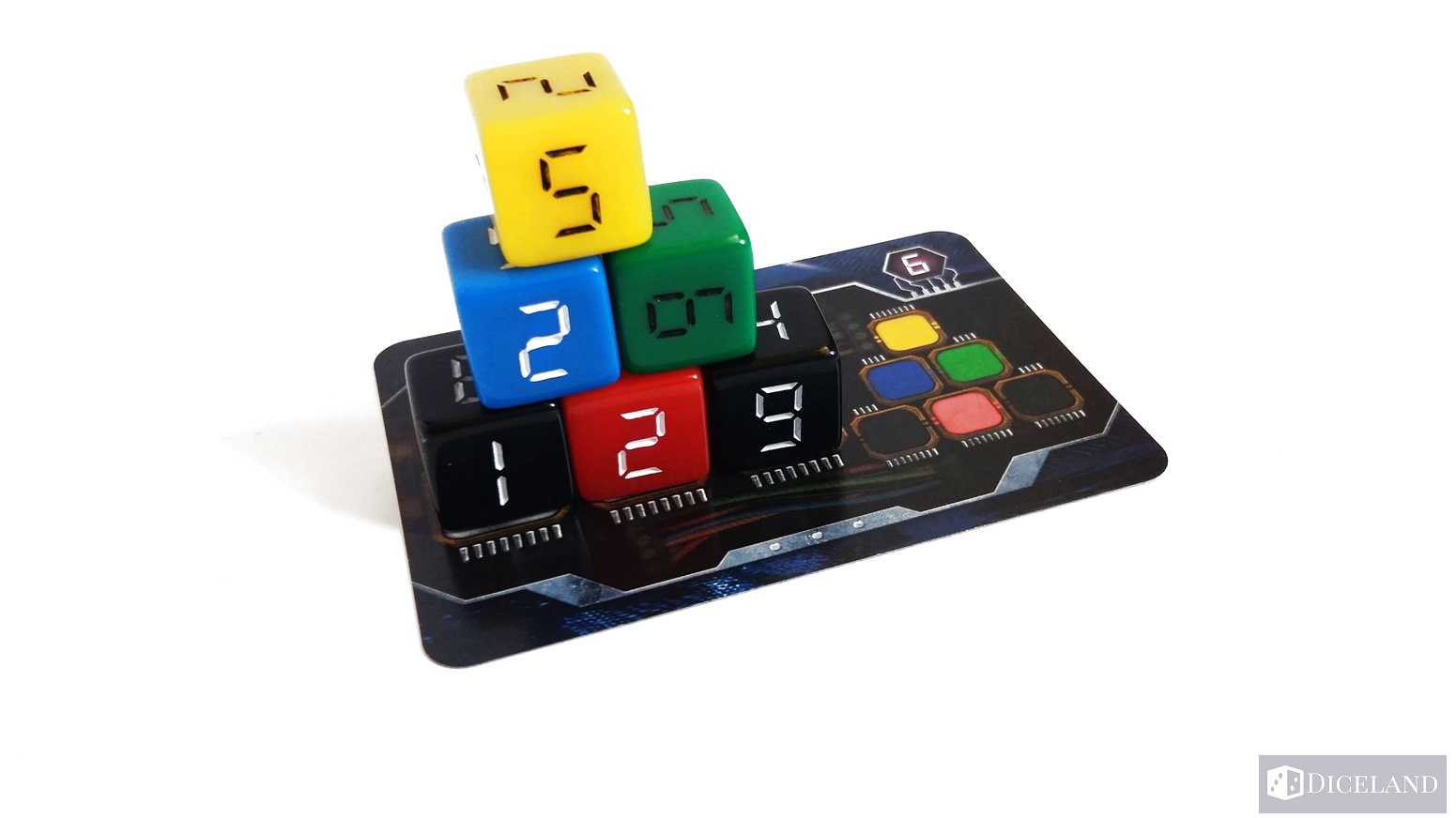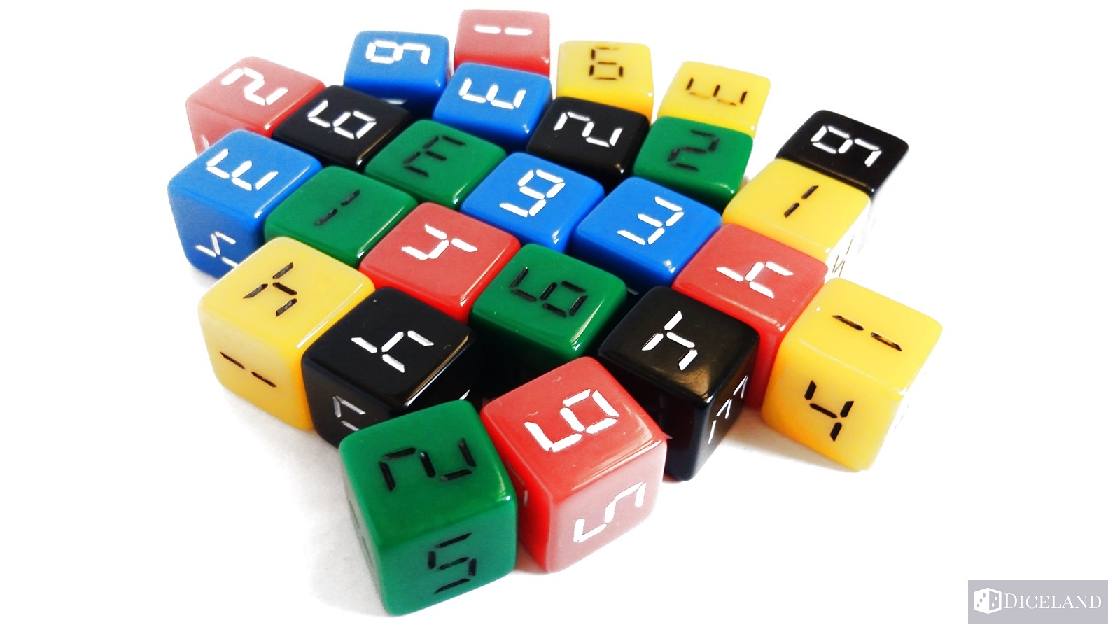 25 kości, które zostały podzielone na pięć kolorów: żółte, niebieskie, zielone, czerwone i czarne – w każdym kolorze po 5 kości. Są one troszkę większego rozmiaru, co oznacza że są cięższe niż standardowe, a oznaczenia od 1 do 6 na nich przypominają cyfry z wyświetlaczy np. zegarów cyfrowych.