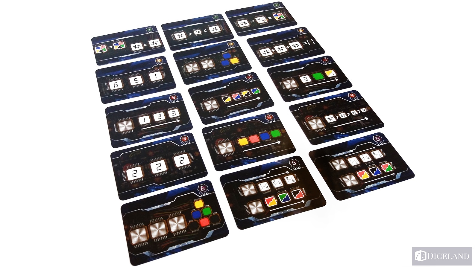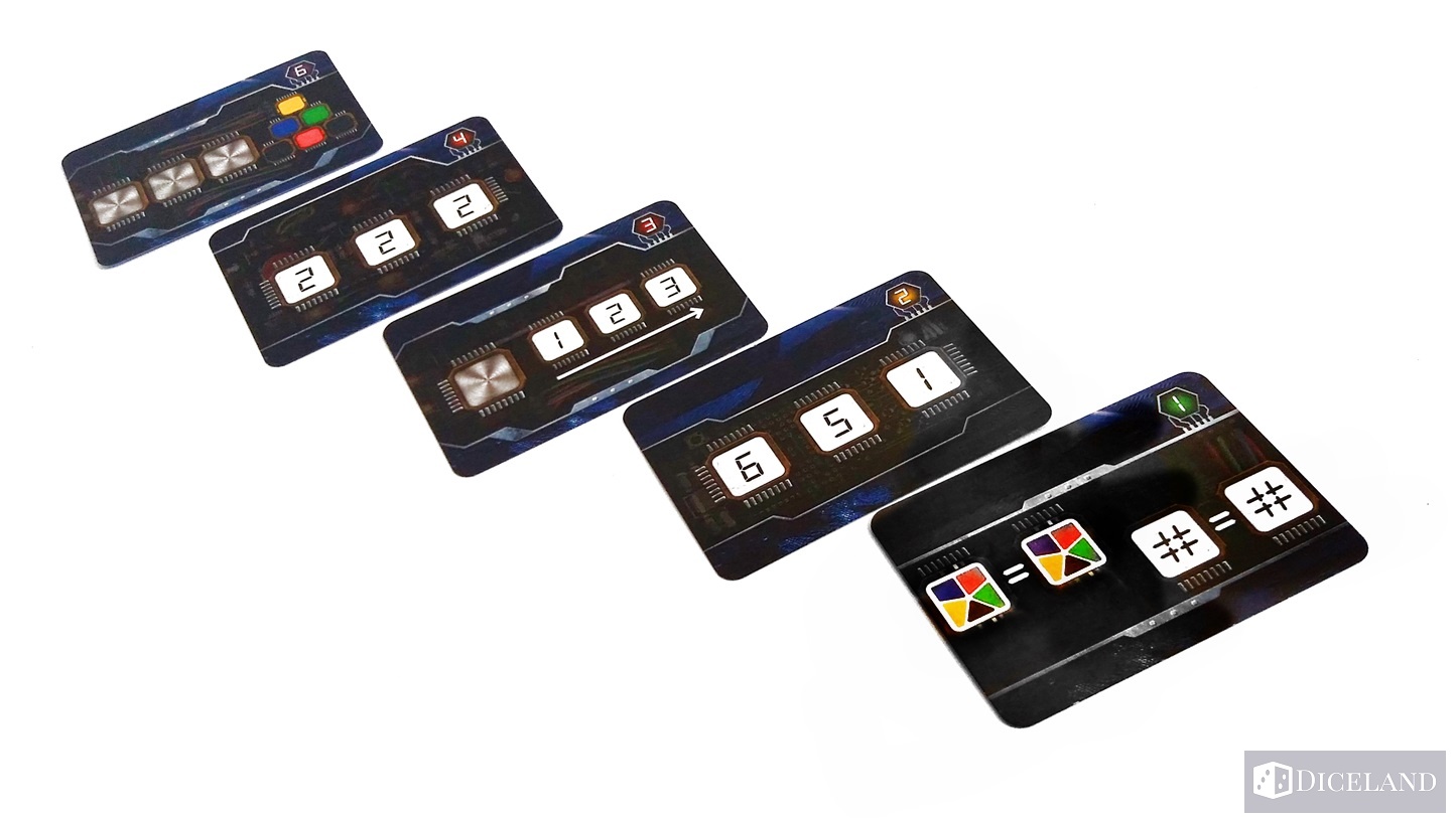 Karty różnią się nie tylko poziomem trudności, ale również mechaniką. Niektóre karty zawierają pola z cyframi, na których możemy ułożyć kości w dowolnych kolorach, z odpowiednią cyfrą, a nie raz trzeba spełnić specjalne warunki.