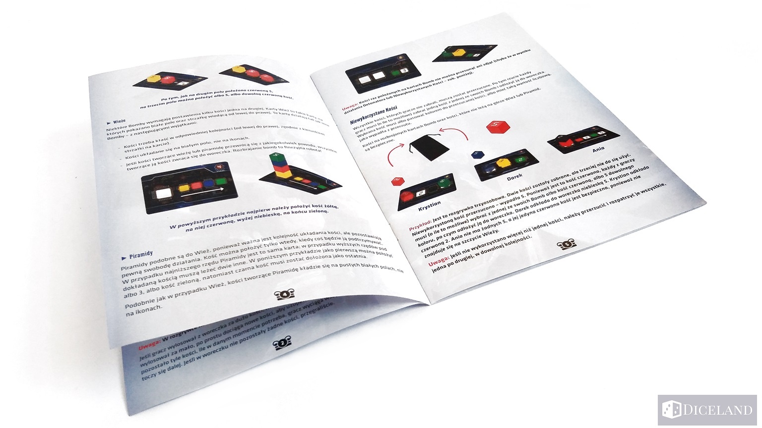 - karty wież – tutaj należy układać odpowiednie kości na jednym polu, tworząc wieżę (w odpowiedniej kolejności, którą wskazuje strzałka),