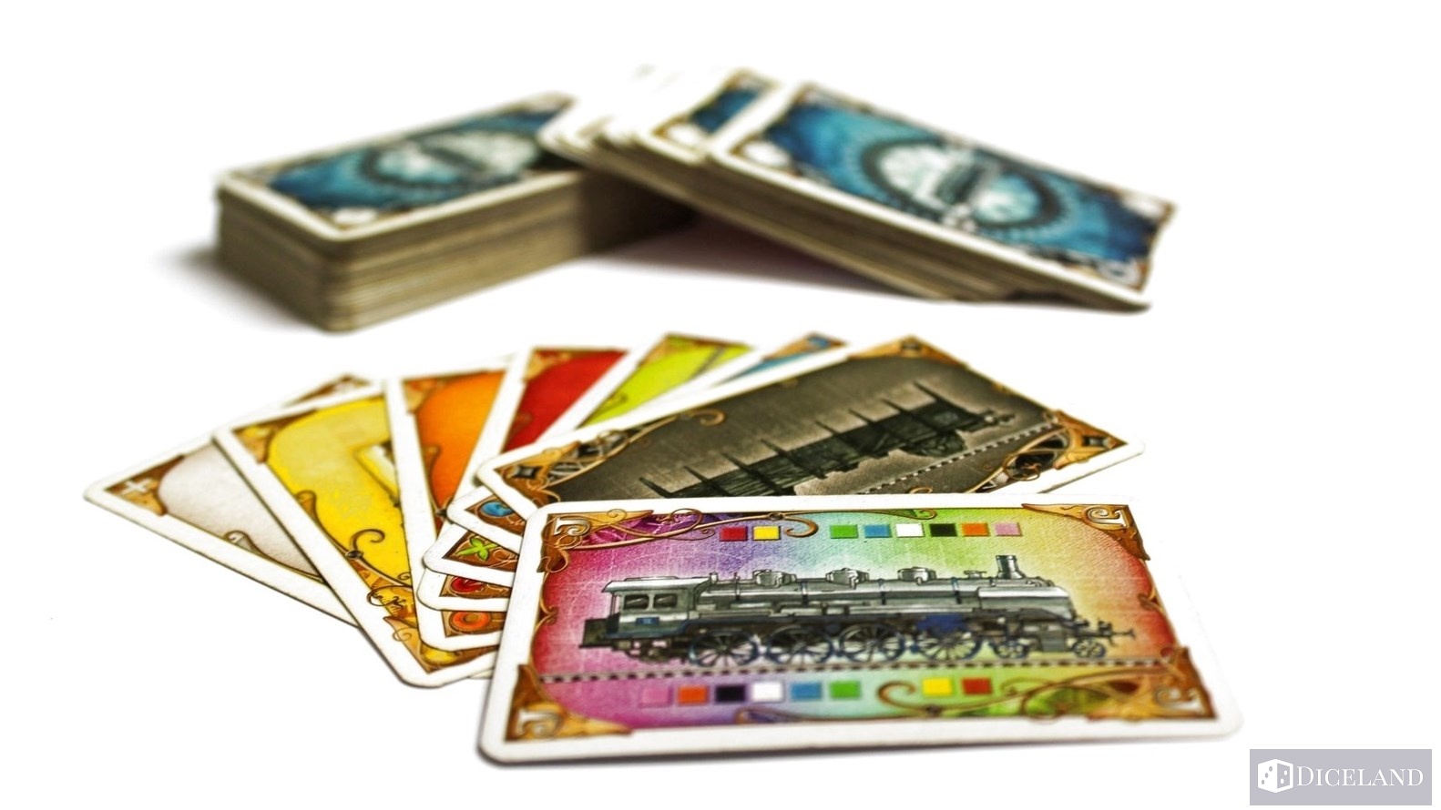 - Tunele – Gdy chcemy wybudować tunel musimy posiadać wymaganą liczbę kart wagonów w określonym kolorze. Następnie odkrywamy trzy karty z wierzchu talii. Jeśli zobaczymy tam kartę w kolorze z jakiego chcemy zbudować połączenie lub lokomotywę, będziemy musieli dołożyć odpowiednio od 1-3 kart danego koloru z ręki. Dopiero wtedy uda nam się przebyć góry.