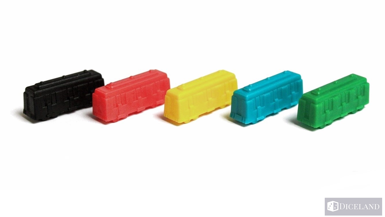 Wspomniane wagoniki wykonane są z dość twardego plastiku, a każdy gracz otrzymuje ich w swoim zestawie kolorystycznym 45. Otrzymujemy także po 3 figurki dworców kolejowych w każdym kolorze oraz kilka zapasowych wagoników. Plastikowe elementy powinny wytrzymać nawet najbardziej zażarte rozgrywki, chyba że w trakcie ich trwania będą poddane działaniu ekstremalnych warunków takich jak np. psie zęby.