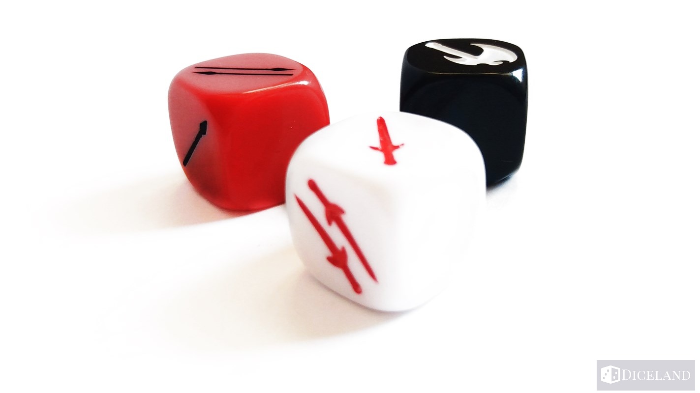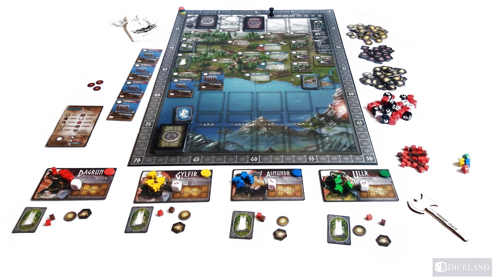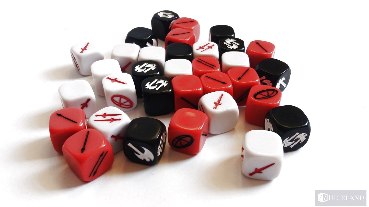 W pudełku znajdziemy również woreczek materiałowy, który służy do przechowywania 34 kości. Został on odblokowany w kampanii na wspieram.to. Kości są ciężkie i solidne, a dodatkowo zostały podzielone na trzy kolory, które oznaczają inny rodzaj wojownika: białe (miecznicy), czerwone (włócznicy) i czarne (topornicy). Każdy rodzaj kości zawiera indywidualne symbole.