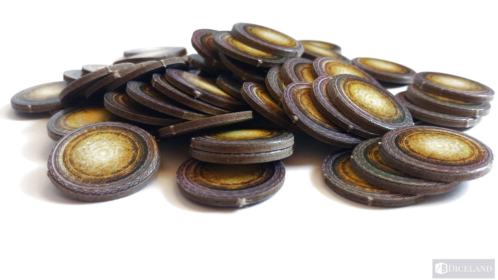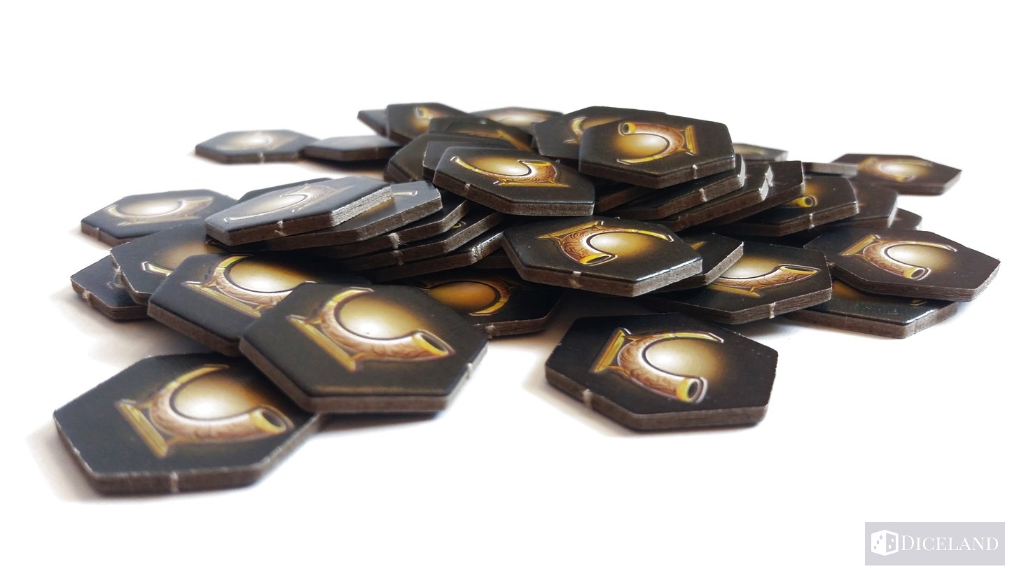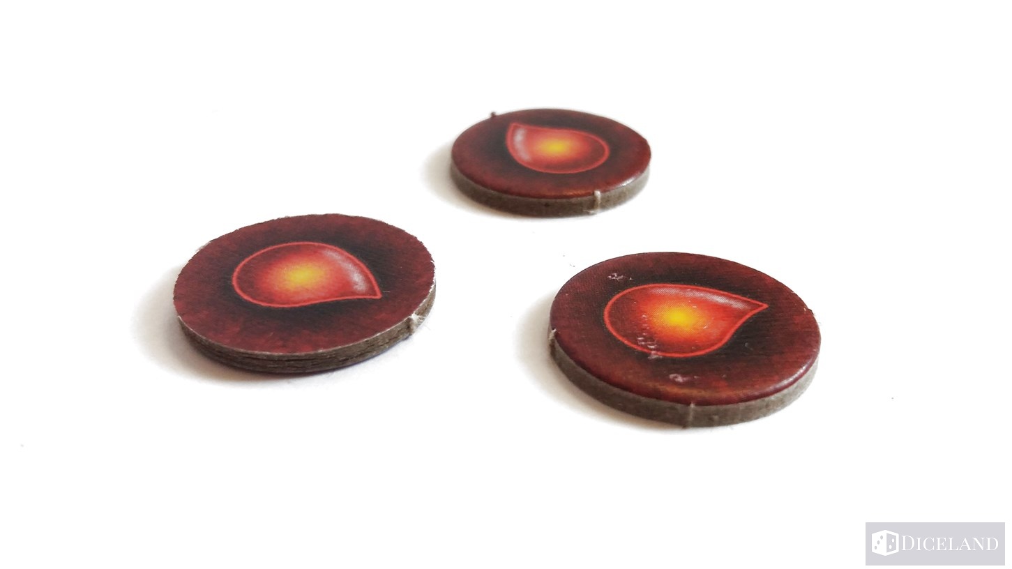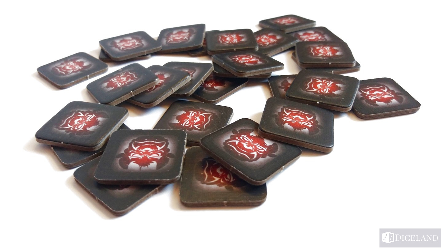 Otrzymujemy oczywiście całą masę solidnych znaczników, a w tym: 54 żetony przysługi, 26 żetonów potępienia, 60 monet oraz 3 żetony obrażeń do zaznaczania ran w walce z potworami.