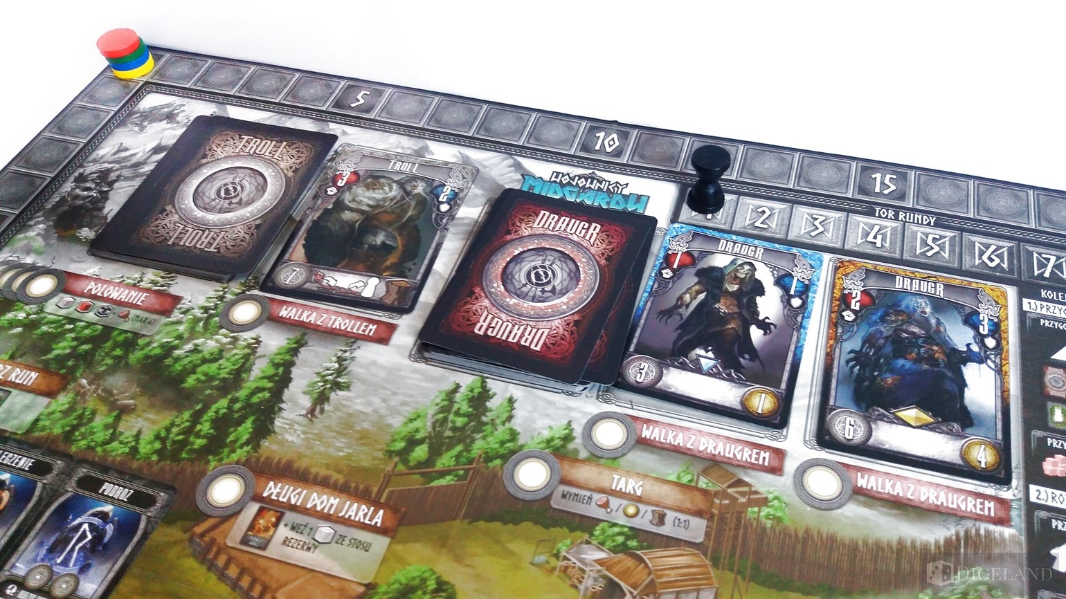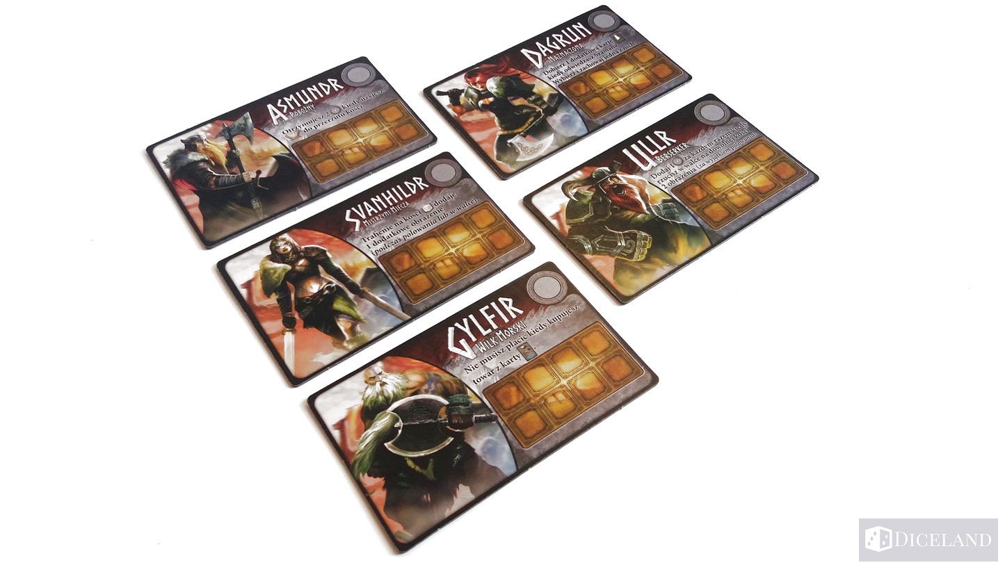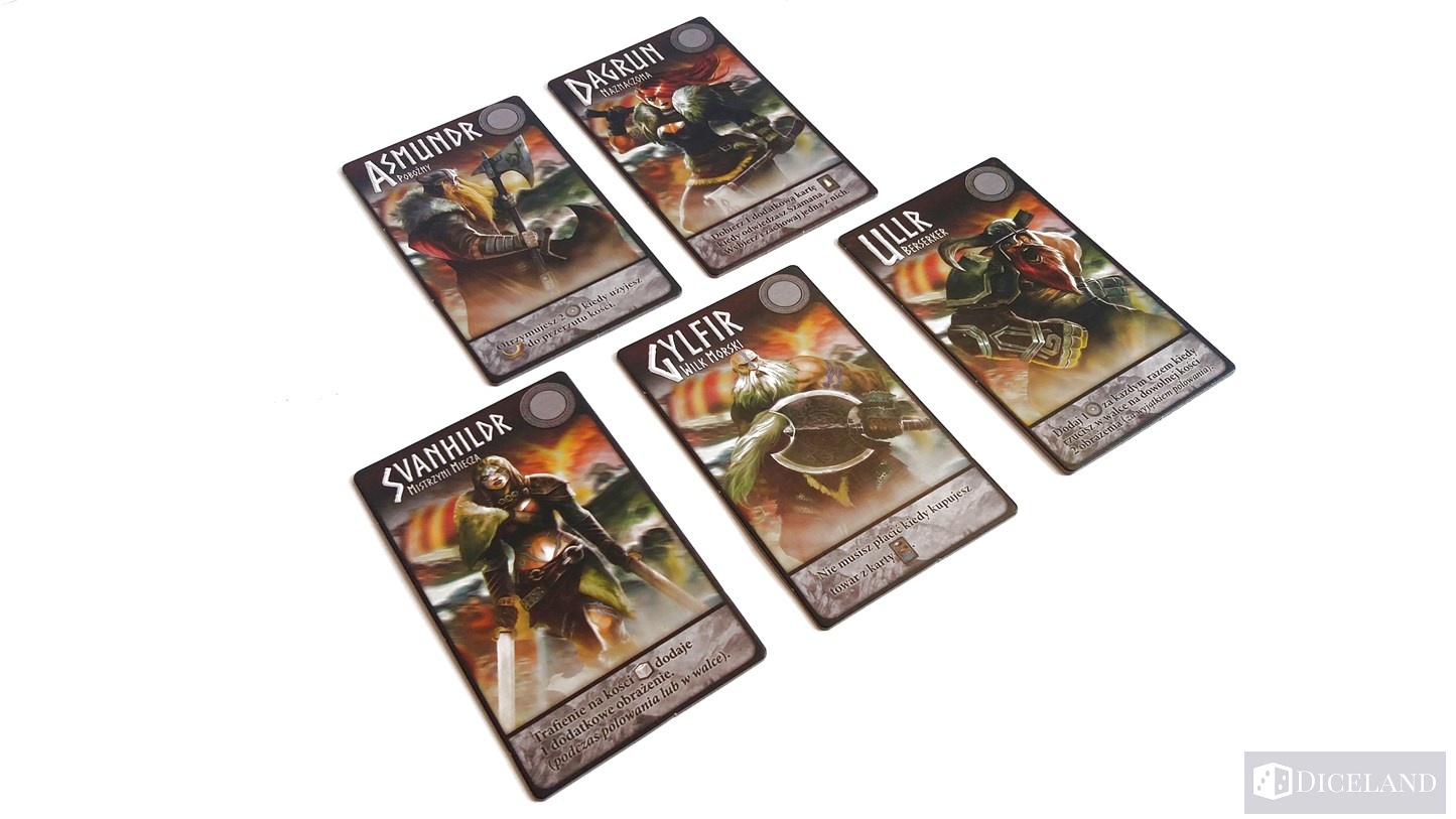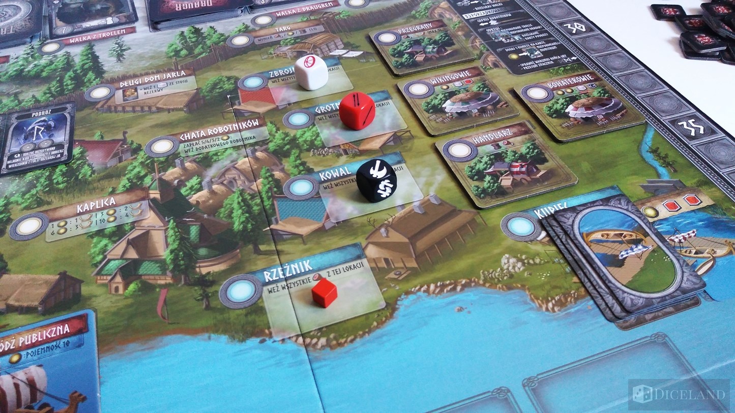 Pola na których będziemy toczyli walki to: polowanie, Trolle, dwa pola Draugrów i łodzie służące do walki z monstrami. W każdej rozgrywce pojawiają się jeszcze różne stragany, na których możemy wykonywać dodatkowe akcje. Kości naszych wojowników będziemy przechowywali na karcie naszej postaci – maksymalnie 8 sztuk.