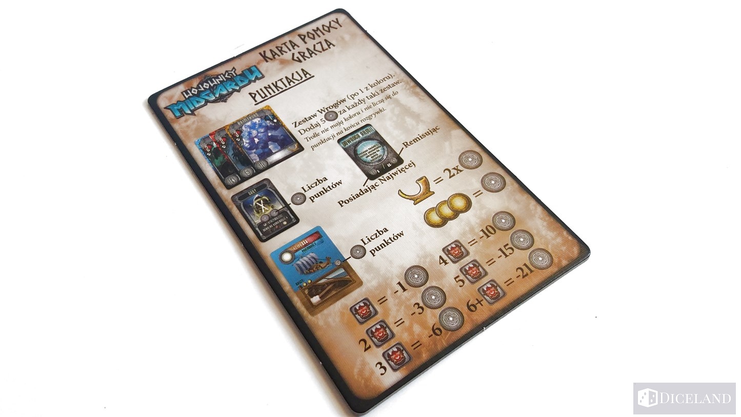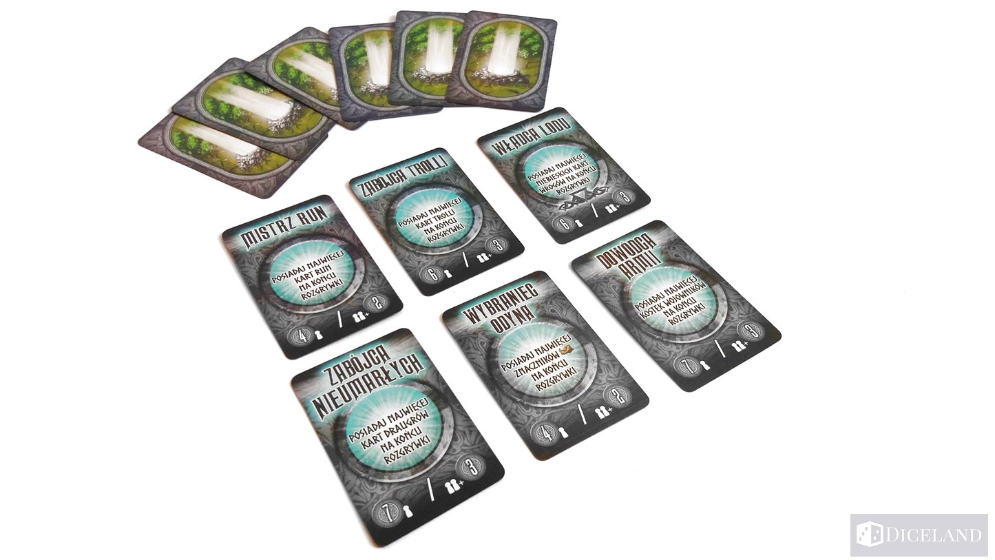 Czas gry oscyluje w granicach godzinki (przy większej liczbie minimalnie się wydłuża). Downtime nie jest specjalnie odczuwalny, gdyż w turze innego gracza możemy już się zastanawiać nad naszym kolejnym zagraniem, a także trzymać kciuki za porażkę w potyczkach naszych rywali. Bardzo ciekawym elementem są karty przeznaczenia, które pełnią rolę mini-zadań do wykonania podczas gry (posiadaj na koniec najwięcej pokonanych trolli, posiadaj najwięcej jedzenia itd). Sprawia to, że musimy nieco zmieniać nasze zagrania, celem ich wykonania. Jednorazowe runy potrafią nam nieraz uratować tyłek w ciężkich sytuacjach, a dodatkowo punktują na koniec gry. Najciekawszym elementem gry są jednak walki, a szczególnie te za morzem. Szkoda tylko, że meeple są po prostu meeplami, a nie czymś na wzór walecznych wikingów.