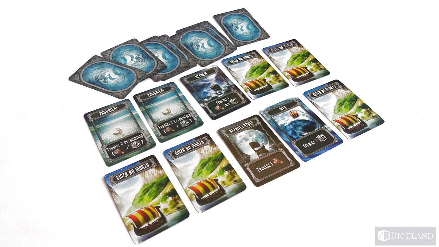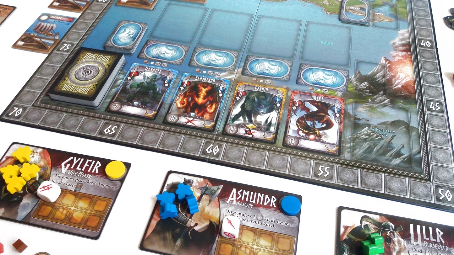 Natomiast wracając do samej grafiki, to autor ilustracji w tym przypadku spisał się na medal. Na północy widać zaśnieżone góry i jaskinie z której prawdopodobnie wychodzą Trolle – znalazło się tam miejsce na umieszczenie kart potworów. Zaraz poniżej znajduje się wioska, w której mieści się wiele pożytecznych budynków, do których będziemy wysyłali naszych robotników. Idąc w stronę południa przechodzimy do portu, za którym rozciągają się niezbadane wody. To właśnie tam będziemy przeżywali najwspanialsze przygody, gdyż na odległych ziemiach, czyhać będą na nas przerażające monstra, które swoją siłą przewyższają wszystko, co do tej pory wikingowie spotkali na swojej drodze. Nagroda jednak jest równie wysoka.