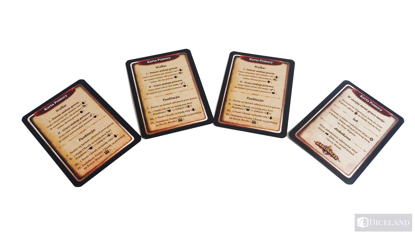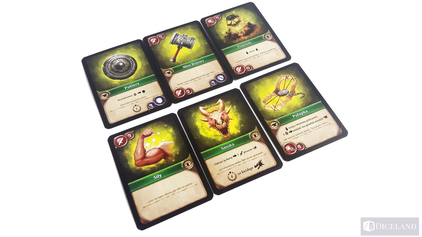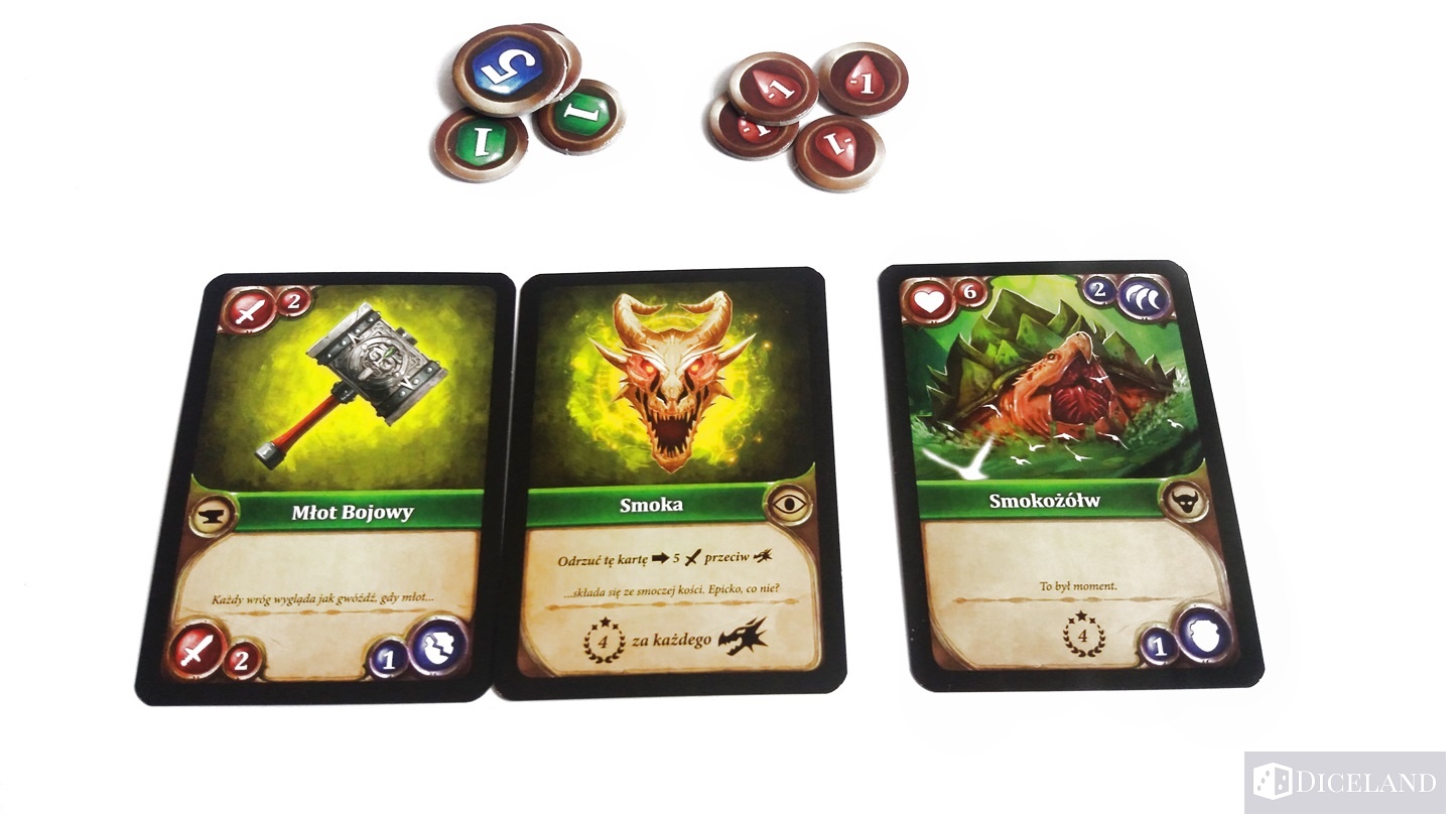 Bardzo fajnie, że twórcy gry pokusili się o dodatkowy smaczek w postaci akcentów humorystycznych. Na każdej karcie broni i zaklęcia znajdziemy fragment tekstu, który w połączeniu z drugą kartą tworzy mniej lub bardziej logiczną całość. Z całą pewnością niektóre połączenia naprawdę potrafią rozbawić. Oprócz wcześniej wspomnianego utraconego potencjału grafik na wioskach, dostrzegłem wadę w postaci bardzo często pojawiających się potworów „najniższego szczebla” jest ich zdecydowanie za dużo, a rozwiązanie tego problemu pojawiło się właśnie w edycji zagranicznej, gdzie kosztem dwóch najsłabszych potworów – pojawiły się dwa bardzo silne, które stanowią przedsmak walki ze smokiem. Należy również wspomnieć o złym doborze kolorów rewersów kart, twórcy mogli się pokusić o nieco inne barwy lub symbole na poszczególnych kartach. Jak dobrze się domyślacie tą mini wadę twórcy również poprawili w wydaniu zagranicznym. Jednakże wszystkie wcześniej wspomniane wady, nie psują ostatecznego werdyktu i nie mają żadnego wpływu na doznania płynące z samej rozgrywki.