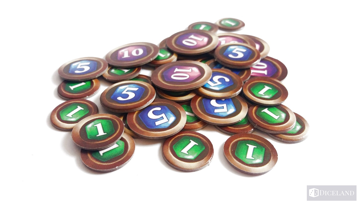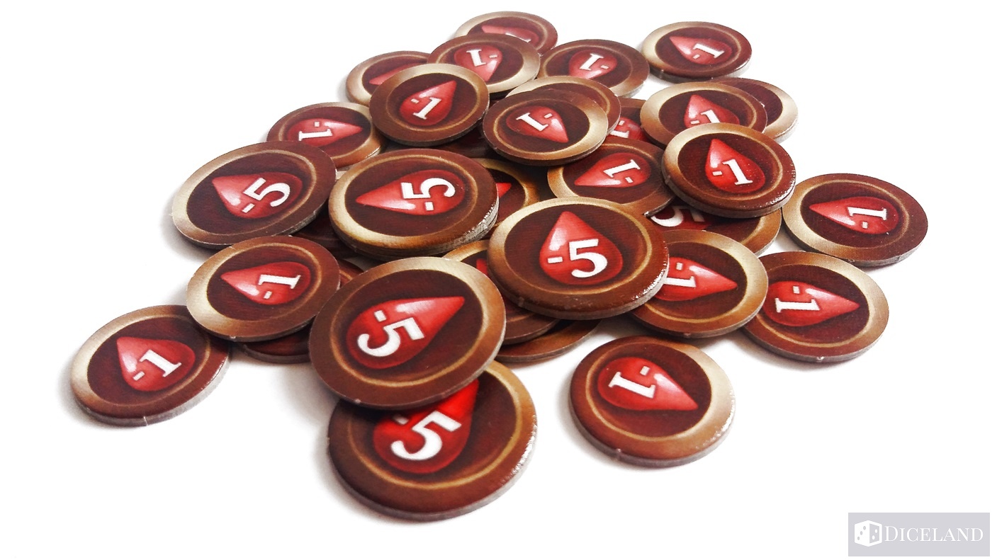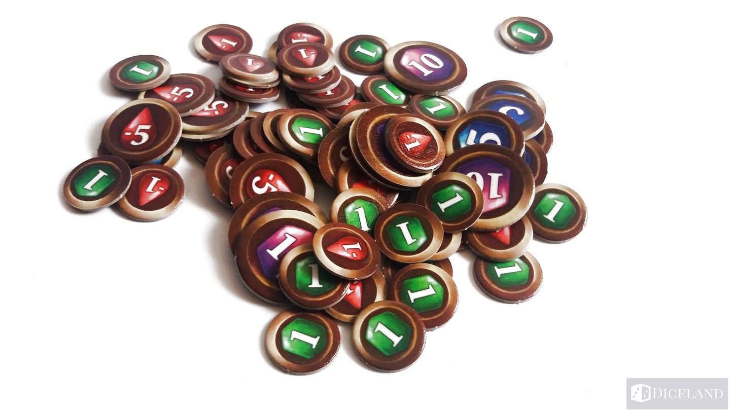 Ostatnim elementem w grze są żetony. Otrzymujemy 33 żetony ran w dwóch wartościach (-1 i -5) oraz 40 żetonów kryształów w trzech nominałach (1, 5, 10).