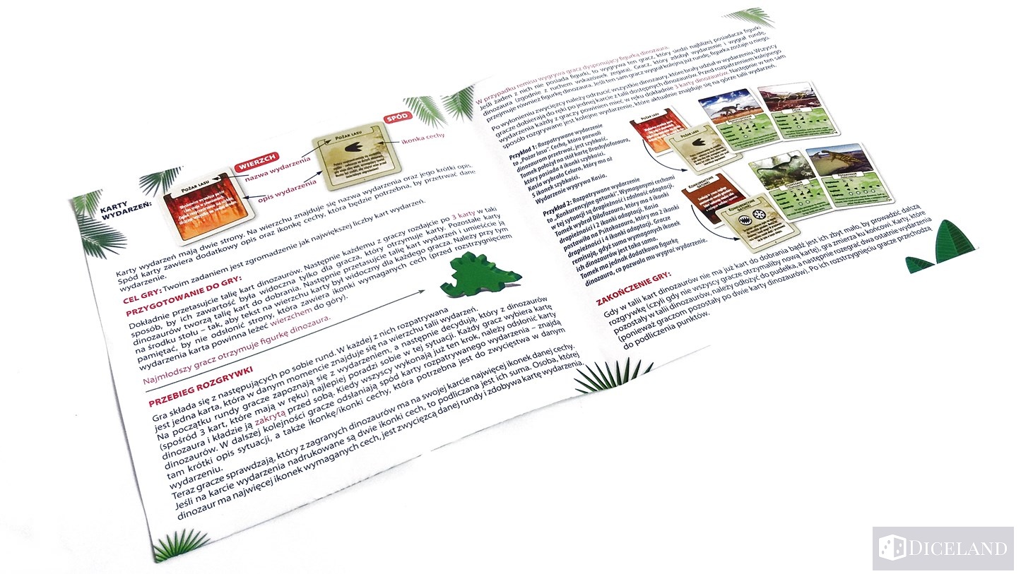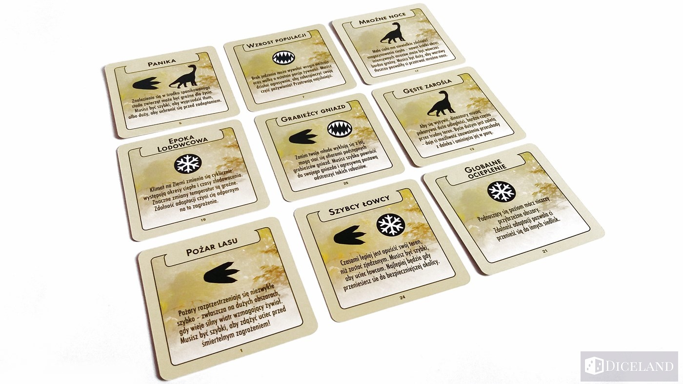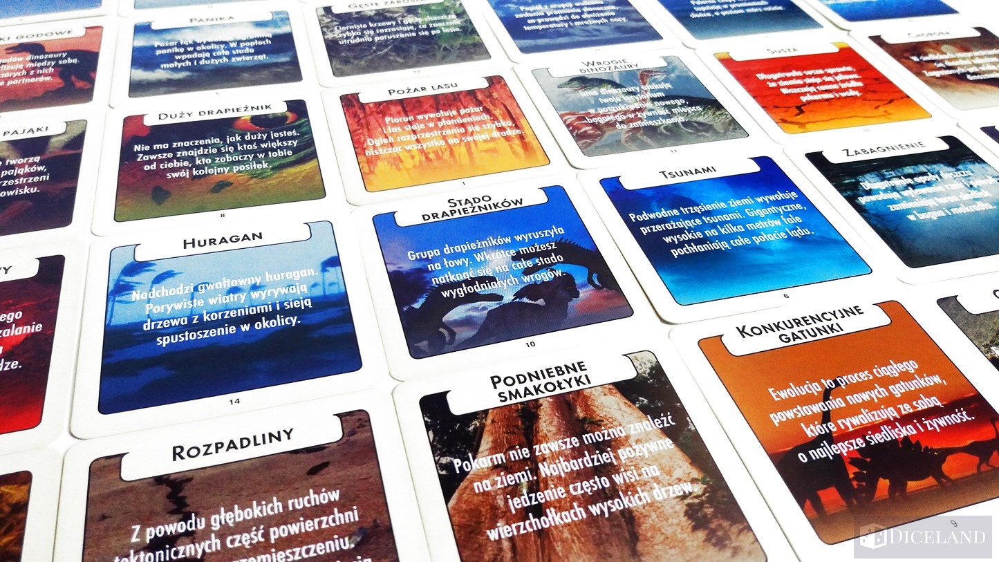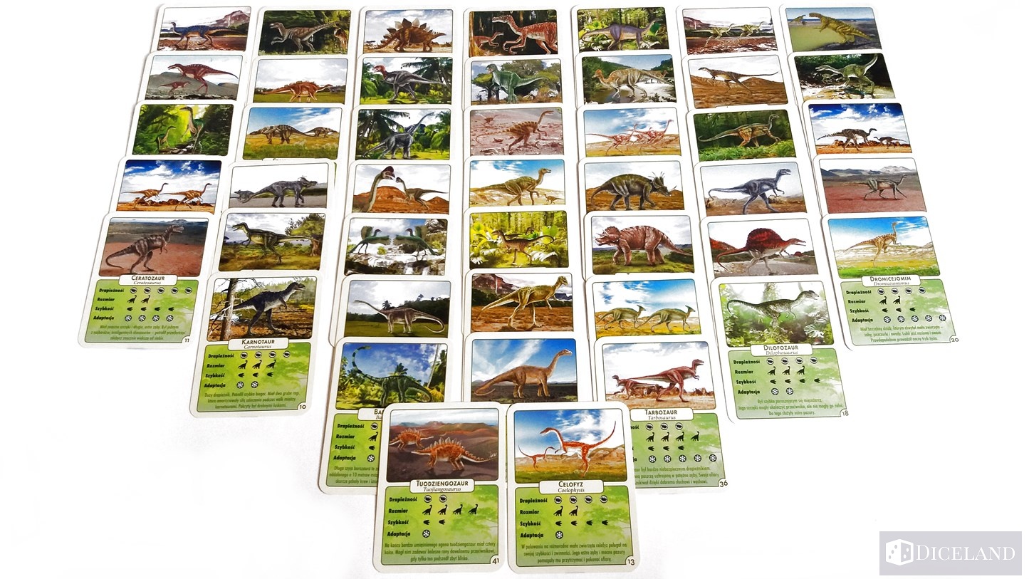 Najważniejszym elementem gry są karty. W pudełku znajdziemy 45 kart dinozaurów z ładnymi ich ilustracjami, cechami oraz opisem. Oprócz tego, otrzymujemy również 30 kart wydarzeń, na których znajdziemy opis różnych sytuacji, które mogły mieć miejsce w epoce dinozaurów. Na ich odwrocie znajdziemy skutek tego wydarzenia i cechę, która jest niezbędna do jego rozpatrzenia. Karty wydarzeń są nieco mniejsze od kart dinozaurów.