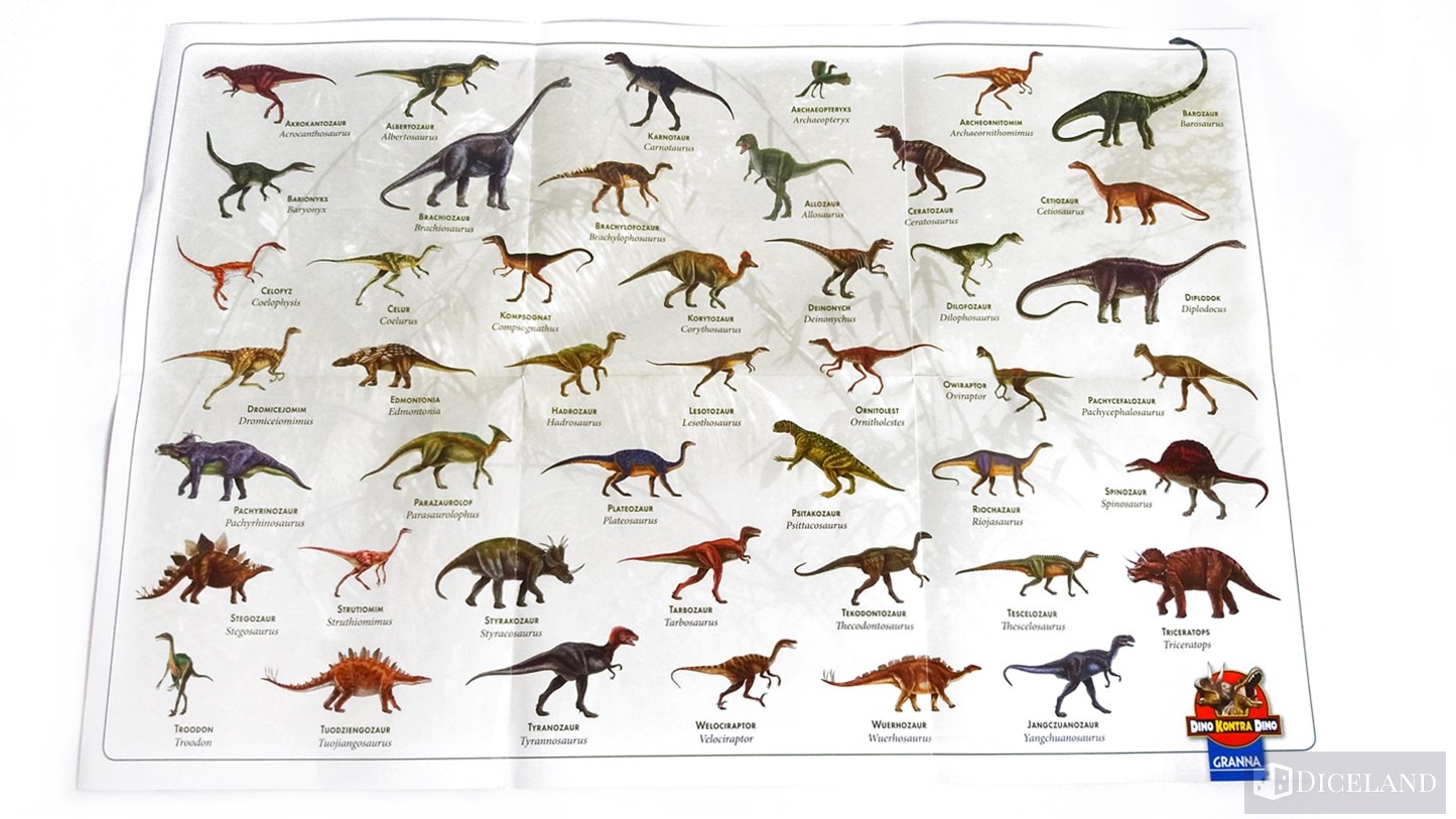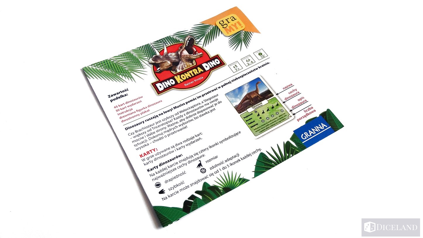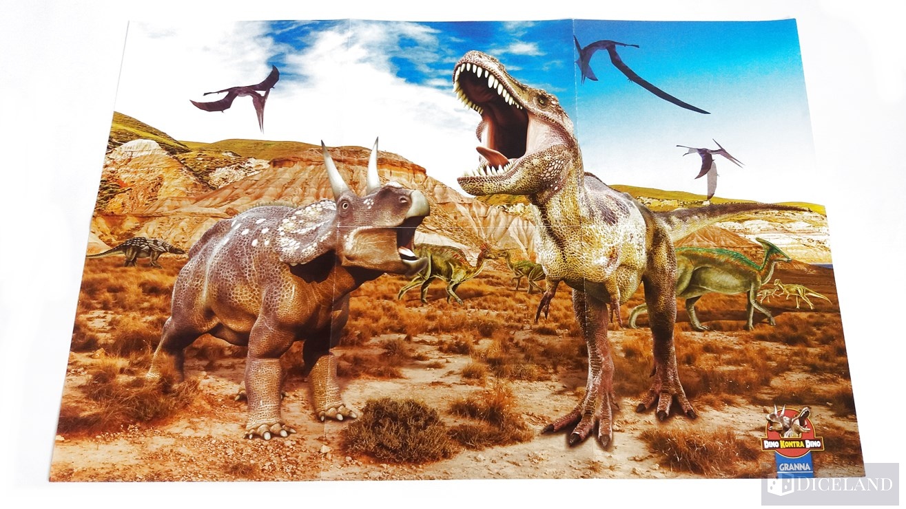 Dino kontra Dino, to gra, która z całą pewnością spodoba się najmłodszym graczom, a zwłaszcza chłopakom. Jak byłem młodszy to bardzo interesowały mnie dinozaury i wtedy też chętnie zagrywałbym się w tę grę. Wykonanie gry stoi na wysokim poziomie, karty są ładnie ilustrowane, czytelne i zawierają ciekawe informacje o dinozaurach. Karty wydarzeń również zawierają pewną ilustrację, która ma symbolizować dane wydarzenie – są one poprawne. Plakat jak to plakat, jest wykonany z papieru, ale cieszy fakt, że został on dodany jako bonus, który z pewnością przypadnie do gustu maluchom. Boli natomiast pusta przestrzeń w pudełku i pomimo zastosowania tekturowej wkładki, nadal jest tam o wiele za dużo powietrza. Pudełko mogłoby być przynajmniej dwukrotnie mniejsze i nadal wszystko miało swoje miejsce. Do gry nie zostały dołączone również woreczki strunowe na karty, przez co latają one luźno w pudełku.