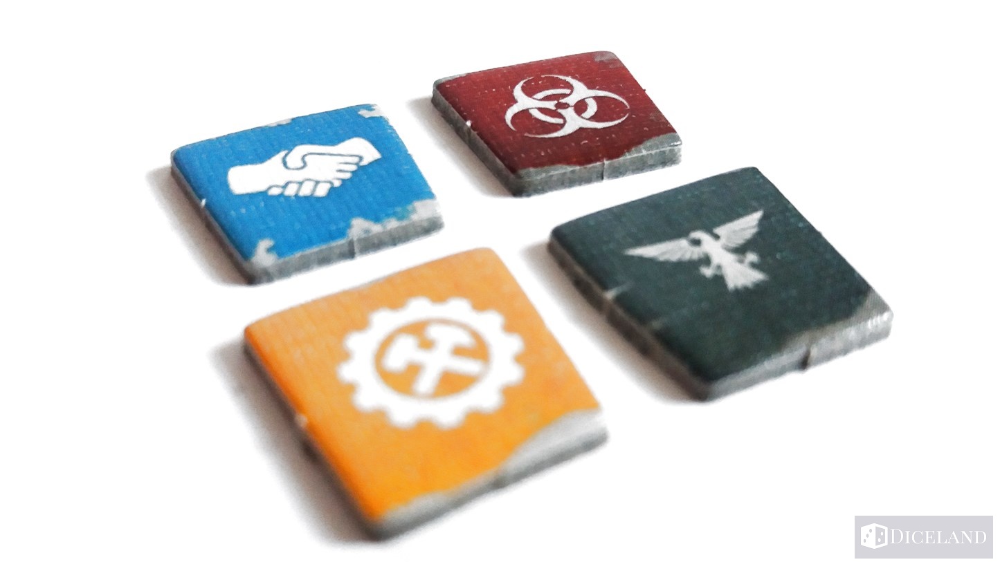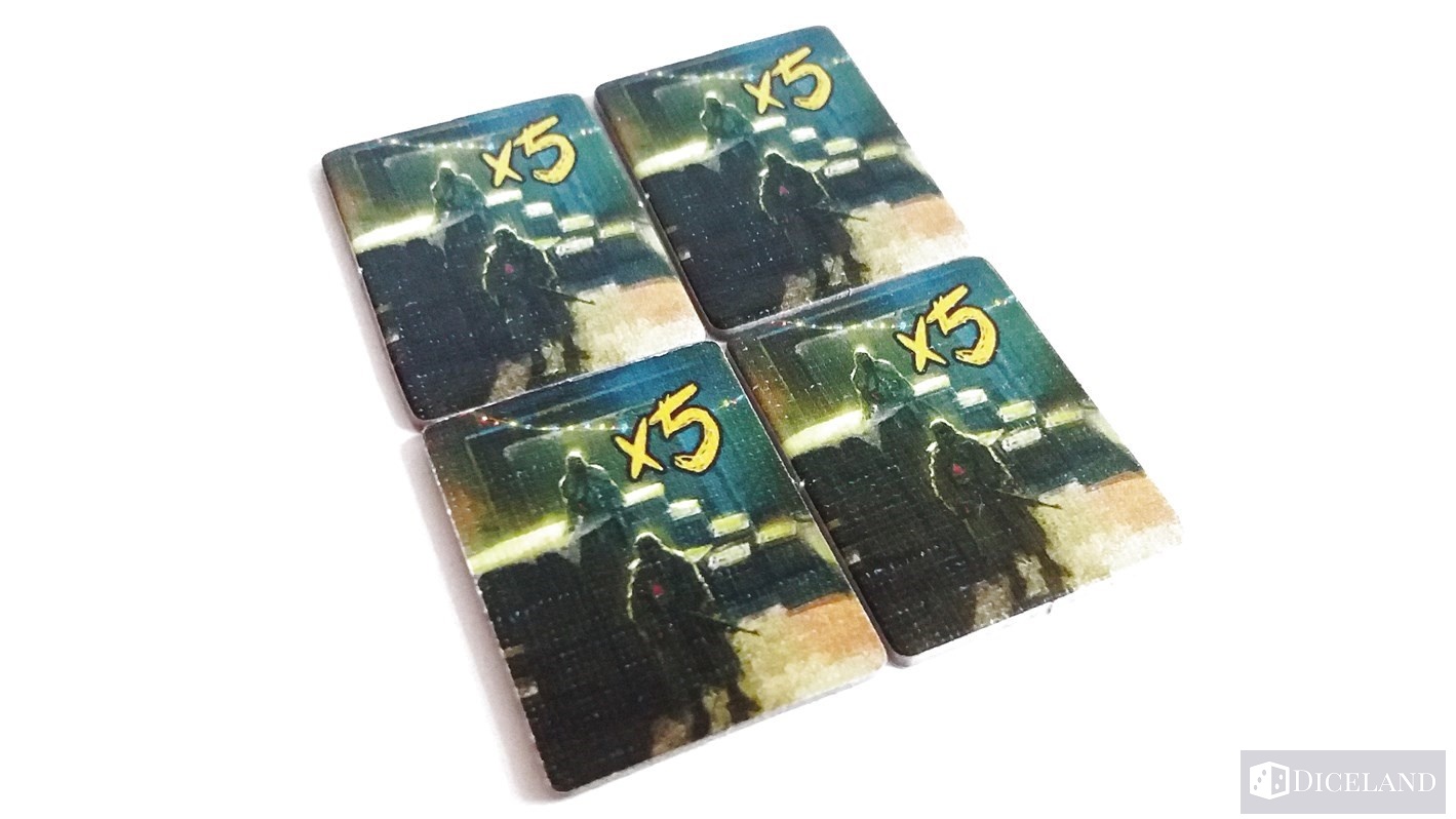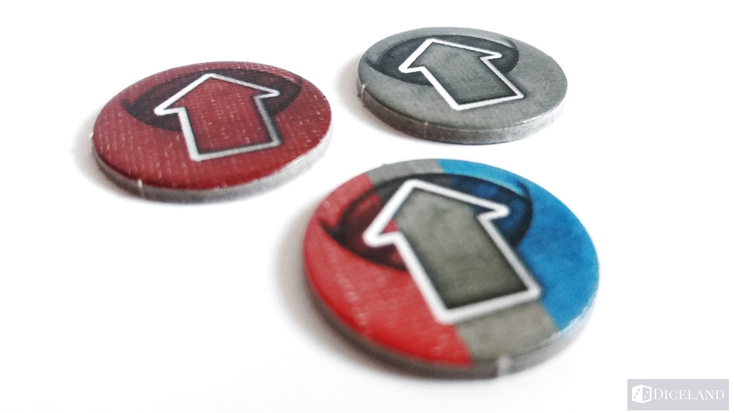 Do gry dołączony jest również tor punktacji oraz kilka dodatkowych żetonów: tarczy, przebudowy, mnożenia, naboi, 4 żetony punktacji po jednym dla każdej frakcji, żeton pierwszego gracza oraz żeton „właściciela gry”.