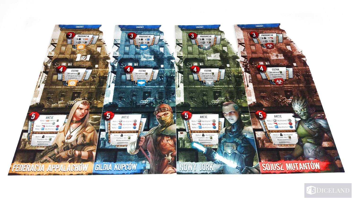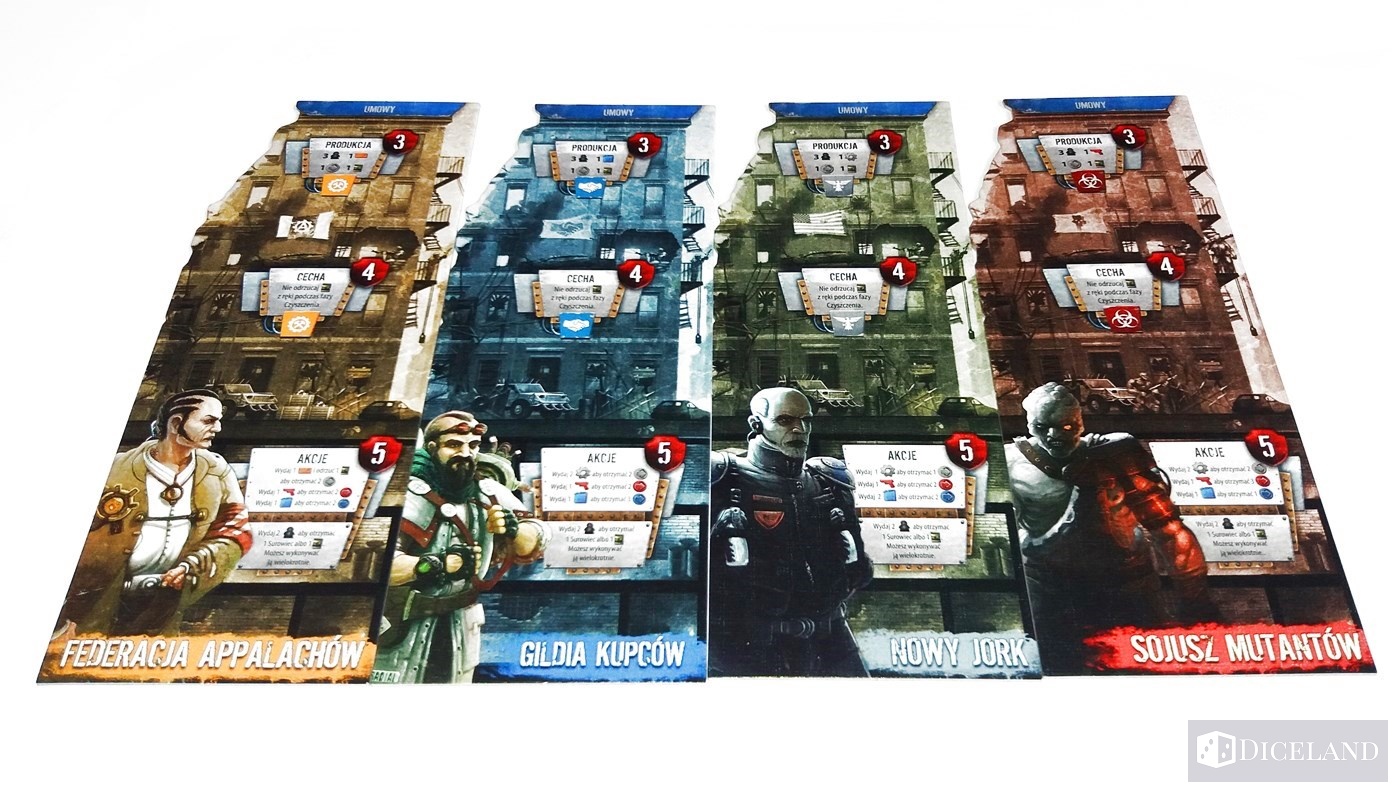 Cztery dwustronne plansze frakcji ze stroną męską i żeńską. Przyjdzie nam prowadzić Gildię Kupców, Nowy Jork, Sojusz Mutantów, i Federację Appalachów – każda z nich nieco różni się od siebie produkowanymi dobrami oraz dostępnymi akcjami. Plansze frakcji są wykonane klimatycznie, a dodatkowo zostały specjalnie pozbawione rogu, by oddać klimat zrujnowanego budynku – ciekawy zabieg.