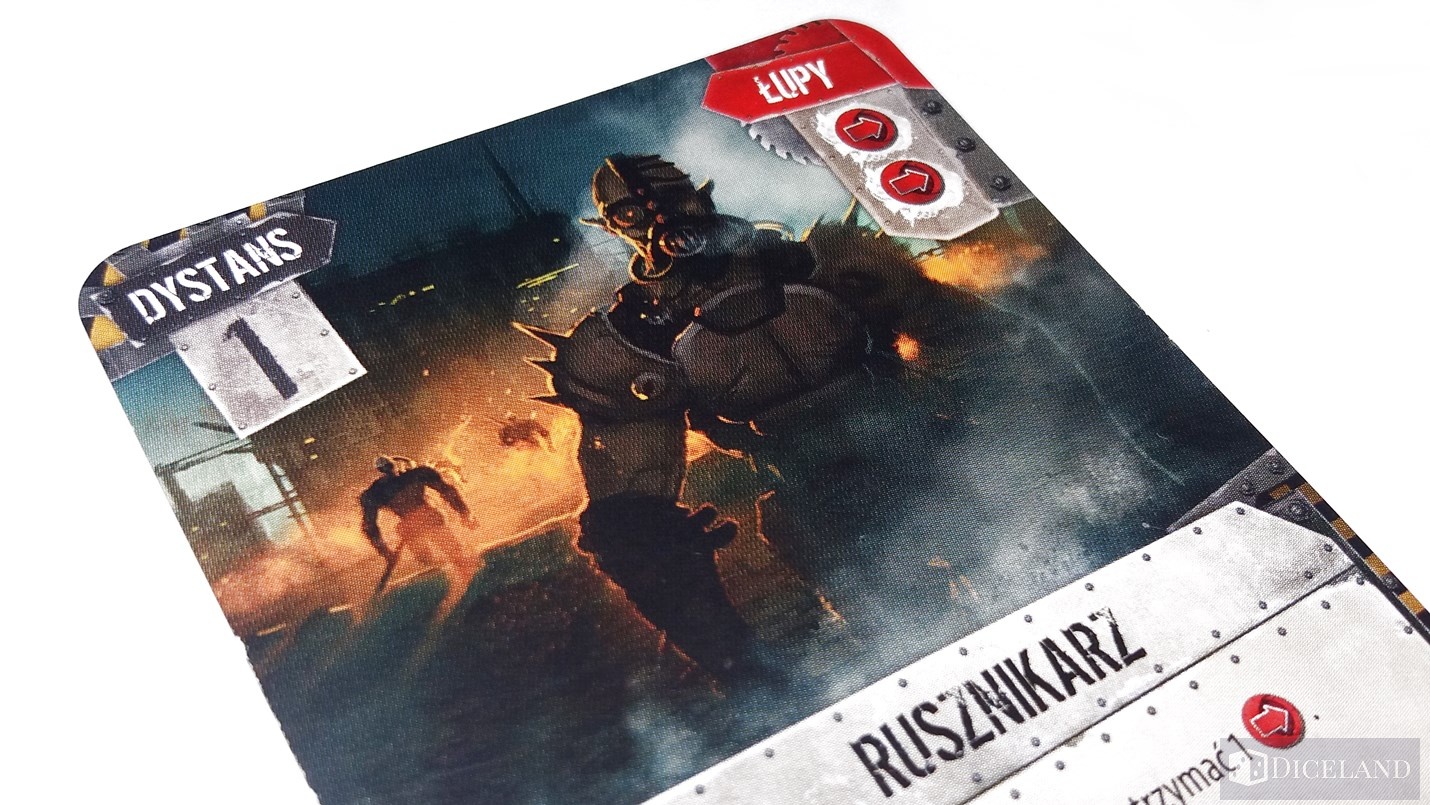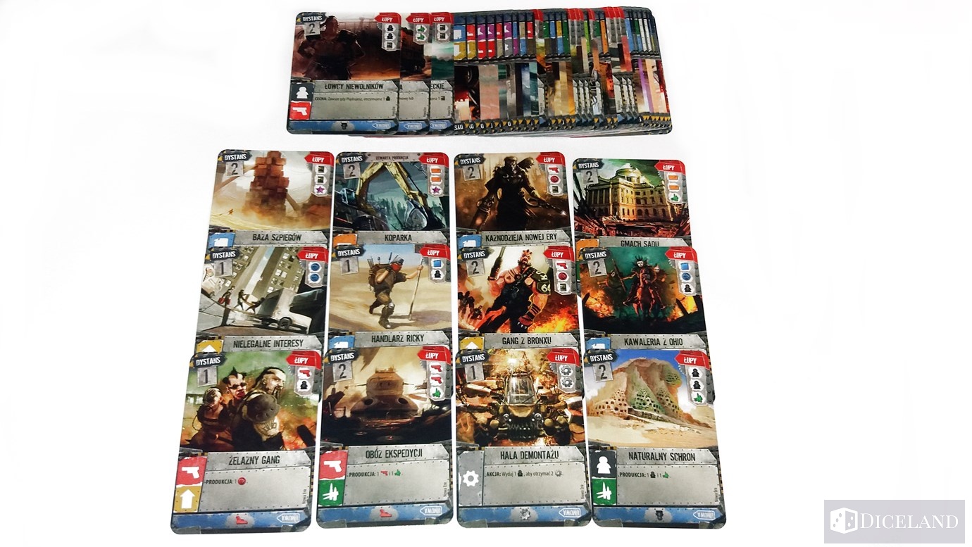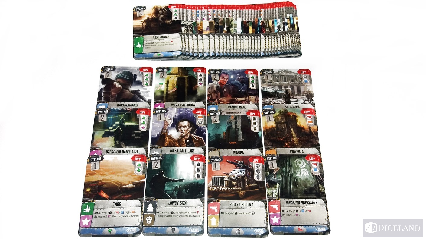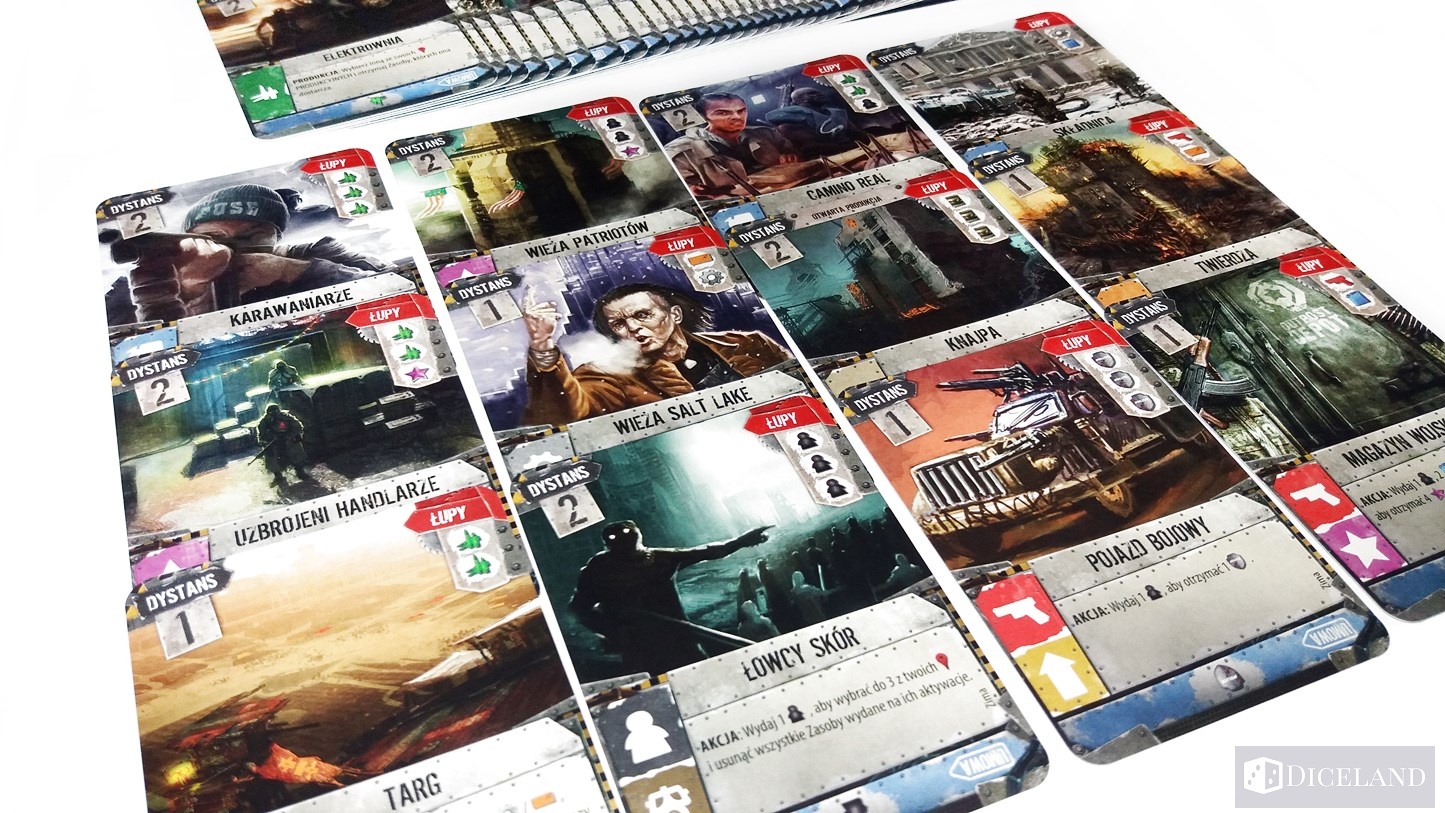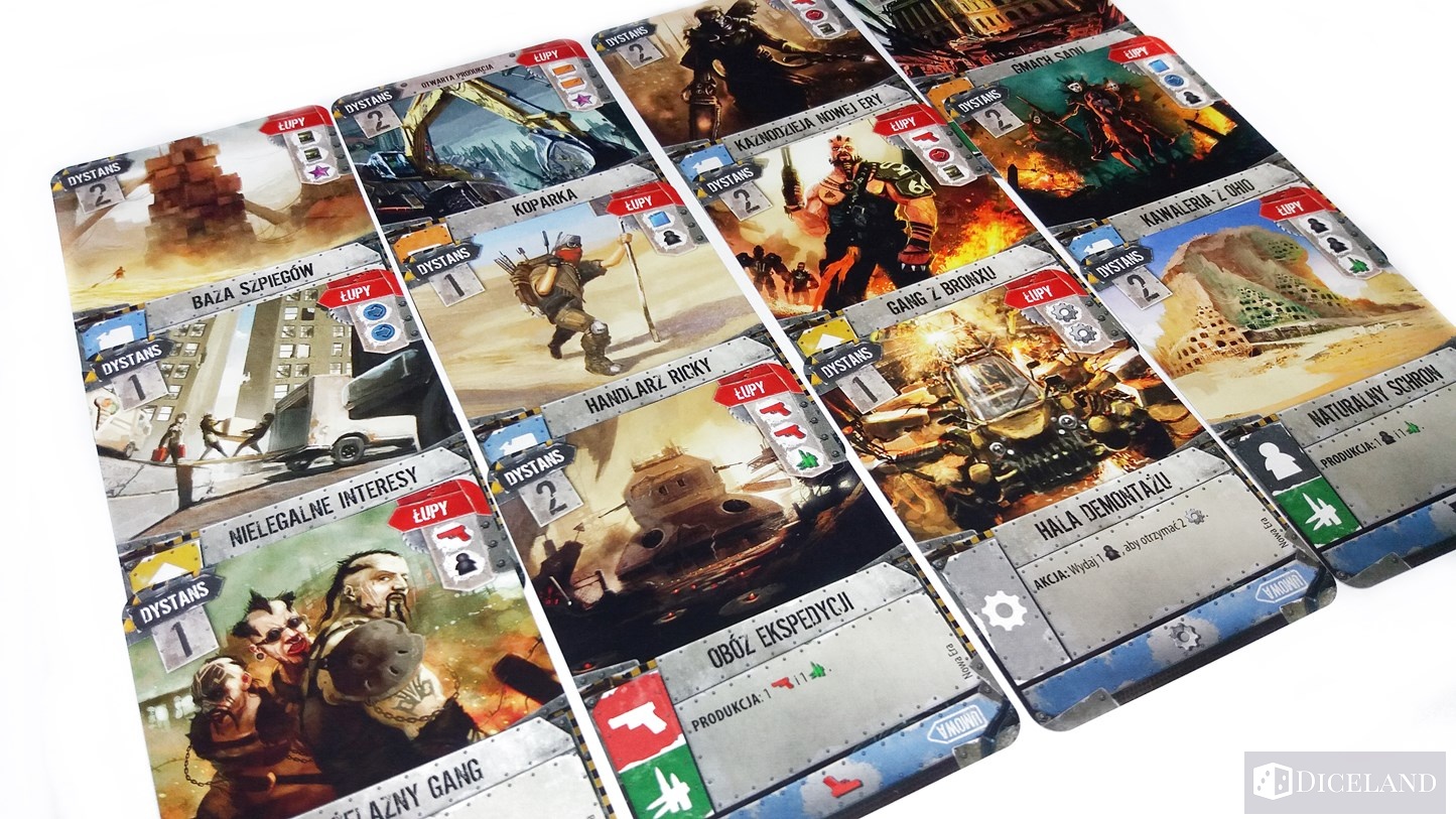 Czy mechanicznie gra oddaje klimat zniszczonego świata? Jak najbardziej. Dzięki różnym zasobom będziemy starali się wyprodukować kolejne żetony kontaktu, a dzięki nim podbijemy nowe obszary, które będą należeć do naszej frakcji. Interpretuje to na zasadzie, przygotowania do wyprawy, na którą musimy zebrać odpowiednie materiały, by ostatecznie wyruszyć na podboje. Z lokacjami będziemy podpisywali umowy, albo co gorsza – splądrujemy je, by zdobyć cenne zasoby. Dosyć często wyruszymy również na terytorium wroga, by dokonać sabotażu i zamienić jego cenną lokację w ruiny. Wróg natomiast, może przekształcić je w coś nowego, coś o wiele lepszego. Grafiki na kartach przypominają mi zdecydowanie klimat filmu Mad Max.