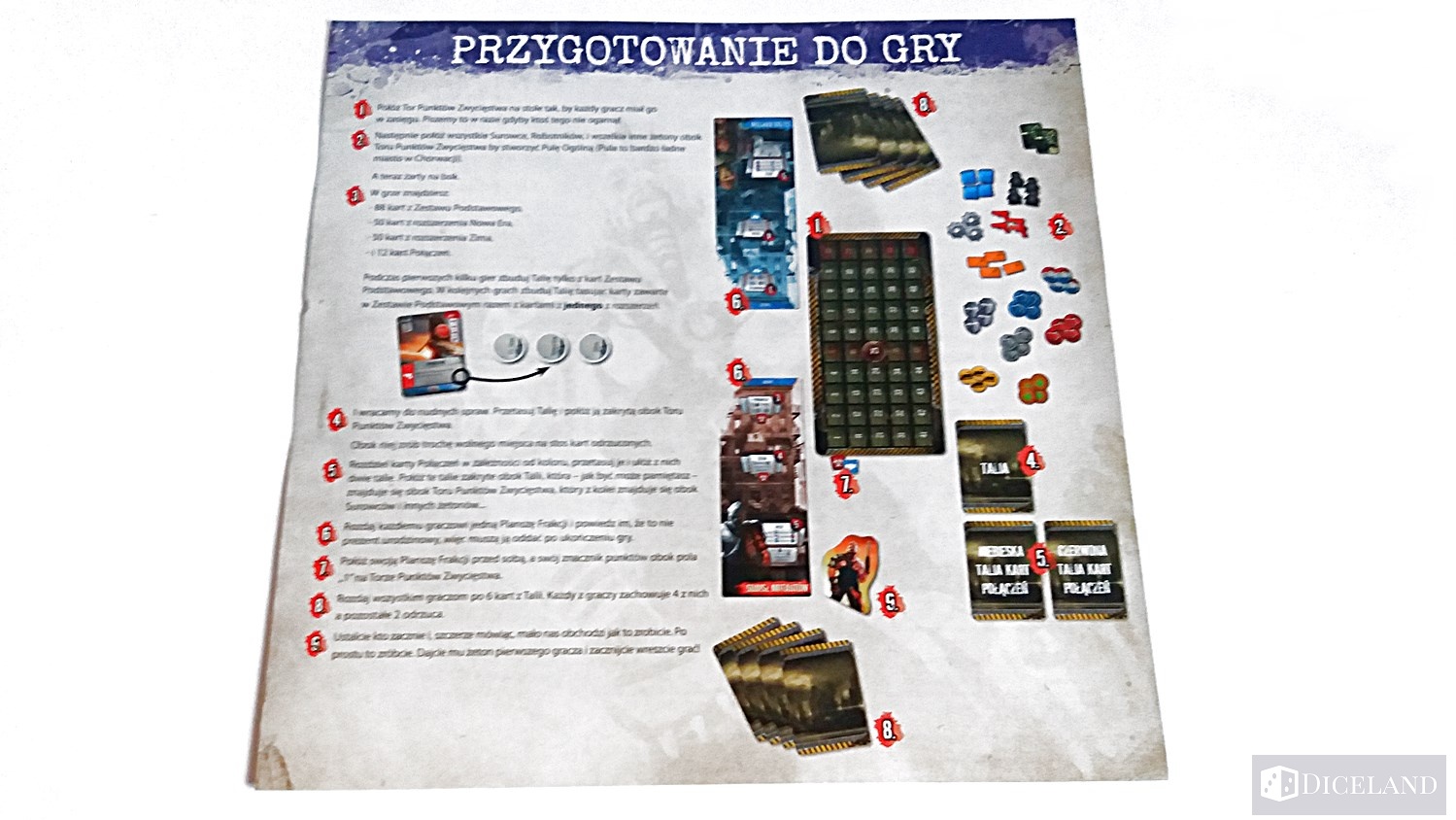 Po podpisaniu umowy z lokacją, odwracamy kartę do góry nogami i wsuwamy ją pod planszę frakcji, natomiast karty z ręki, które złupimy odrzucamy na stos kart odrzuconych. Zanim zaczniemy rozgrywkę należy przygotować talię. Na początku zaleca się korzystanie z podstawowej talii, później możemy dodawać karty z rozszerzeń (ważne by używać tylko jednego rozszerzenia w grze). Od kart należy jeszcze oddzielić karty połączeń i podzielić je na dwie zakryte talie. Wszystkie żetony i drewniane elementy umieszczamy w zasięgu graczy, układamy tor punktacji, a obok niego żetony frakcji. Każdy z graczy wybiera jedną frakcję oraz otrzymuje 6 kart z talii, z czego wybiera 4, a pozostałe dwie odrzuca na stos kart odrzuconych. Ustalacie pierwszego gracza i możecie zaczynać zabawę w tym nieprzyjaznym postnuklearnym świecie.