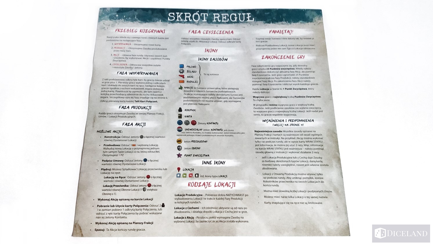 Do gry dołączona została również bardzo niewygodna karta pomocy. Nie dość, że jest ona zdecydowanie za duża, to dodatkowo wykonana jest z takiego samego papieru co instrukcja. Wydaje mi się, że lepszym rozwiązaniem byłoby umieszczenie jej w samej instrukcji gry, tym bardziej, że zawiera ona przygotowanie do gry, którego nie ma w instrukcji. Nie ukrywam, że bardzo zaskoczył mnie taki zabieg.