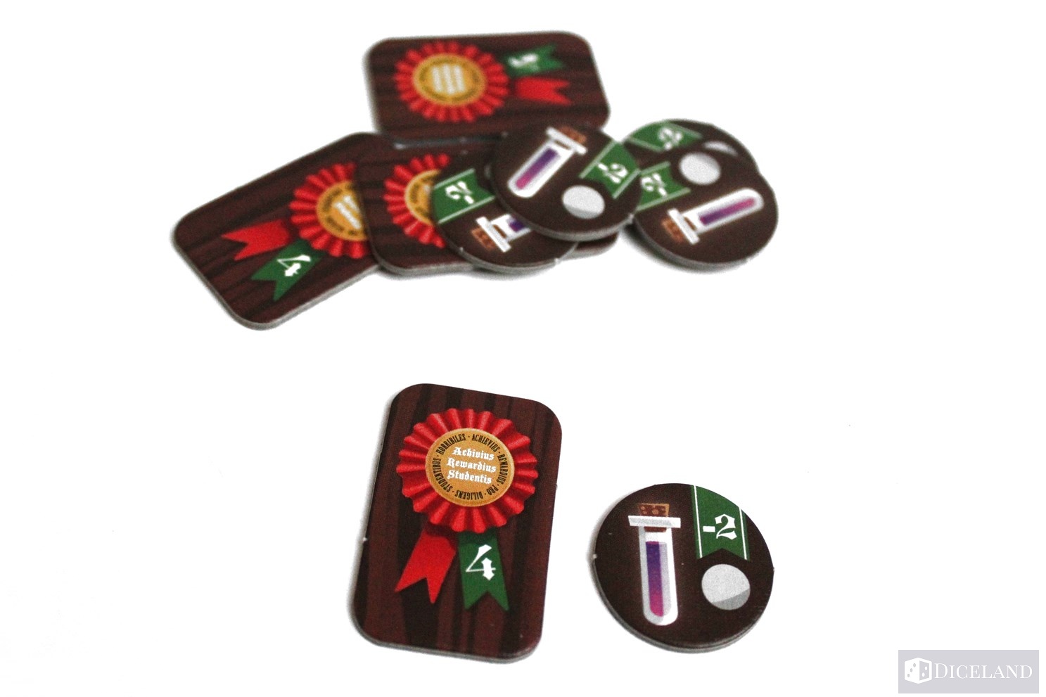 15 żetonów biegłości, które będą nam zarówno dostarczać punktów zwycięstwa, jak i determinować koniec rozgrywki. 21 żetonów drobnej pomocy pozwalających skorzystać nam z podpowiedzi naszego profesora, 4 plansze stanowiska alchemicznego oraz żeton pierwszego gracza.