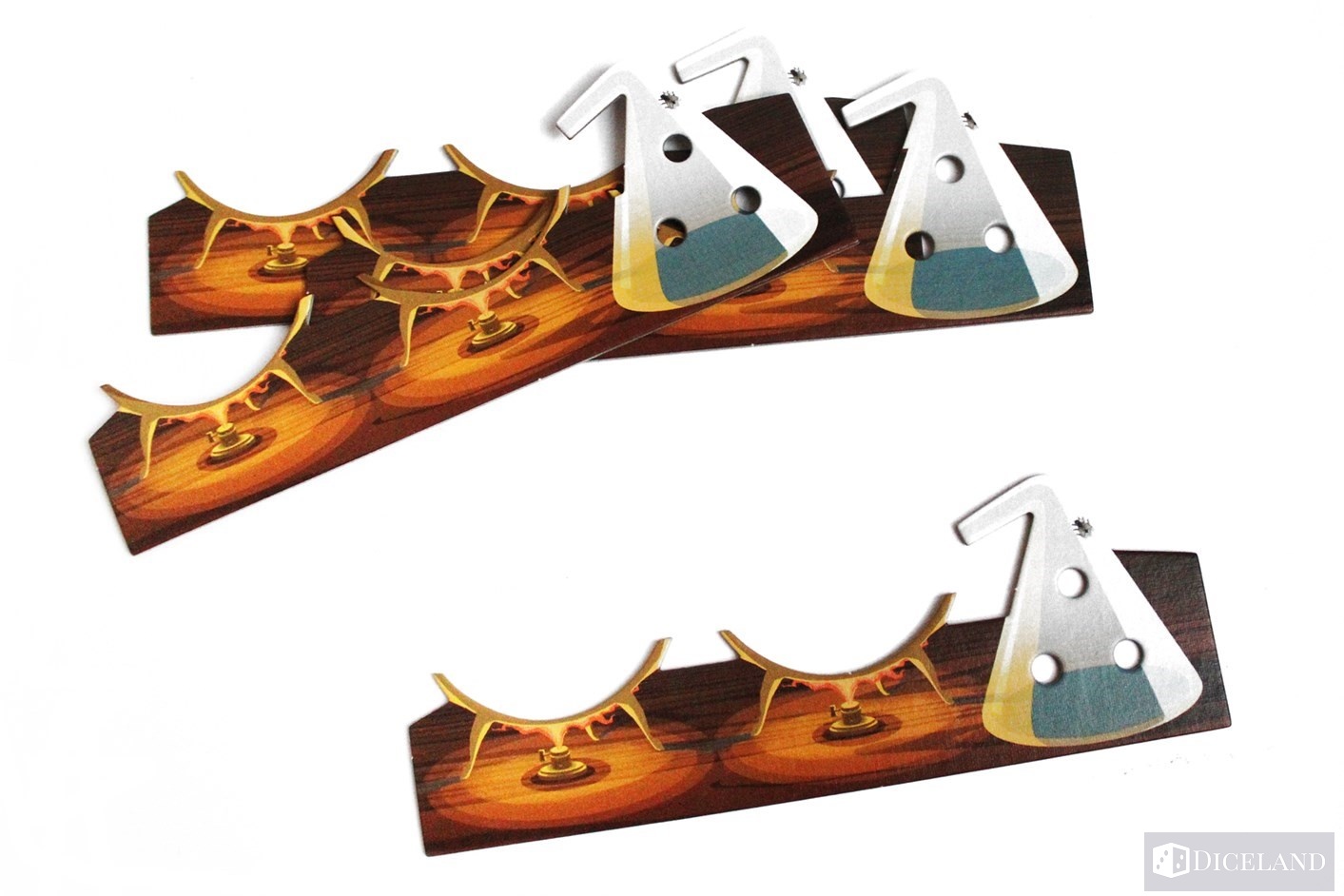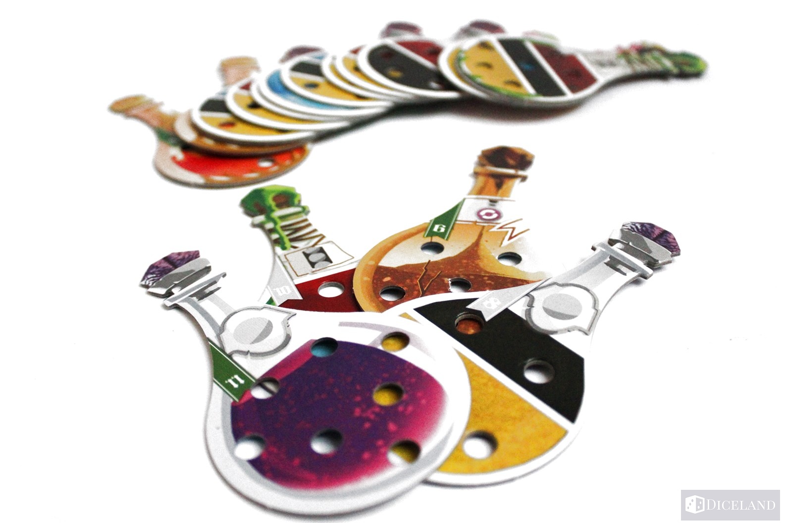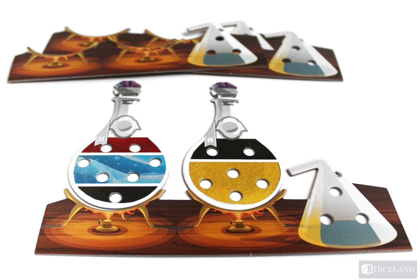 Następnie zobaczymy sporą liczbę kartonowych elementów, których wyciśnięcie z arkuszy zajmie nam chwilę. W ich skład wchodzą: 64 płytki eliksirów, które podzielone są na 8 różnych rodzajów. Każdy z nich daje nam inną umiejętność jednorazową po jego wypiciu. Na każdej płytce znajdziemy z jednej strony ilustrację zawartości oraz z drugiej podział na kolory ingrediencji, jakich będzie trzeba użyć aby dany eliksir uwarzyć. Płytki eliksirów posiadają otwory, w których będziemy mogli umieszczać zdobyte składniki.