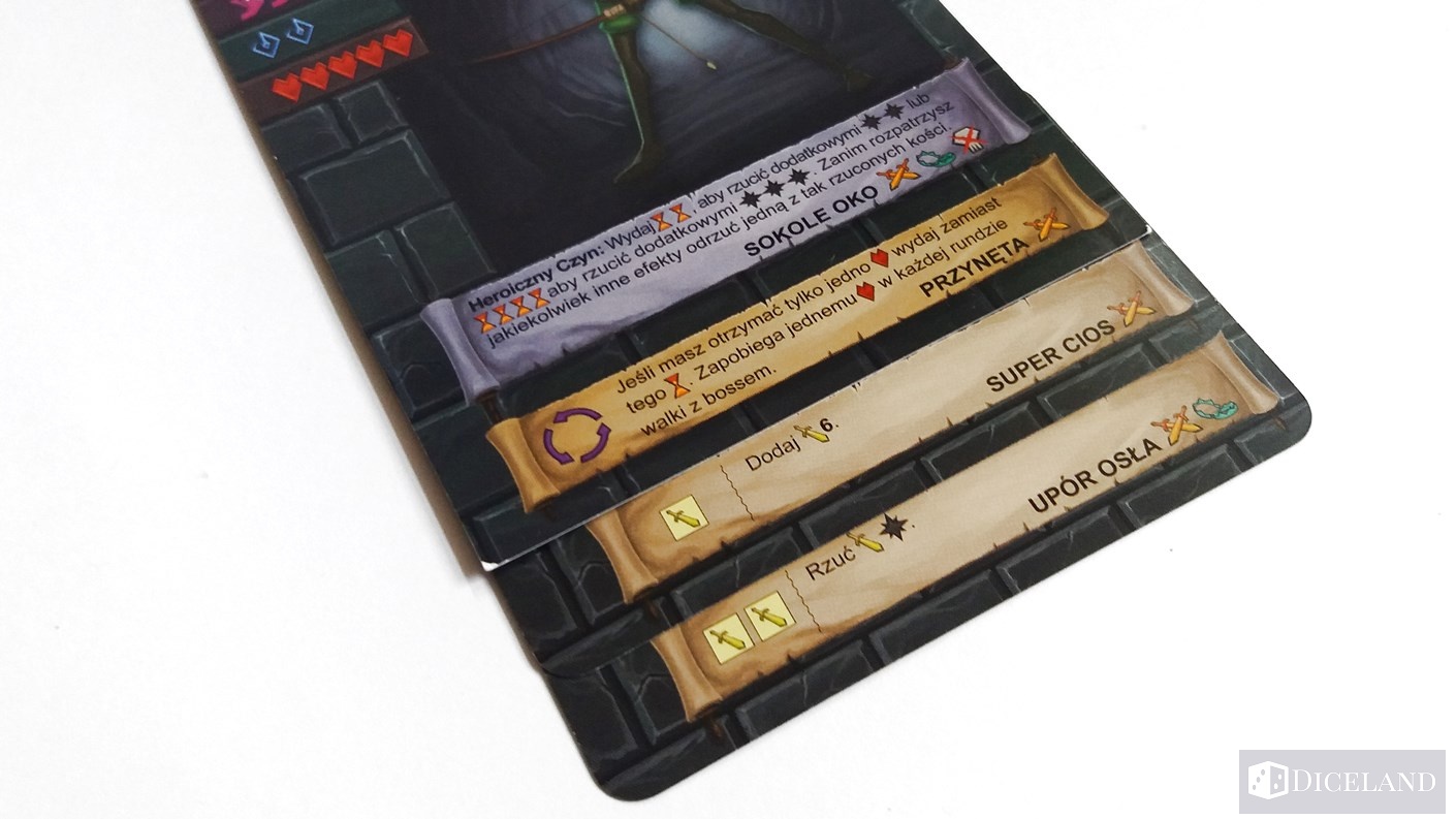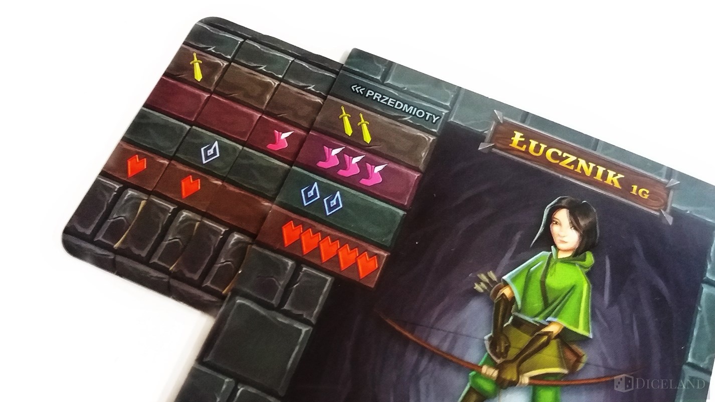 - Przedmioty: to nowe wyposażenie naszego bohatera. Podnoszą one nasze statystyki, dzięki czemu będziemy mogli używać większej liczby kości. Karty te będziemy wsuwać po lewej stronie naszej postaci. Jednoczesna liczba przedmiotów jest ograniczona przez poziom bohatera, im wyższy tym więcej jesteśmy w stanie unieść.