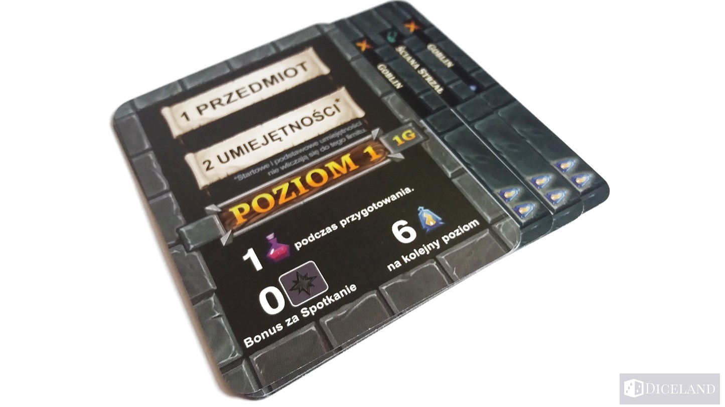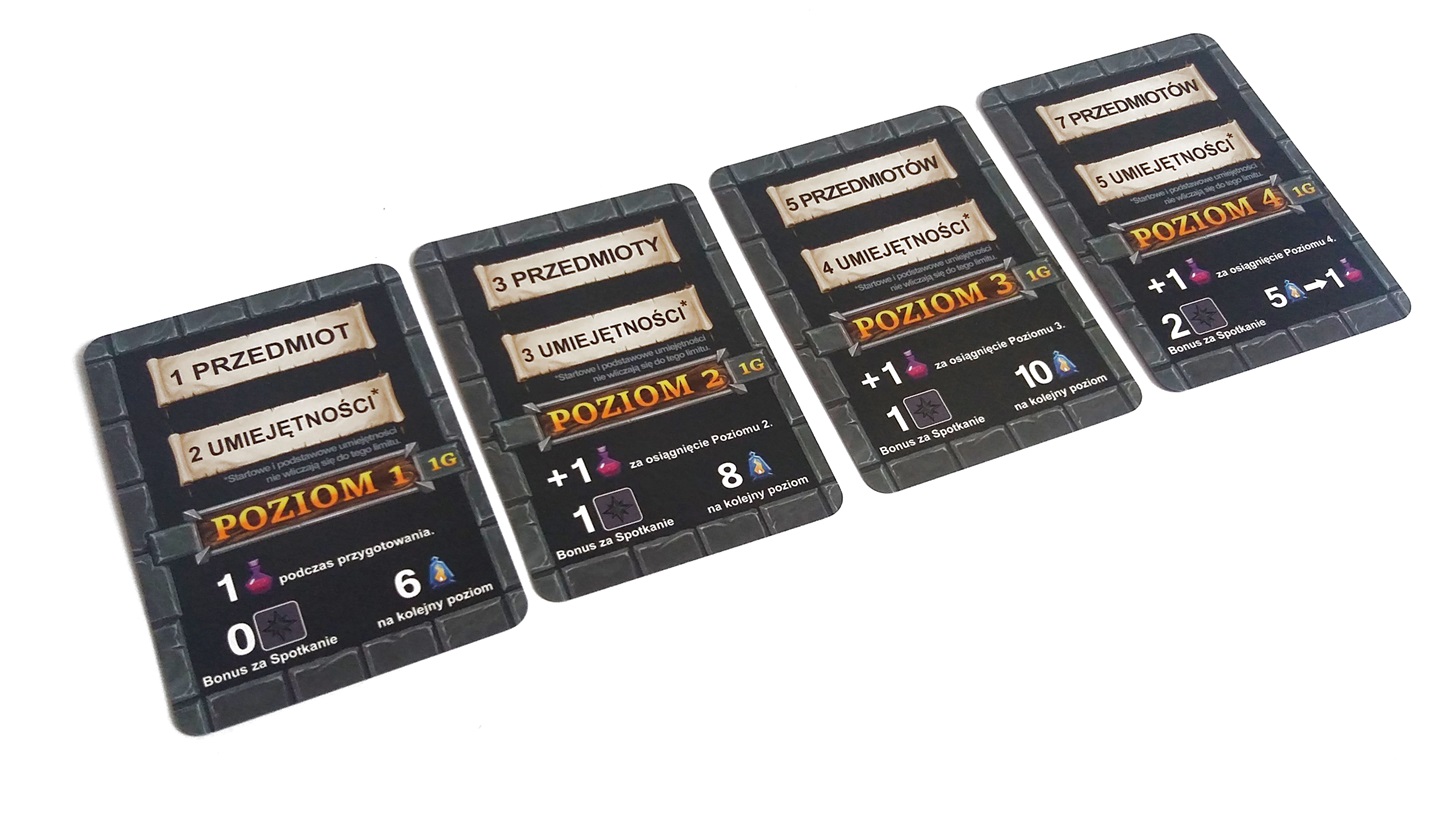 - Punkty doświadczenia – na każdej karcie widnieje odpowiednia liczba ikonek doświadczenia. Wsuwamy je z prawej strony karty poziomu i gdy tylko uda nam się osiągnąć wymaganą liczbę ikonek do awansu, to karty doświadczenia odrzucamy i odkrywamy kolejną kartę poziomu. Jednocześnie zwiększają się nasze zdolności. Możemy unieść więcej przedmiotów, opanować więcej czarów, otrzymać dodatkowe czarne kości podczas spotkań, a także każdorazowo przy awansie otrzymać jedną dodatkową miksturę do wykorzystania.