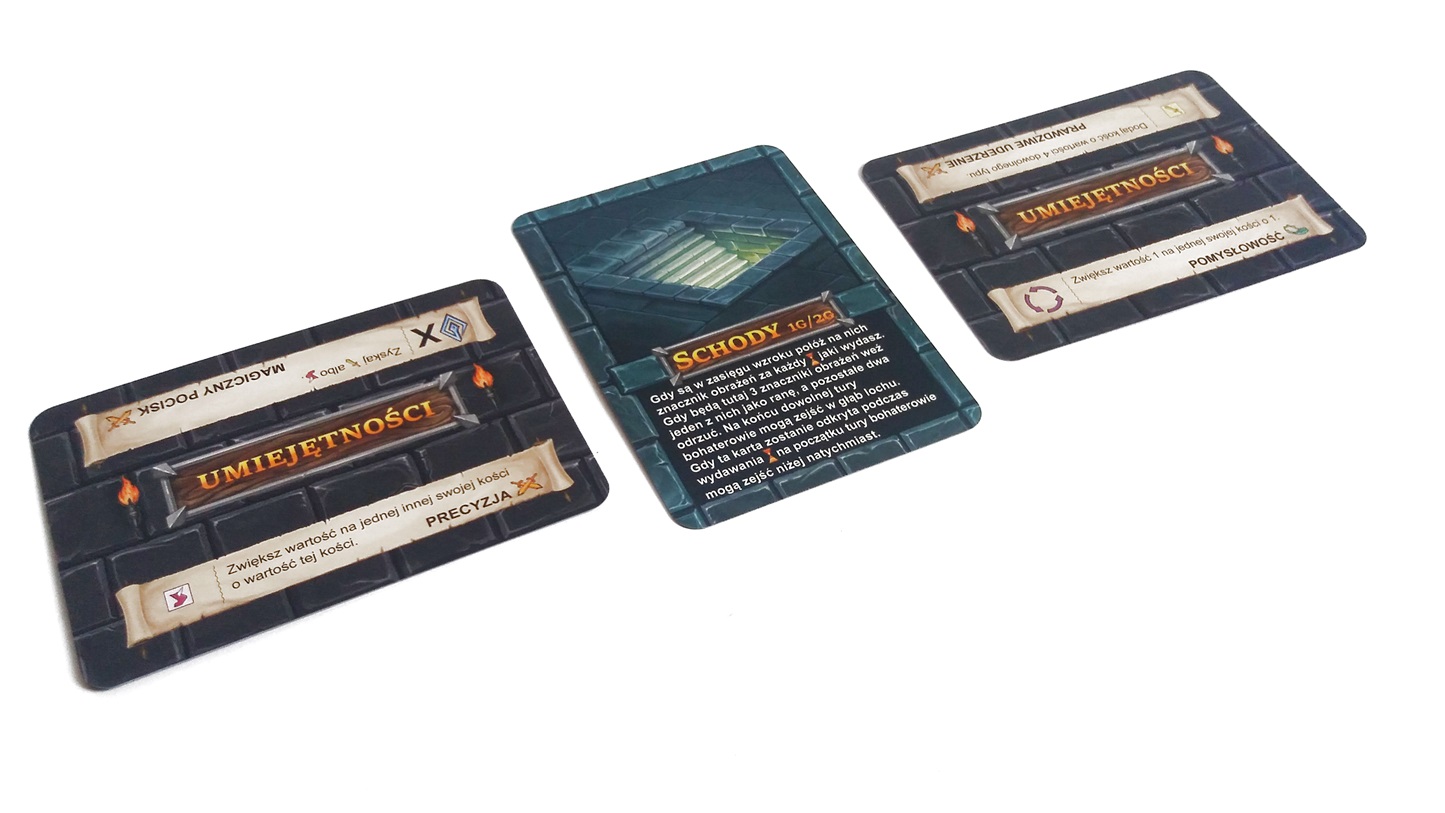 Na koniec mamy: 4 karty poziomów, 2 karty podstawowych umiejętności oraz jedną kartę schodów.
