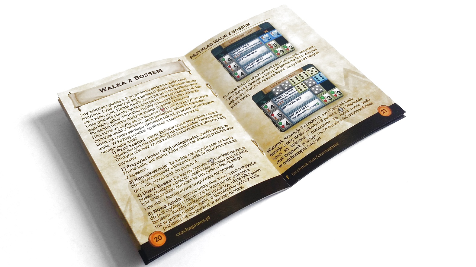 Jedna dwustronna bardzo przydatna i dobrze napisana karta pomocy. Na jednej stronie zawiera opis naszej tury, a na drugiej opis walki z bossem.