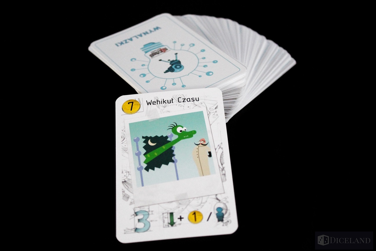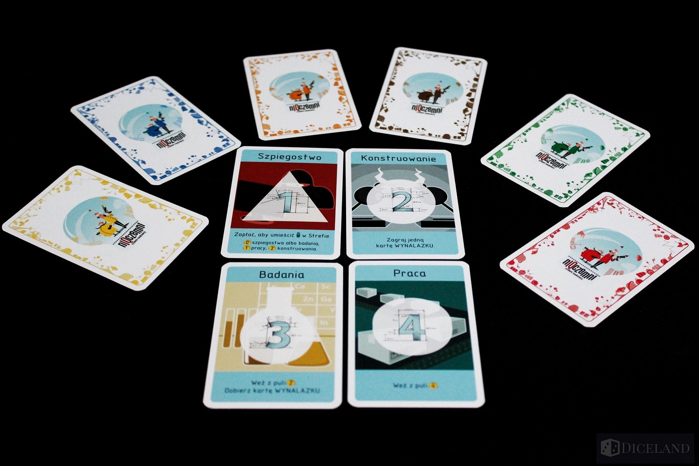 Do tych kart zaliczamy: karty wynalazków, które symbolizują nasze niqczemne pomysły oraz większe karty konwersji, modyfikujące nieco zasady każdej partii. Znajdziemy także karty akcji w 6 kolorach, po cztery dla każdego gracza.