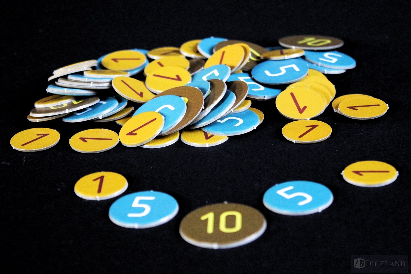 Ostatnimi elementami będą żetony monet oraz drewniane figurki naszych szpiegów, po pięciu w każdym z 6 kolorów.
