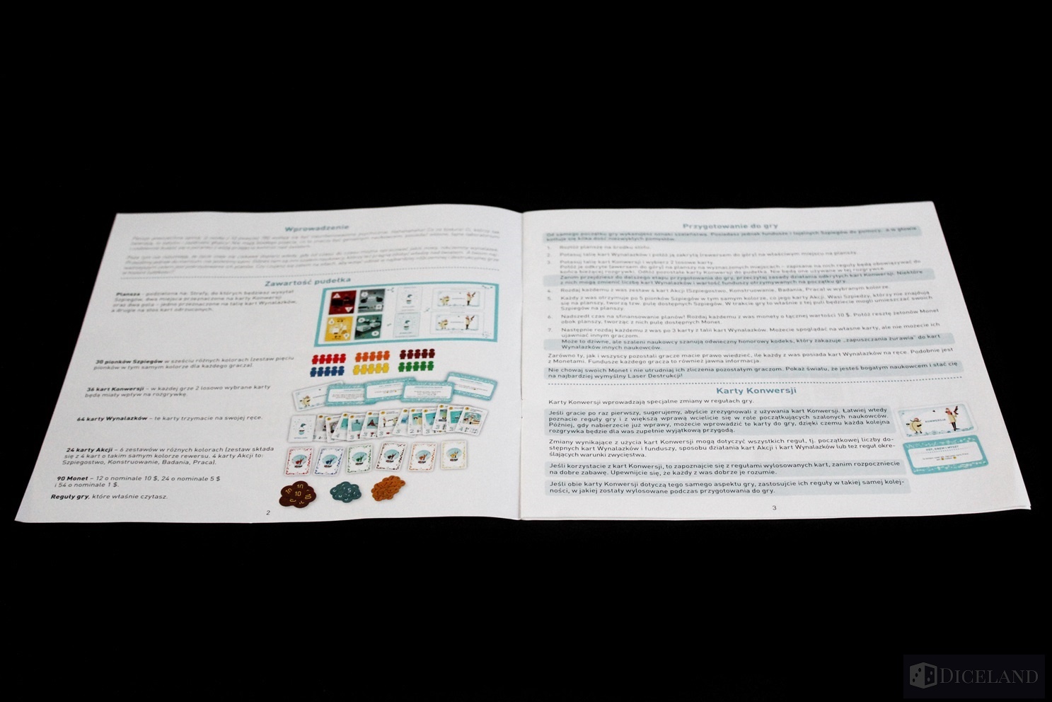 W niedużym pudełku z grą znajdziemy całkiem sporą liczbę elementów. Jako pierwsza naszym oczom ukaże się instrukcja. Jest ona napisana przejrzyście, z dozą humoru i nie pozostawia wątpliwości co do zasad gry.